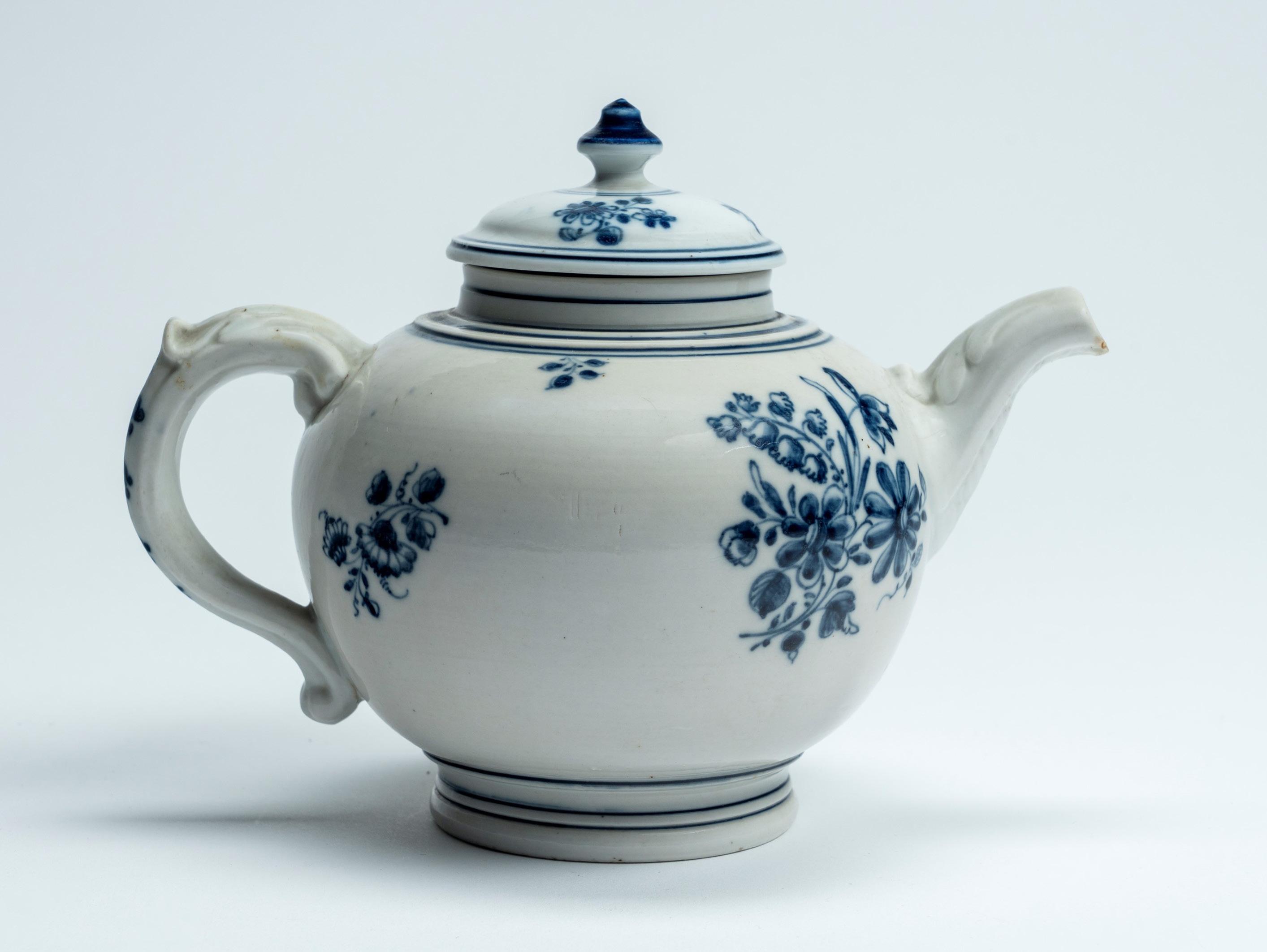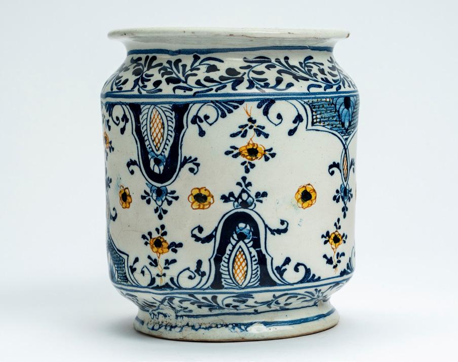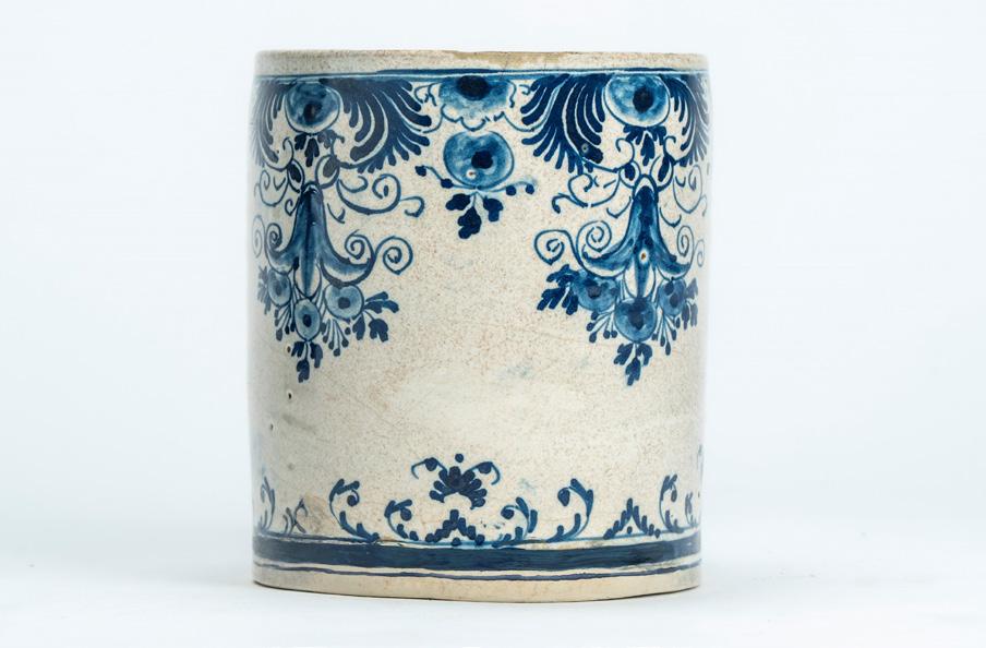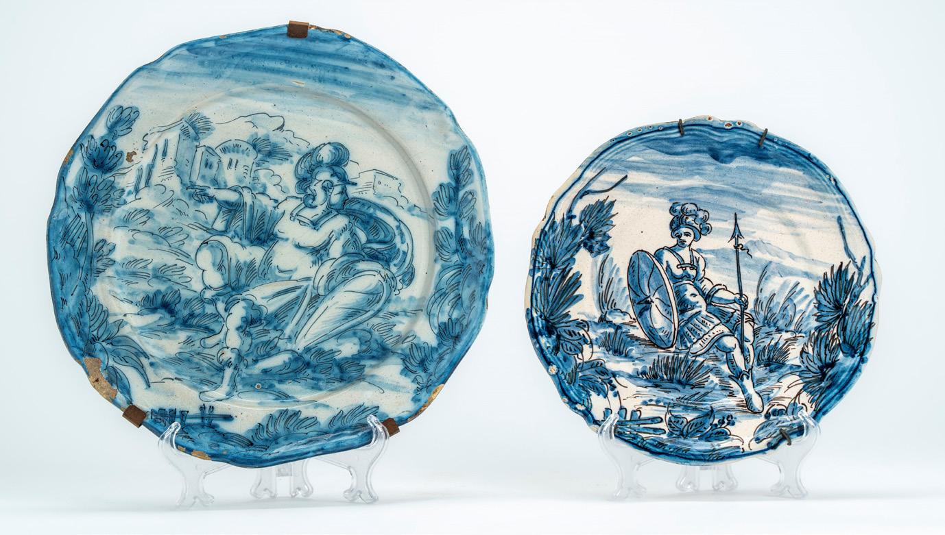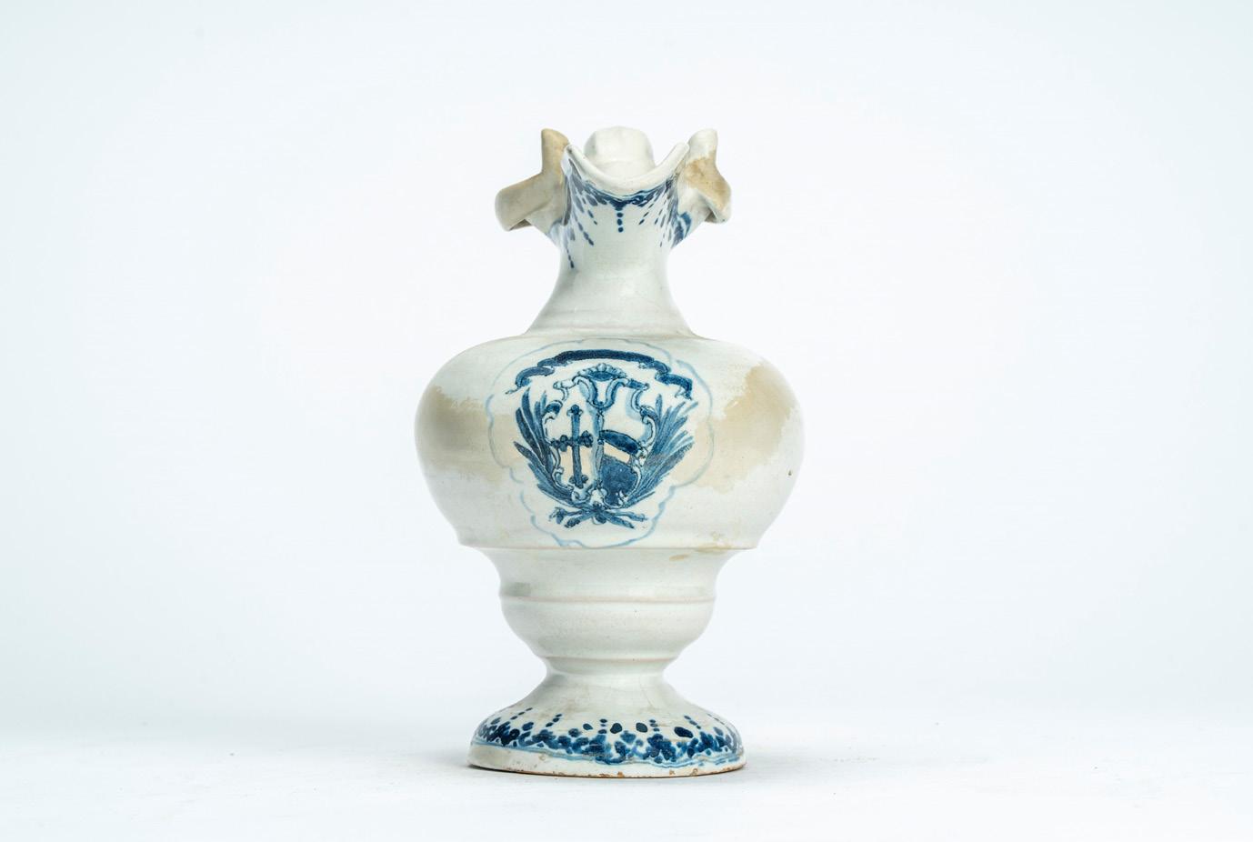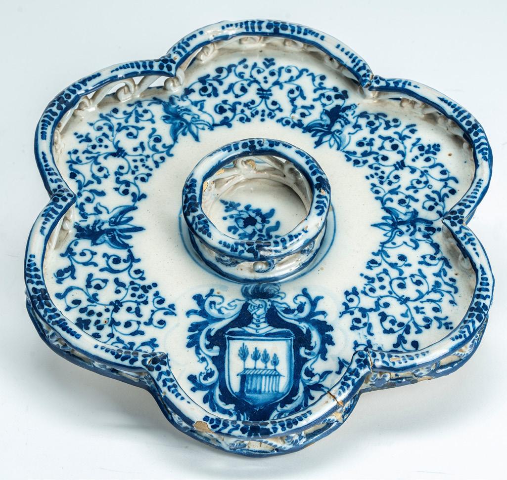 Alzata esalobata con ringhiera traforata in maiolica decorata in monocromia blu cobalto a volute fogliate e stemma. Manifattura di Savona o Albissola, secolo XVIII