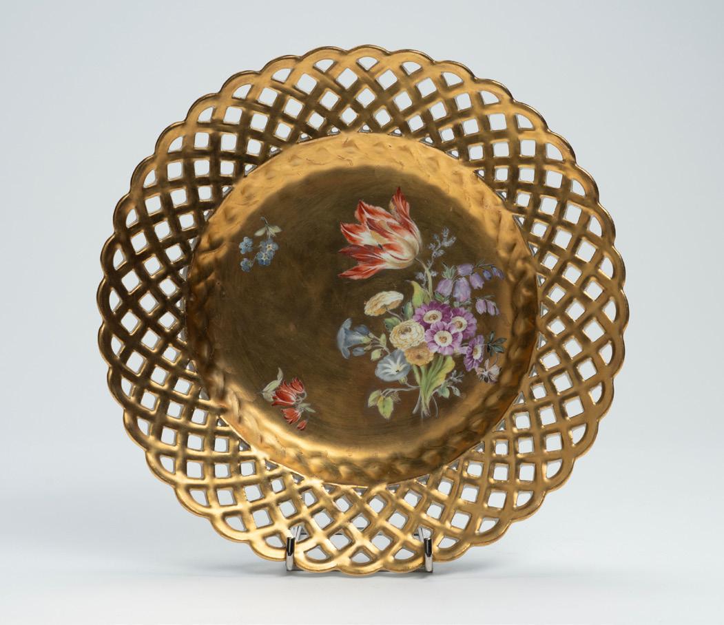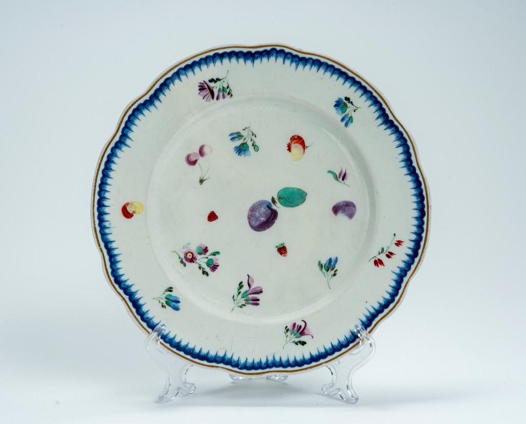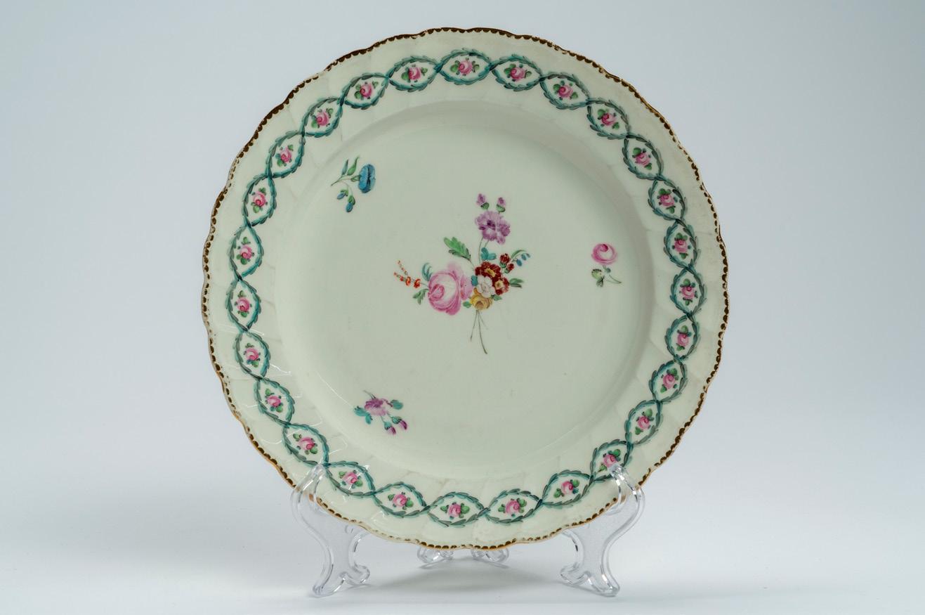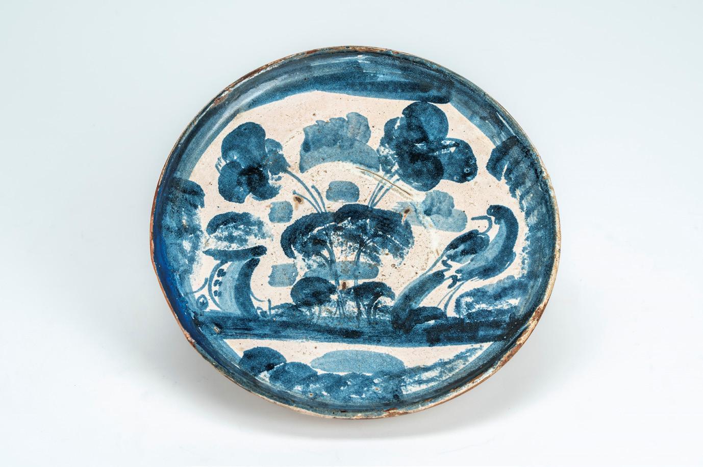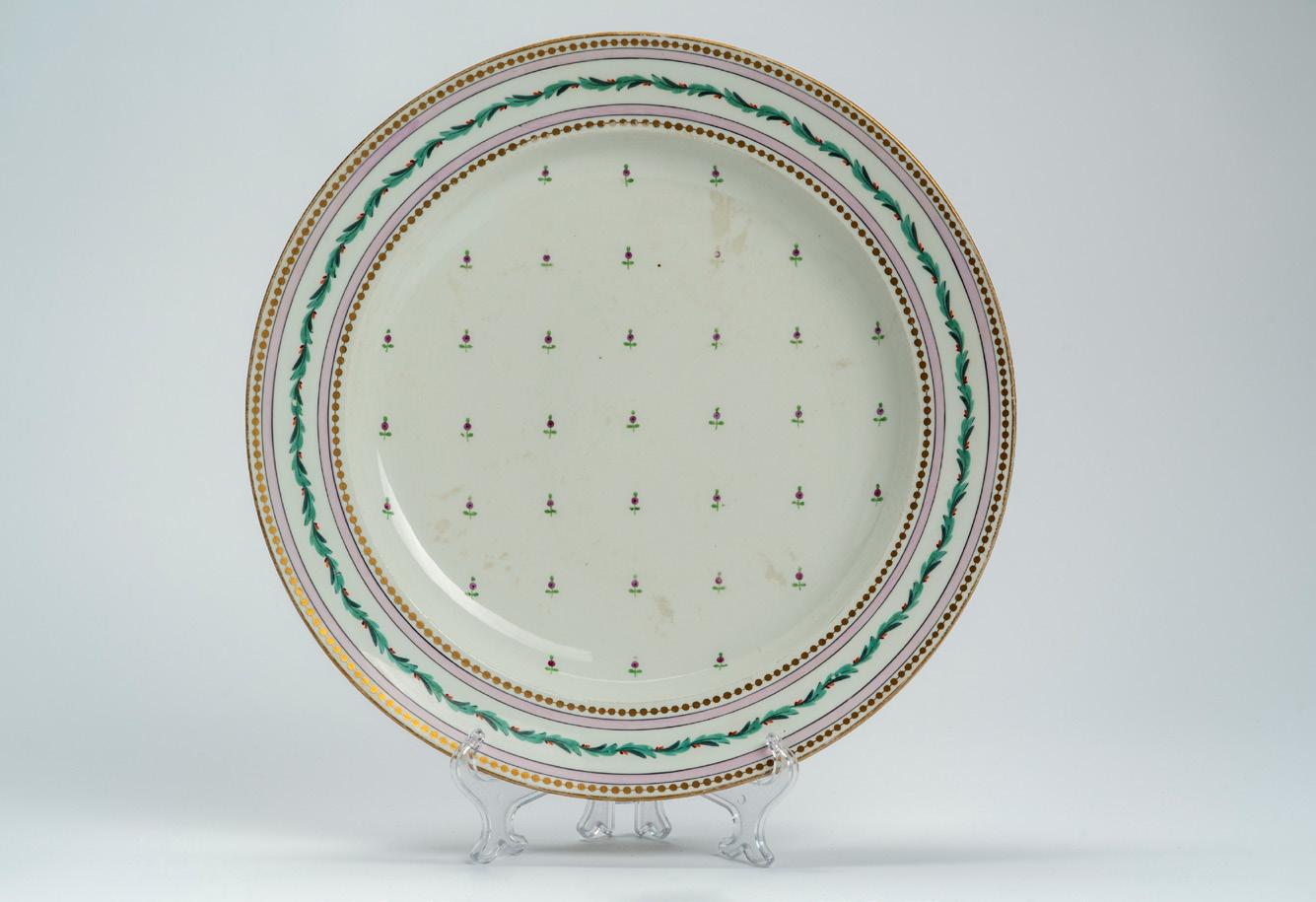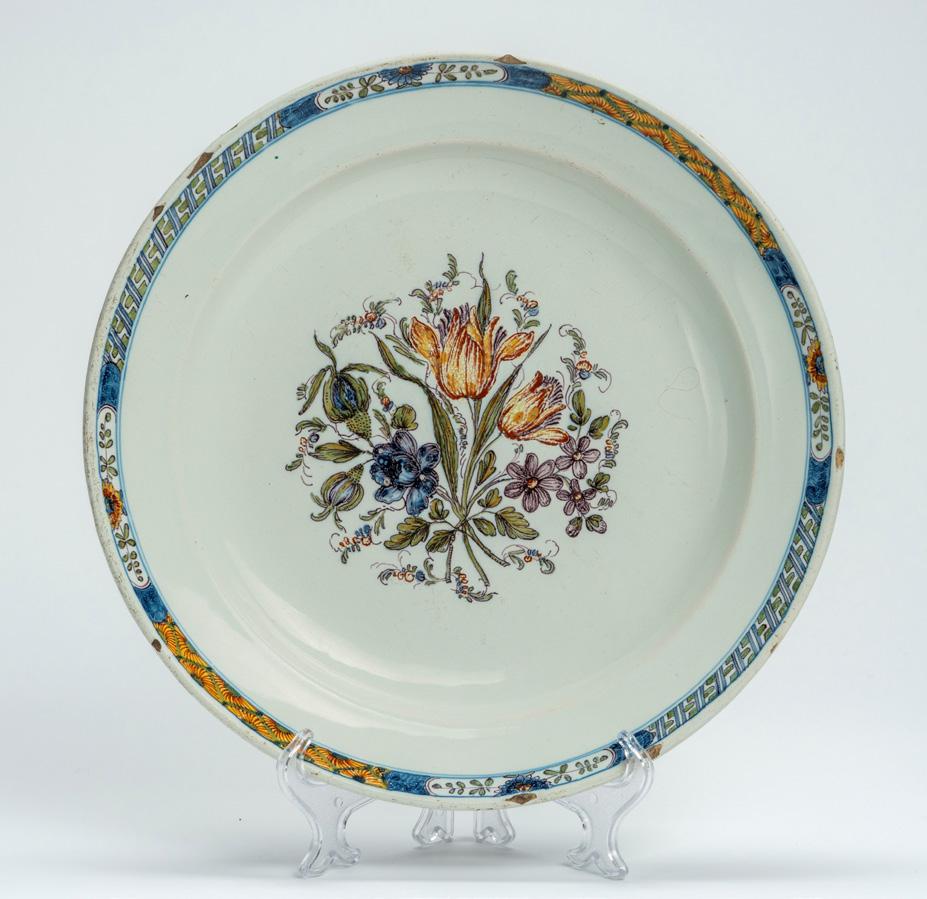 Tesa a rilievo decorata a festoni di fiori e foglie, suddivisa in quattro settori da segmenti radiali in rosso porpora. Al centro del cavetto, decoro a piccolo fuoco con motivo “a giardinetto”: ponticello reso in rosso porpora al posto del tradizionale verde muschio, staccionata a graticci romboidali che sorregge un vaso biansato, una palma, con sullo sfondo un filare di cipressi e, al centro, un ombrello parasole tipico dell’ultimo quarto del Settecento, periodo di gestione della fabbrica novese da parte di Giovanni Maria Baccin.