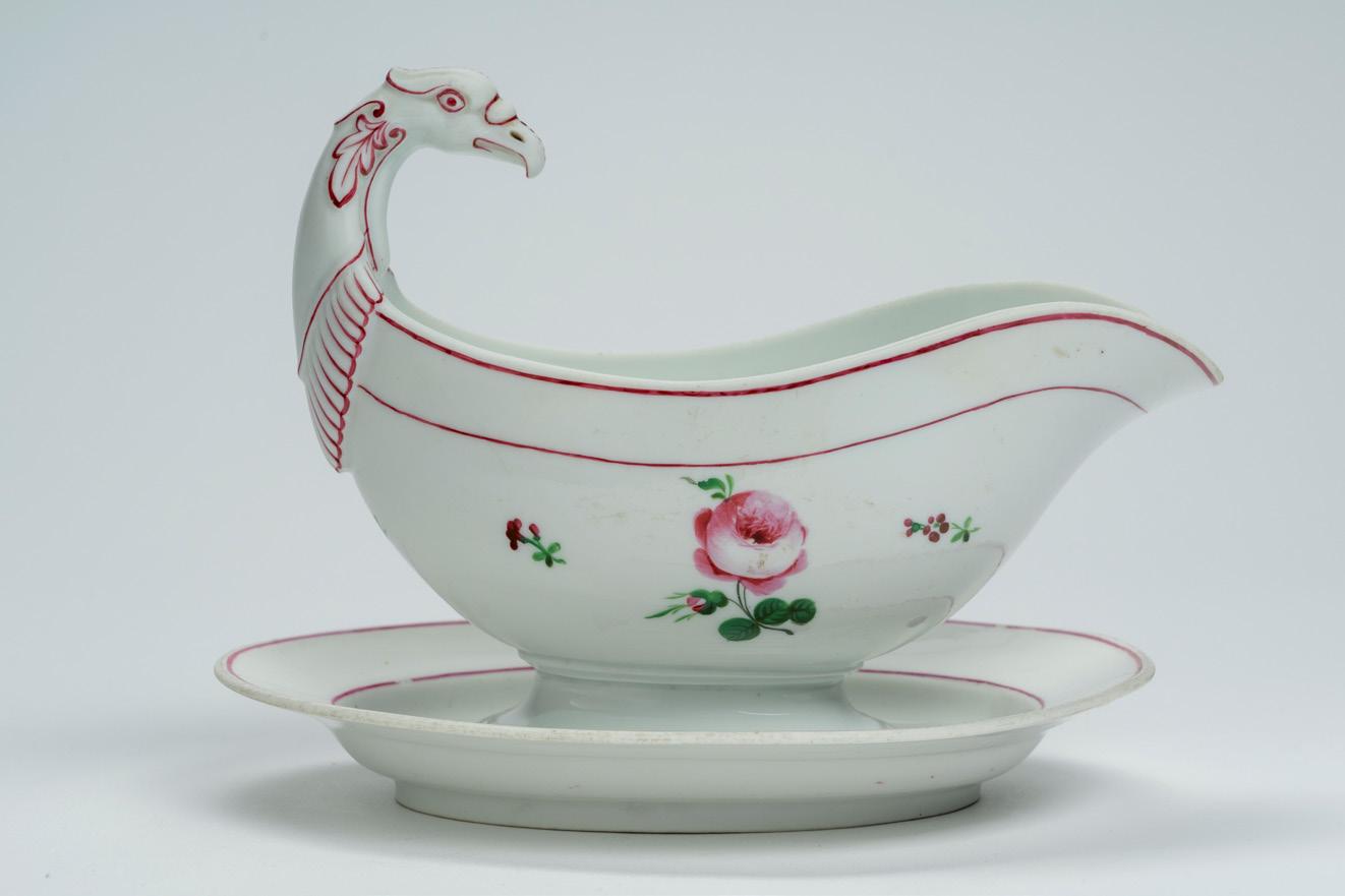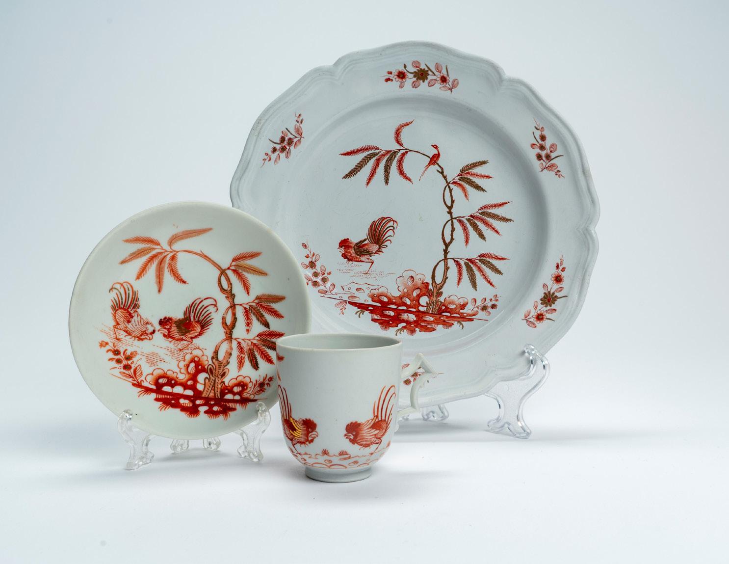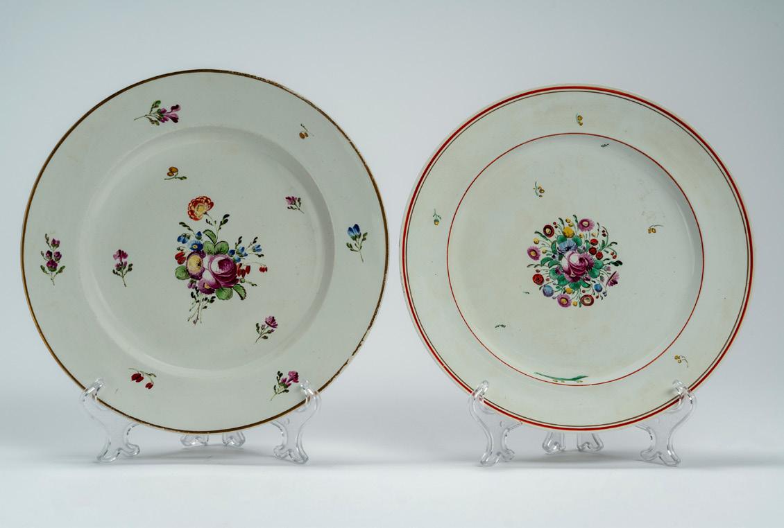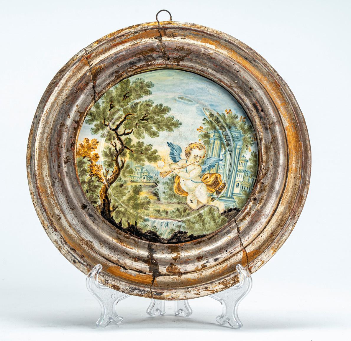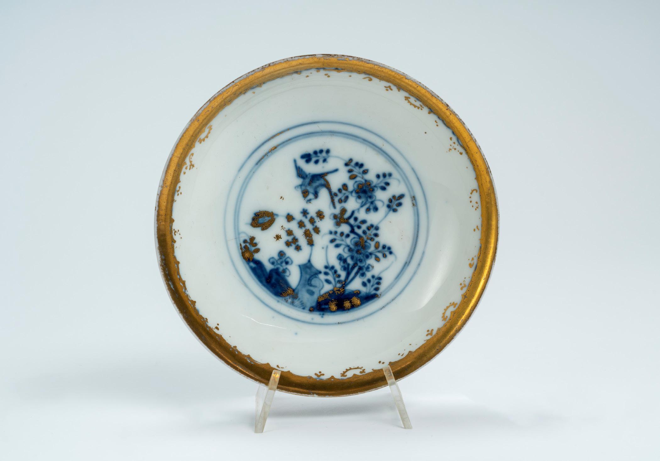 Tesa a rilievo decorata a festoni di fiori e foglie, suddivisa in quattro settori da segmenti radiali in rosso porpora. Al centro del cavetto, decoro a piccolo fuoco con motivo “a giardinetto”: ponticello reso in rosso porpora al posto del tradizionale verde muschio, staccionata a graticci romboidali che sorregge un vaso biansato, una palma, con sullo sfondo un filare di cipressi e, al centro, un ombrello parasole tipico dell’ultimo quarto del Settecento, periodo di gestione della fabbrica novese da parte di Giovanni Maria Baccin.