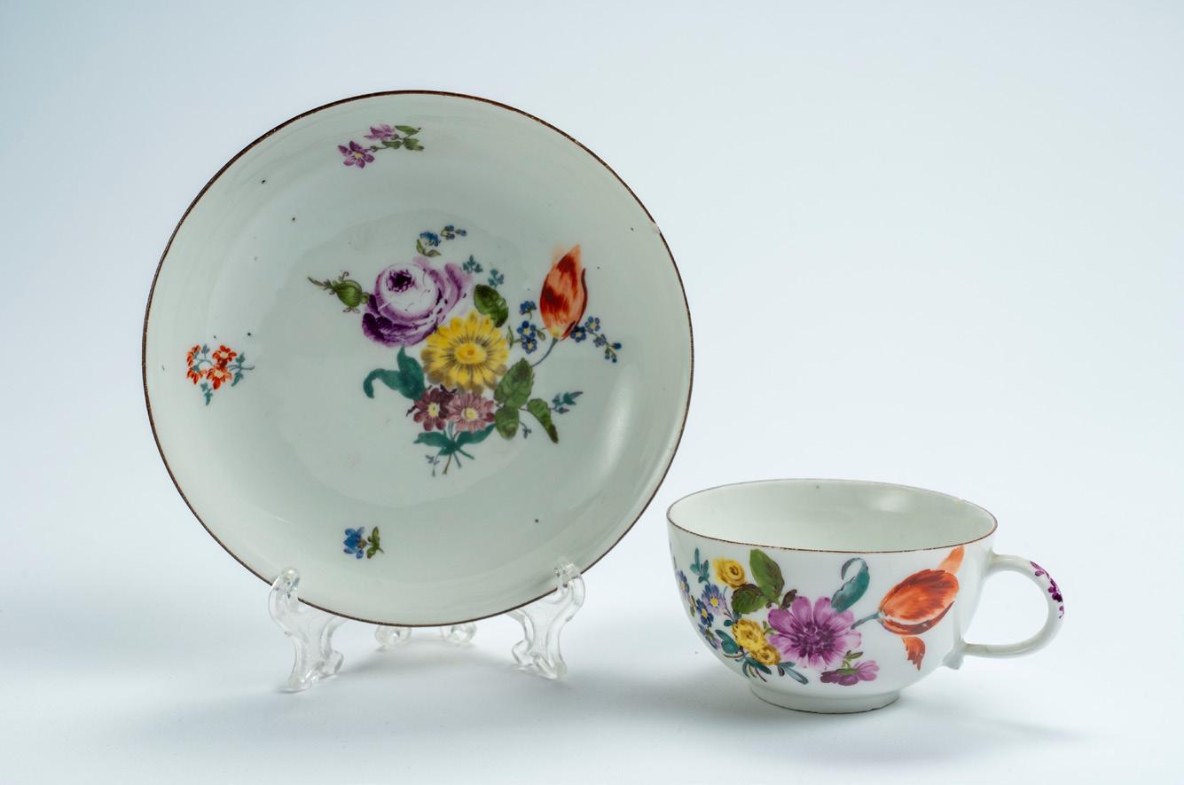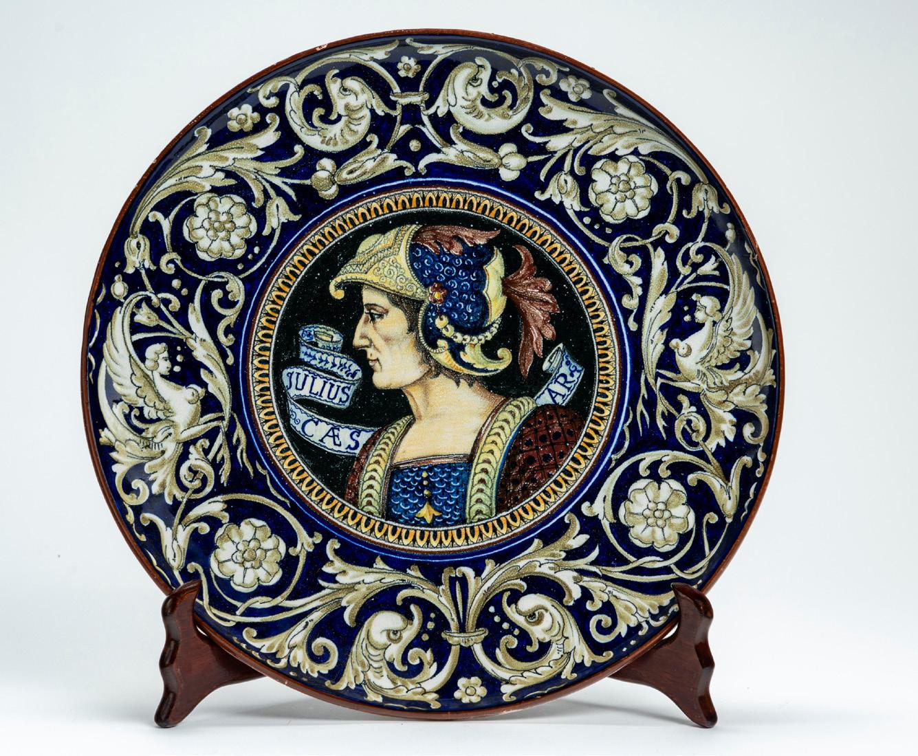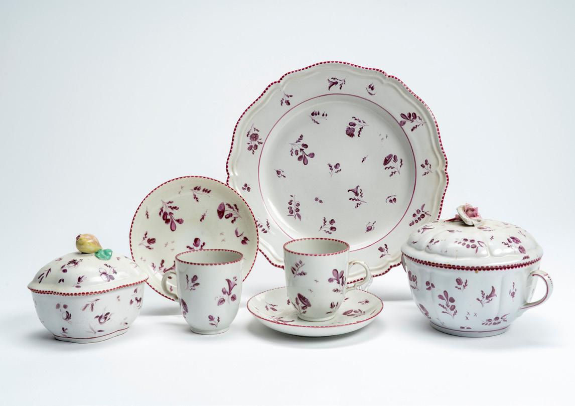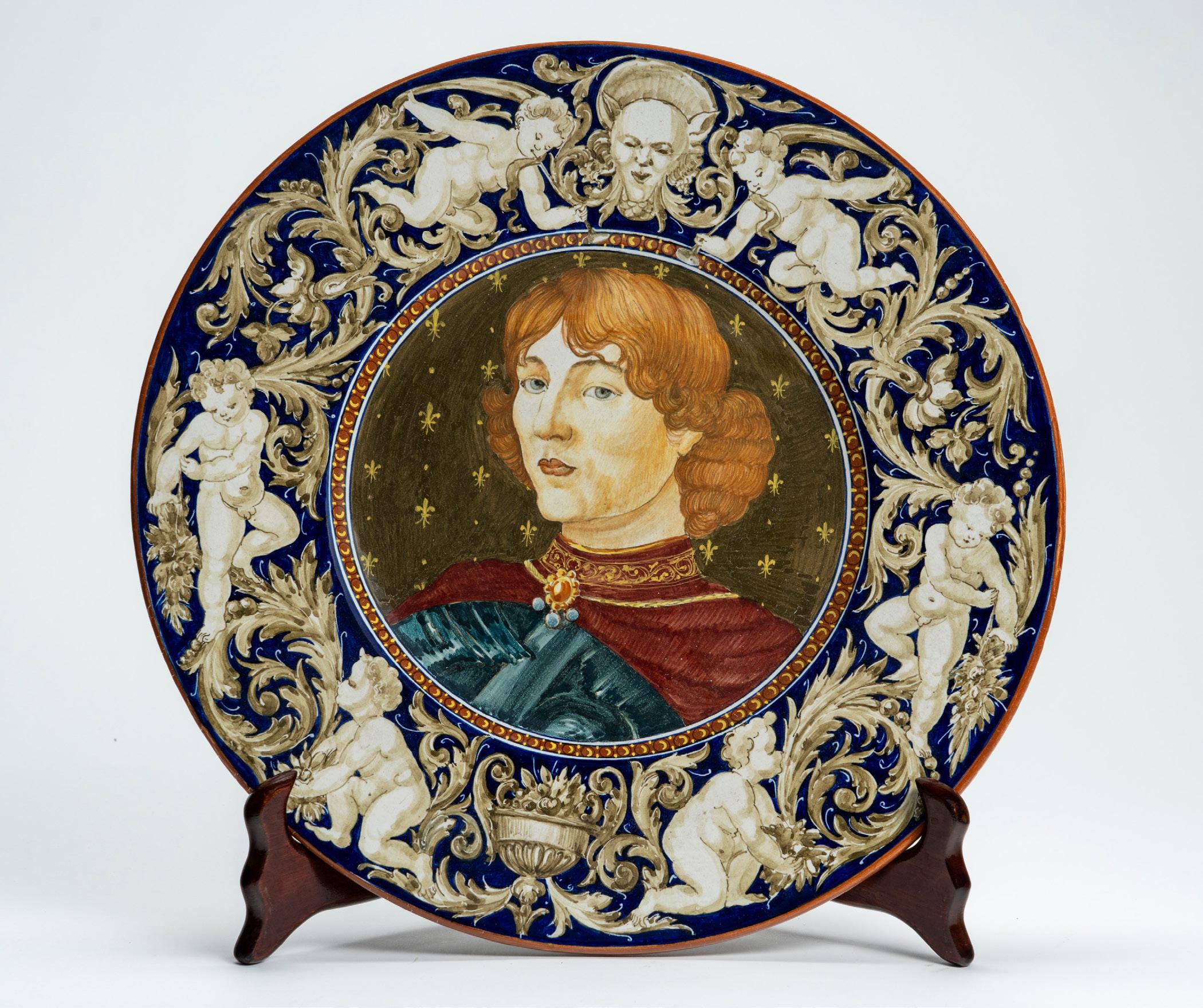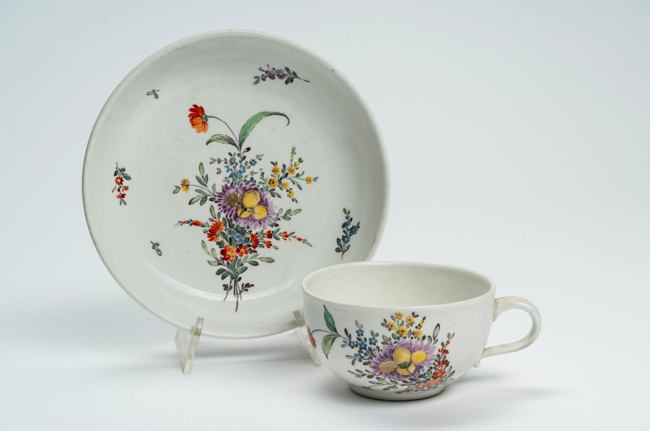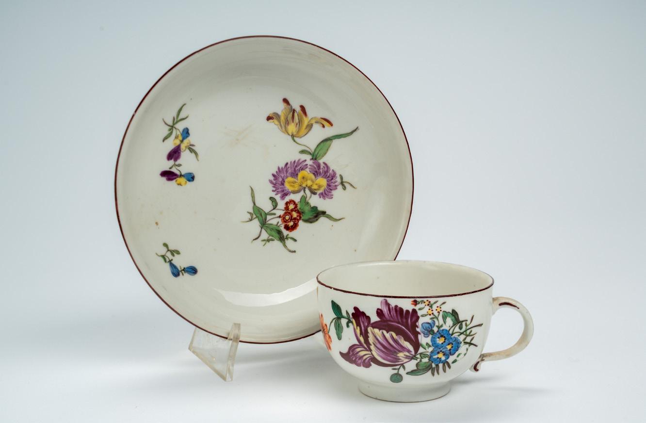 Tesa a rilievo decorata a festoni di fiori e foglie, suddivisa in quattro settori da segmenti radiali in rosso porpora. Al centro del cavetto, decoro a piccolo fuoco con motivo “a giardinetto”: ponticello reso in rosso porpora al posto del tradizionale verde muschio, staccionata a graticci romboidali che sorregge un vaso biansato, una palma, con sullo sfondo un filare di cipressi e, al centro, un ombrello parasole tipico dell’ultimo quarto del Settecento, periodo di gestione della fabbrica novese da parte di Giovanni Maria Baccin.