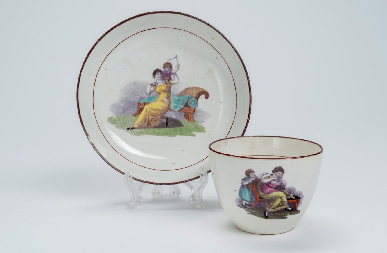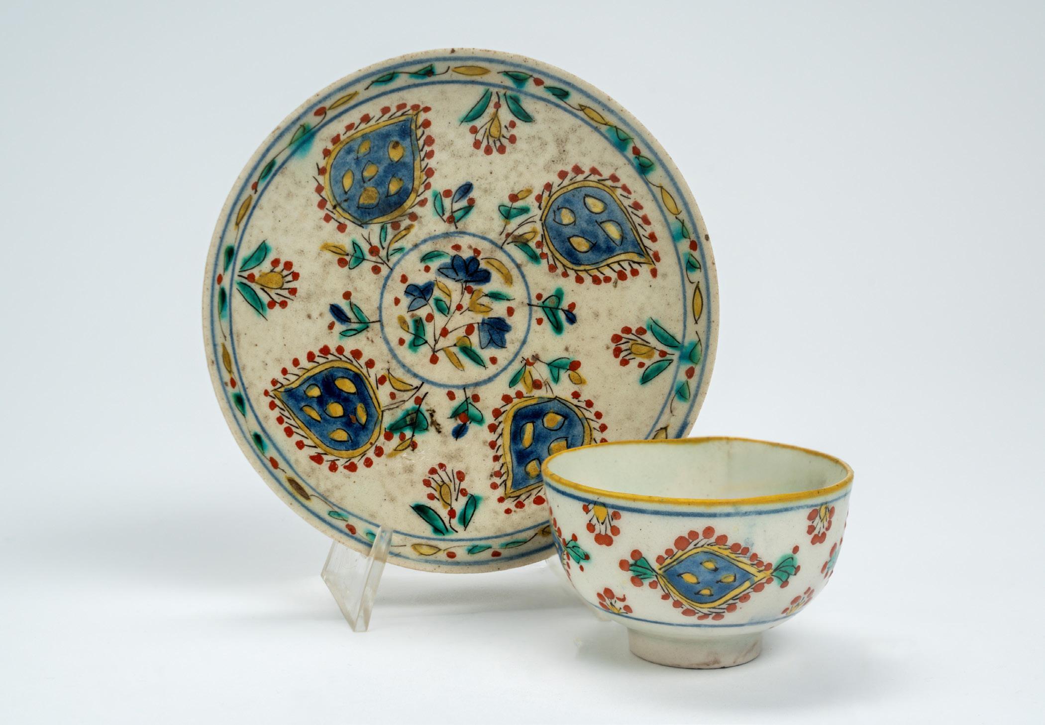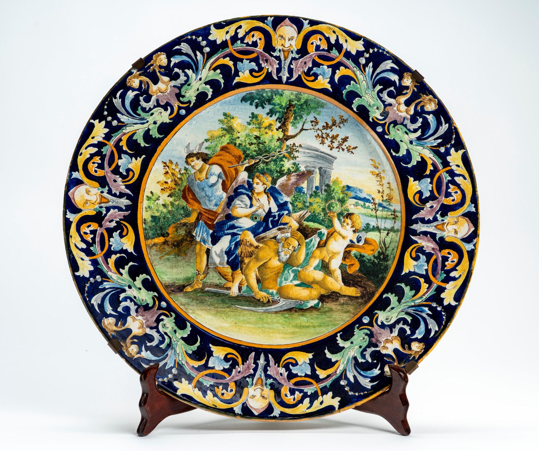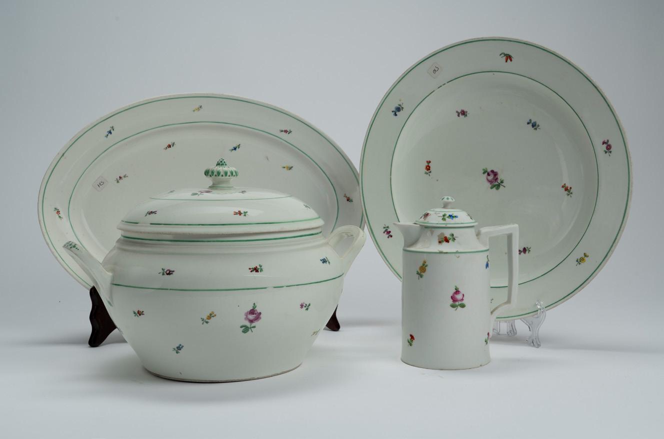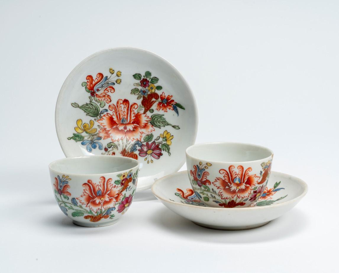 Tesa a rilievo decorata a festoni di fiori e foglie, suddivisa in quattro settori da segmenti radiali in rosso porpora. Al centro del cavetto, decoro a piccolo fuoco con motivo “a giardinetto”: ponticello reso in rosso porpora al posto del tradizionale verde muschio, staccionata a graticci romboidali che sorregge un vaso biansato, una palma, con sullo sfondo un filare di cipressi e, al centro, un ombrello parasole tipico dell’ultimo quarto del Settecento, periodo di gestione della fabbrica novese da parte di Giovanni Maria Baccin.
