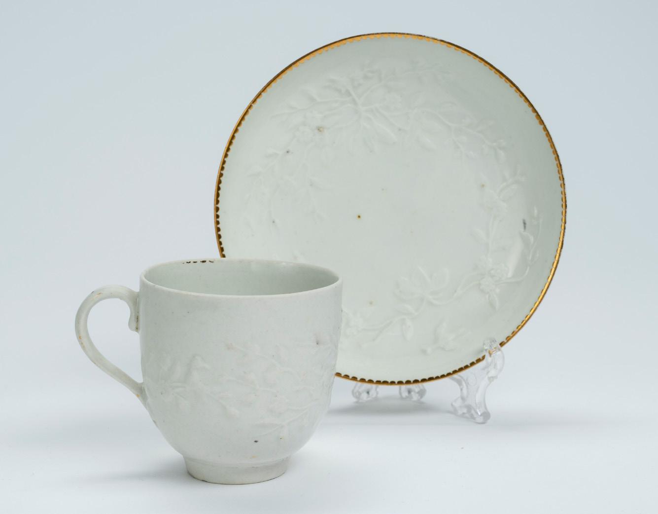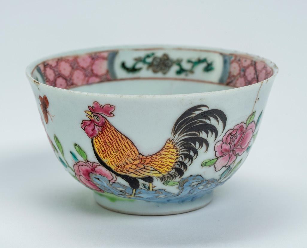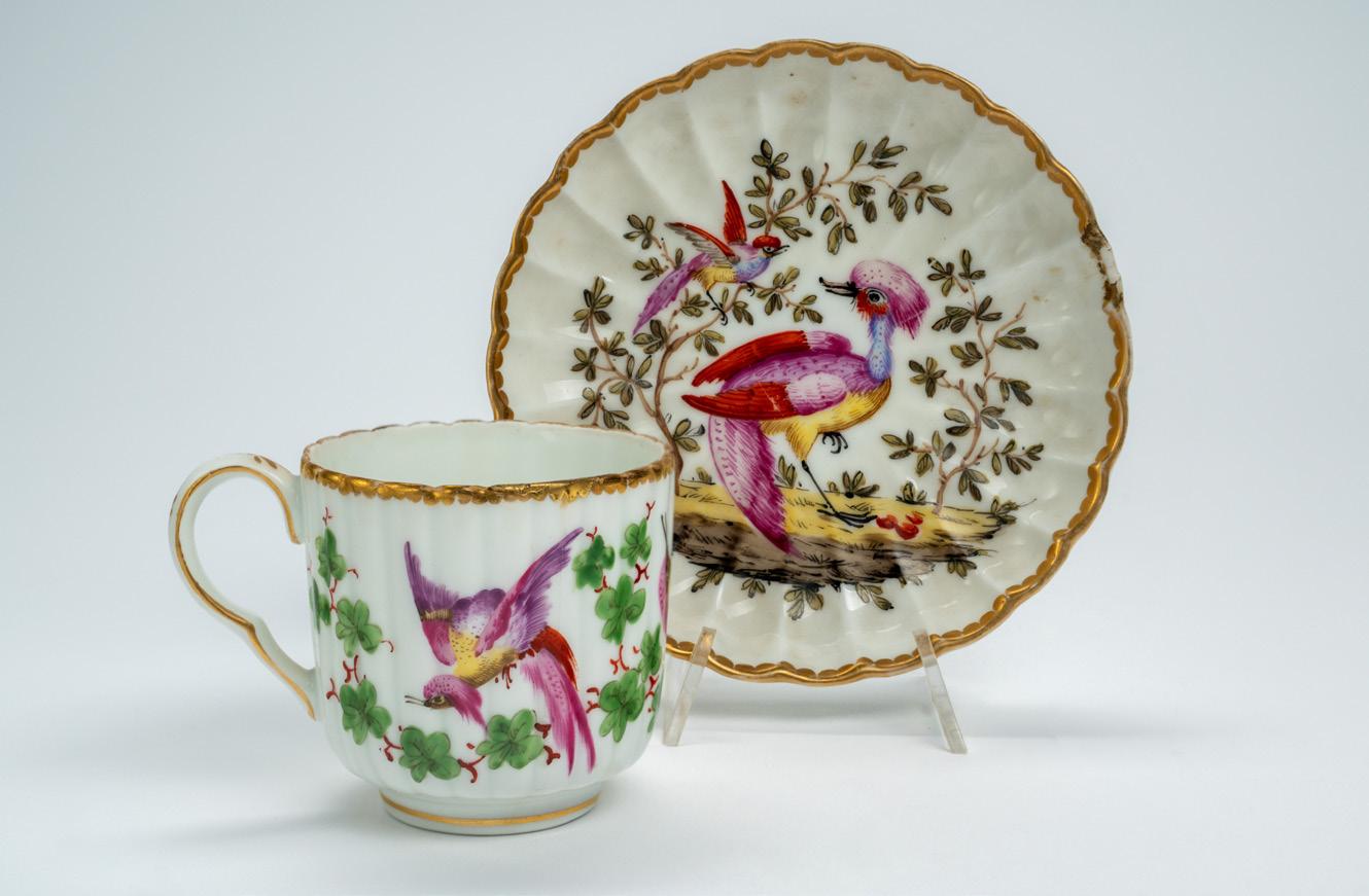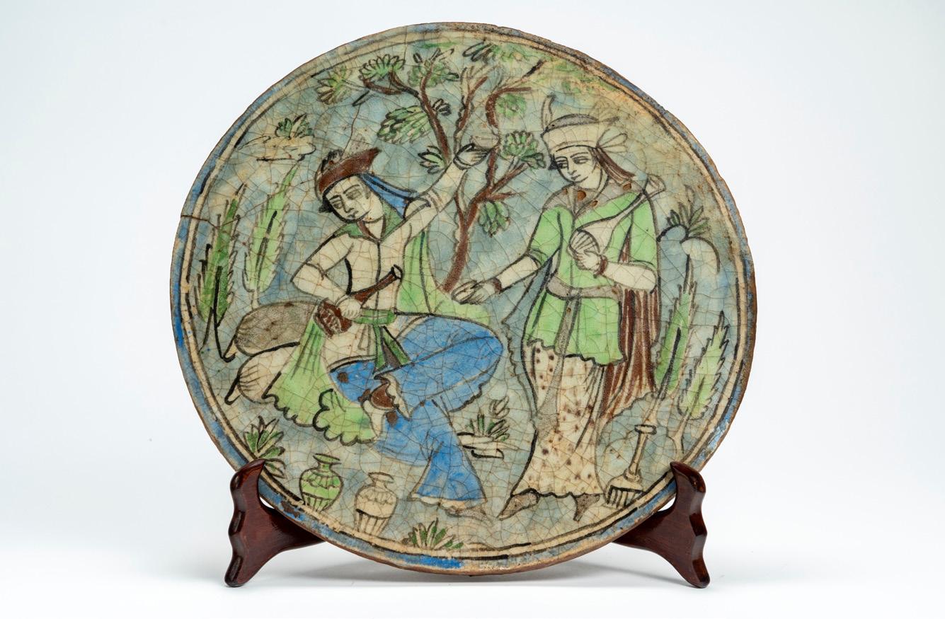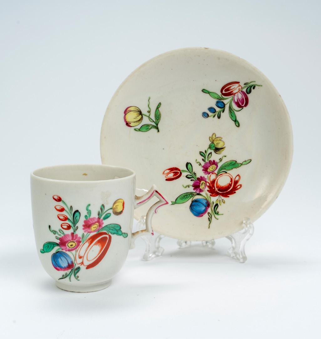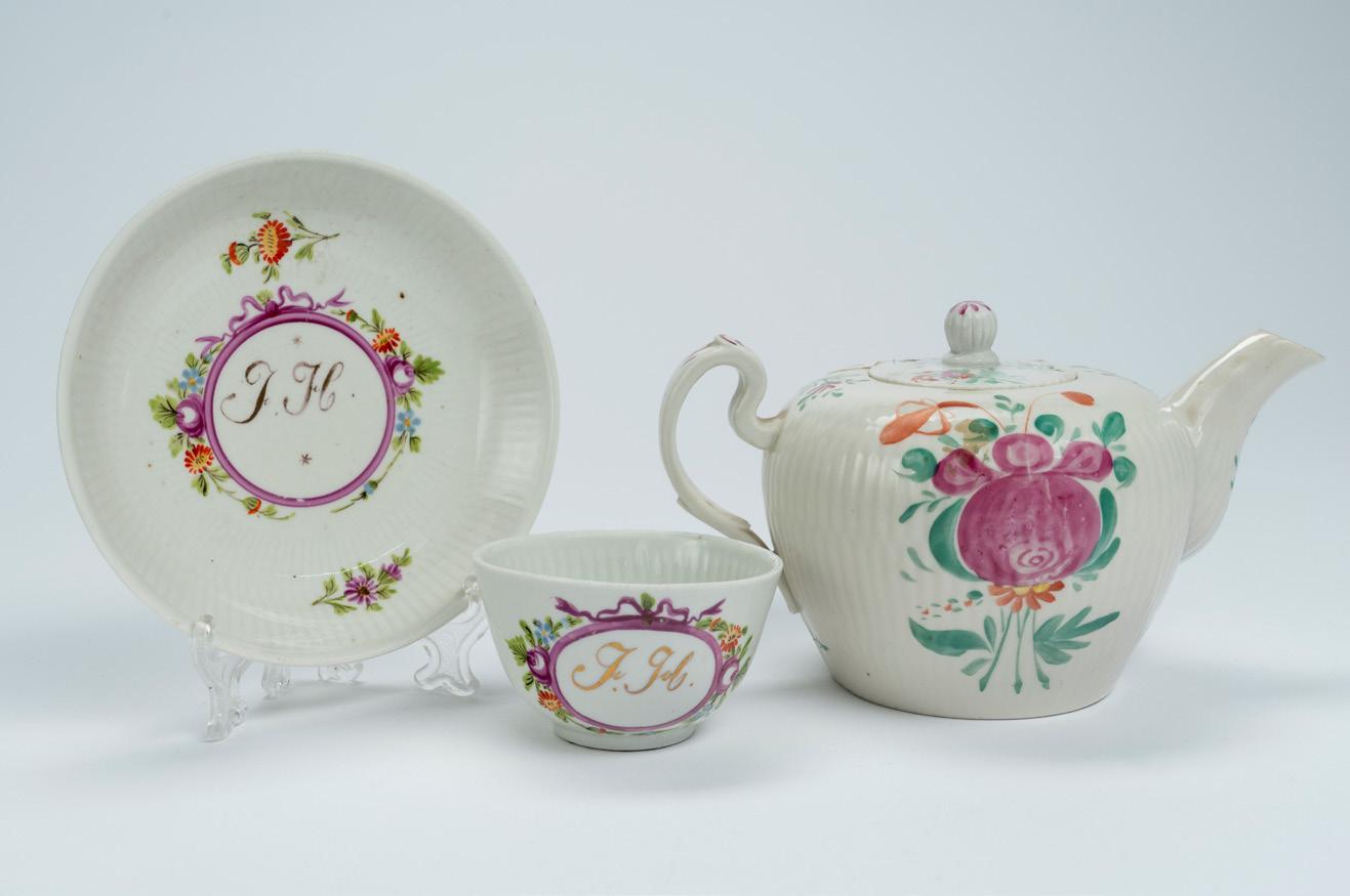 Tesa a rilievo decorata a festoni di fiori e foglie, suddivisa in quattro settori da segmenti radiali in rosso porpora. Al centro del cavetto, decoro a piccolo fuoco con motivo “a giardinetto”: ponticello reso in rosso porpora al posto del tradizionale verde muschio, staccionata a graticci romboidali che sorregge un vaso biansato, una palma, con sullo sfondo un filare di cipressi e, al centro, un ombrello parasole tipico dell’ultimo quarto del Settecento, periodo di gestione della fabbrica novese da parte di Giovanni Maria Baccin.