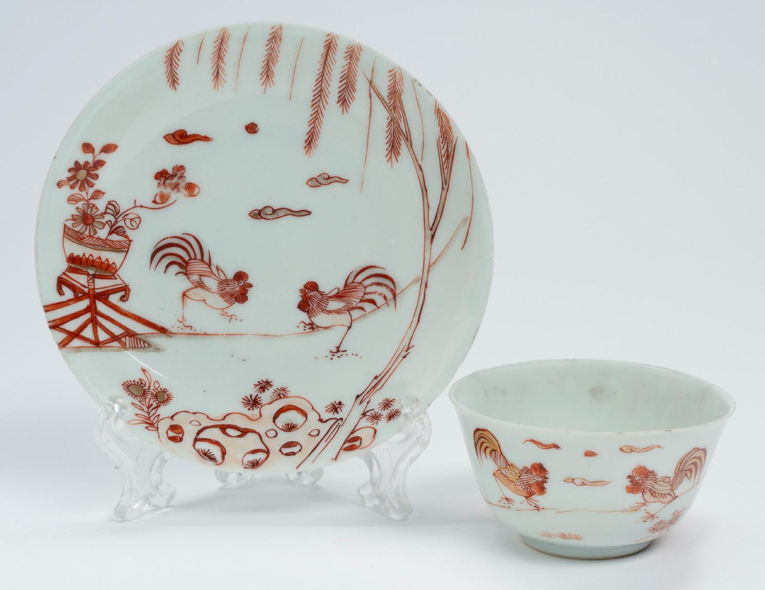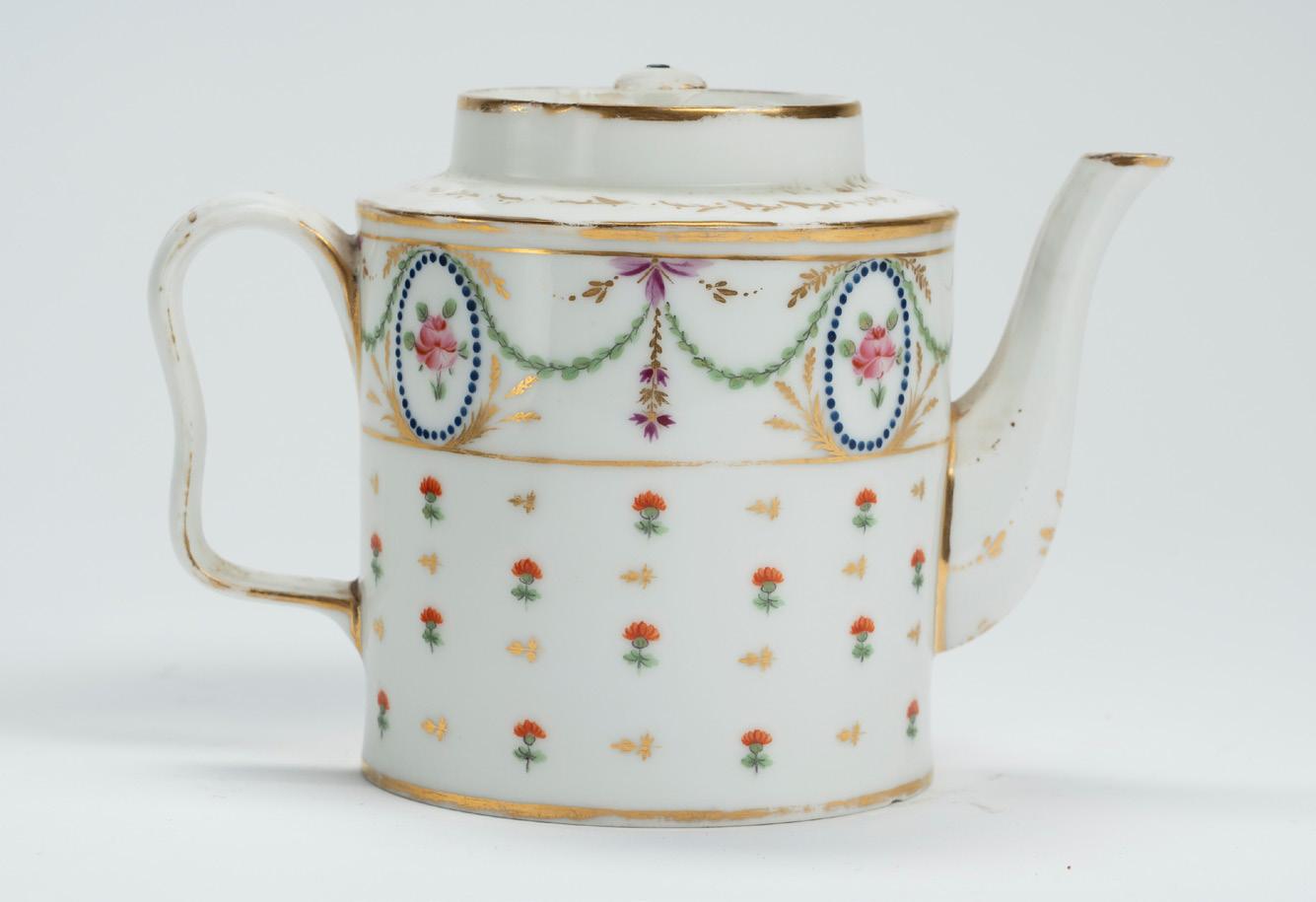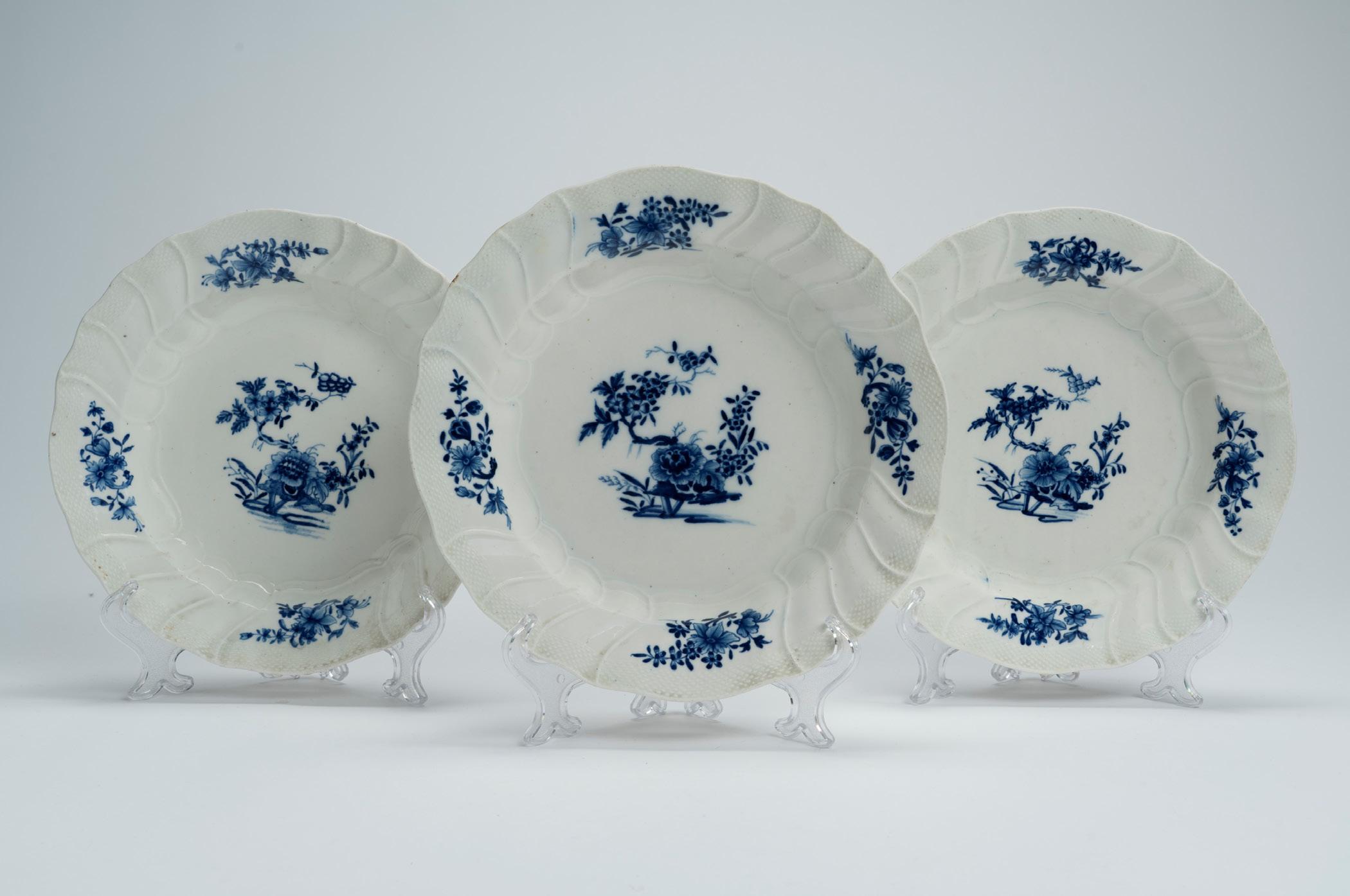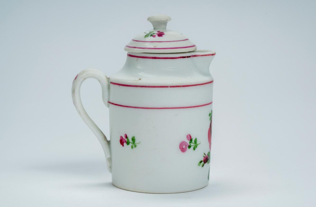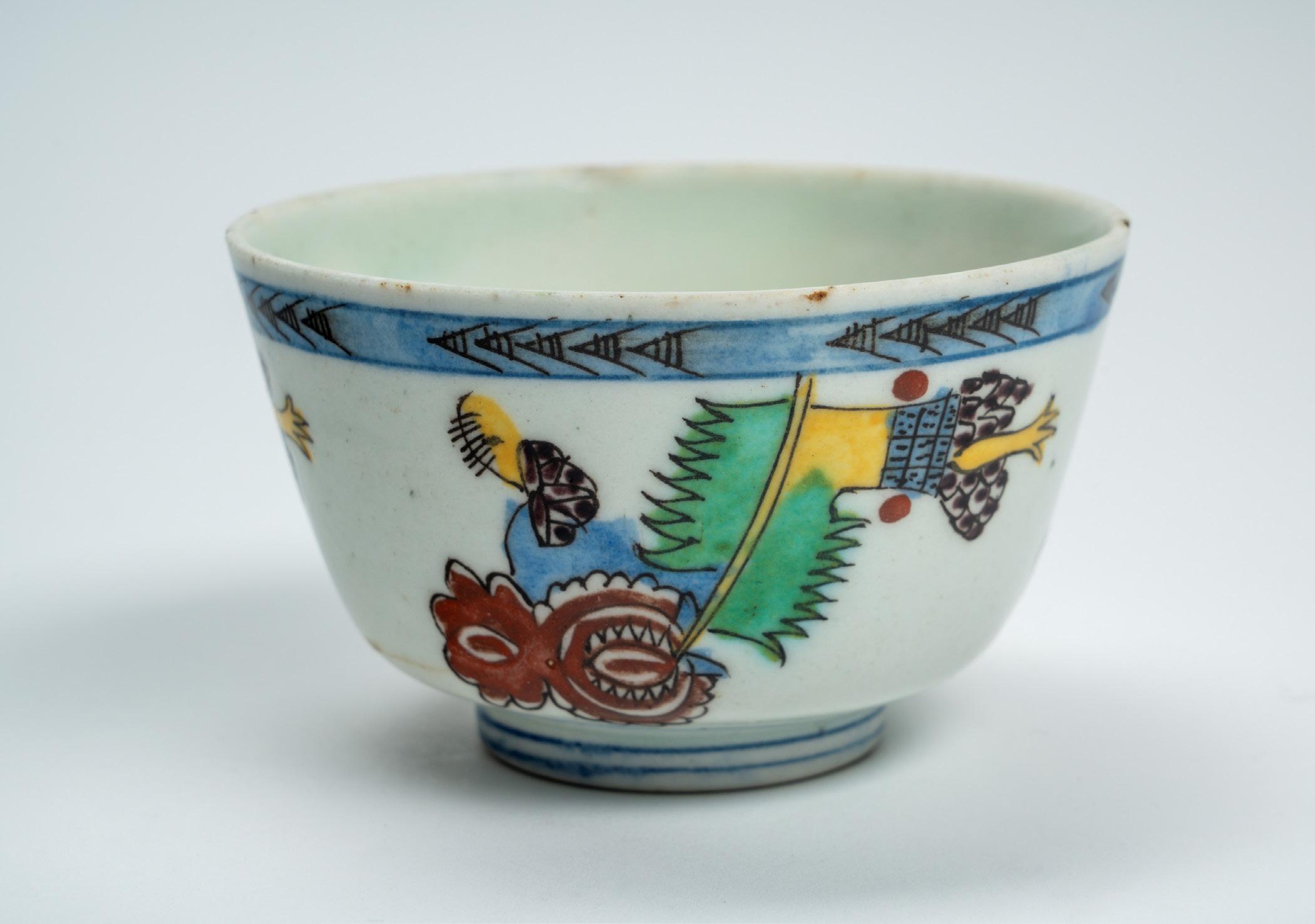 Tesa a rilievo decorata a festoni di fiori e foglie, suddivisa in quattro settori da segmenti radiali in rosso porpora. Al centro del cavetto, decoro a piccolo fuoco con motivo “a giardinetto”: ponticello reso in rosso porpora al posto del tradizionale verde muschio, staccionata a graticci romboidali che sorregge un vaso biansato, una palma, con sullo sfondo un filare di cipressi e, al centro, un ombrello parasole tipico dell’ultimo quarto del Settecento, periodo di gestione della fabbrica novese da parte di Giovanni Maria Baccin.