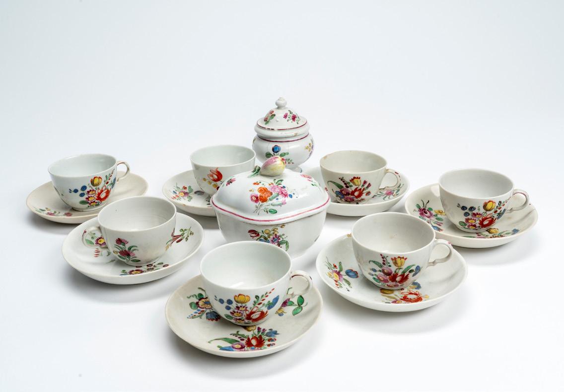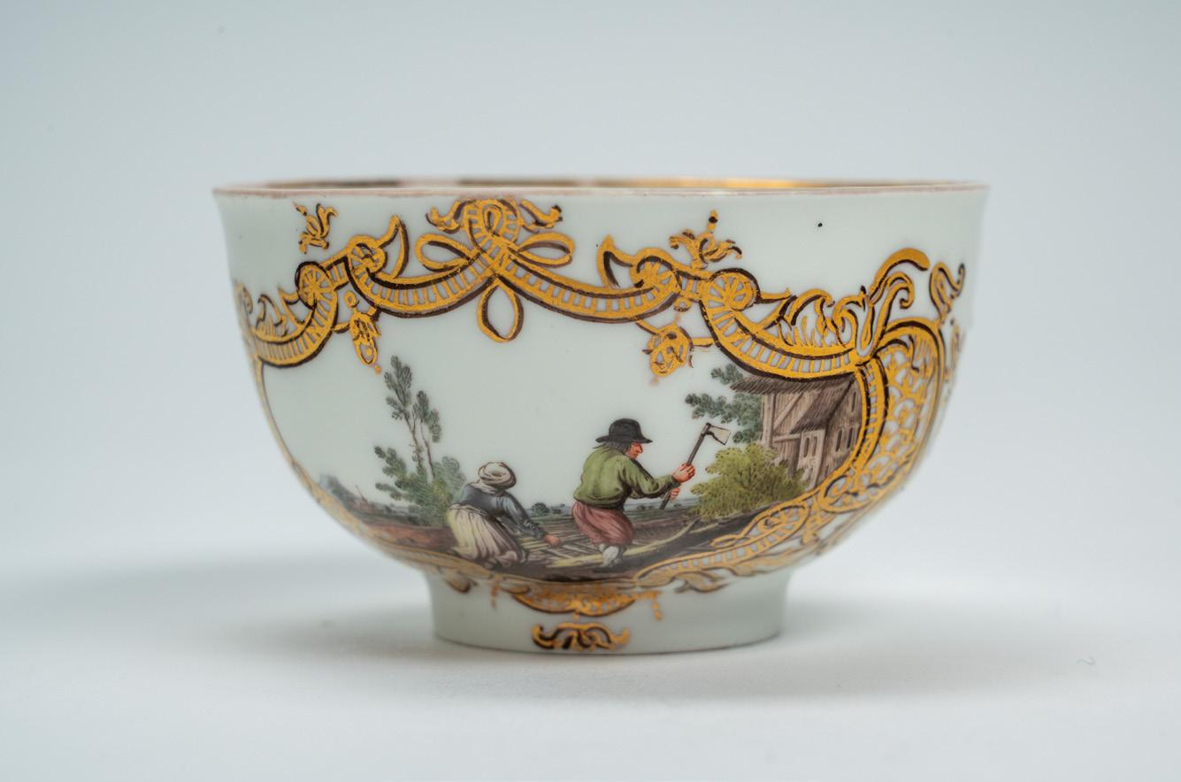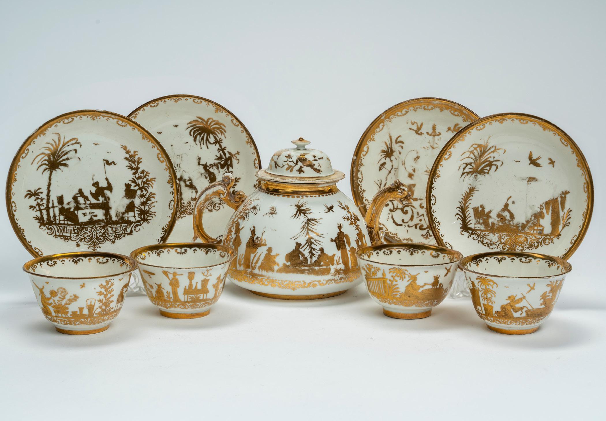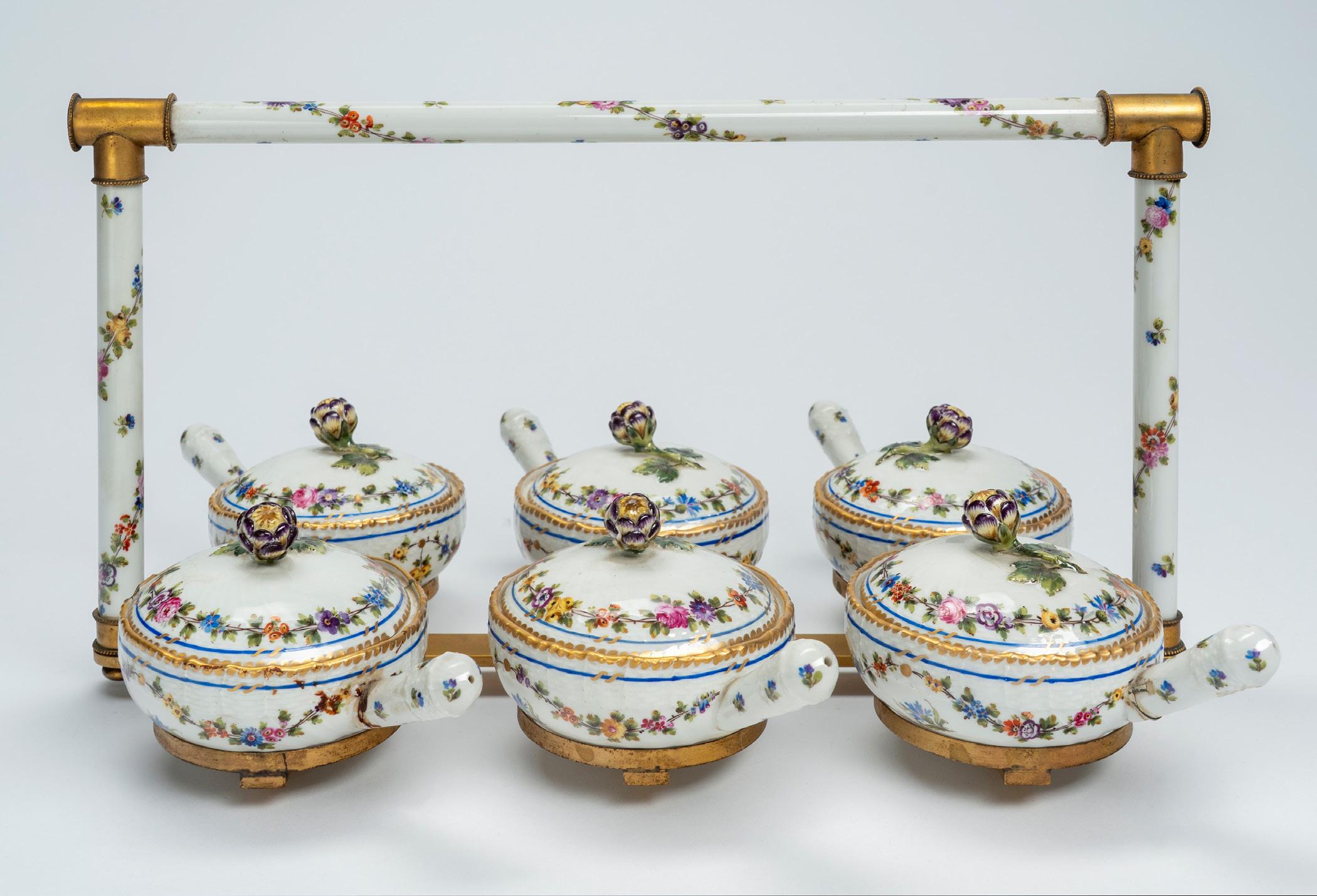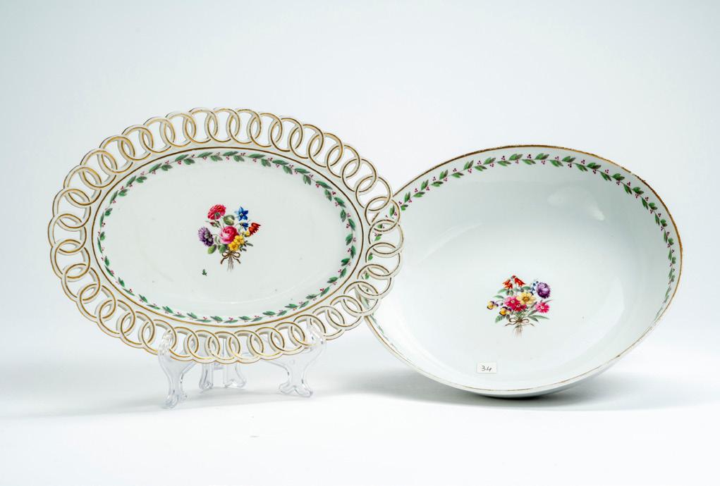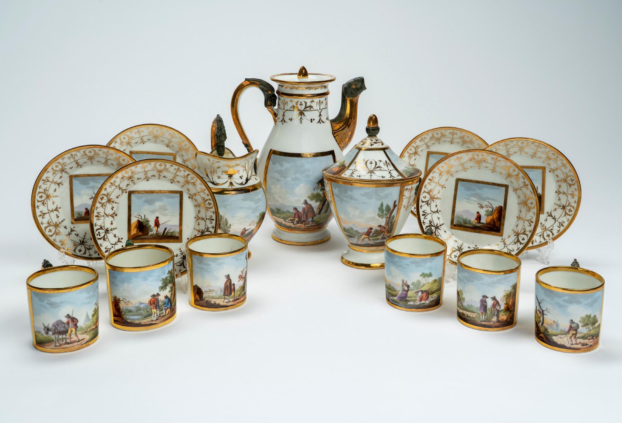Poggianti su base a rocaille. L’orchestra, da un modello creato da Johann Joachim Kaendler nel 1753 e rivisto nel 1765 con Peter Reinicke, è composta da ventuno figure di musicanti e un leggio. L’ensemble comprende: clavicembalista, liutista, suonatore di cornamusa scozzese, chitarrista, percussionista al triangolo, direttore d’orchestra, violoncellista, batterista, assistente, arpista, tamburino (tamburo laterale a spalla), soprano, violinista, oboista, trombettista, due coriste con spartito, cornista (con corno francese), flautista, flautista traverso e cantante. Alcuni esemplari con tracce di etichetta cartacea di provenienza “L. Beltrami, Torino”. Marchio di fabbrica, numeri impressi e dipinti in oro e/o rosso sotto le basi.