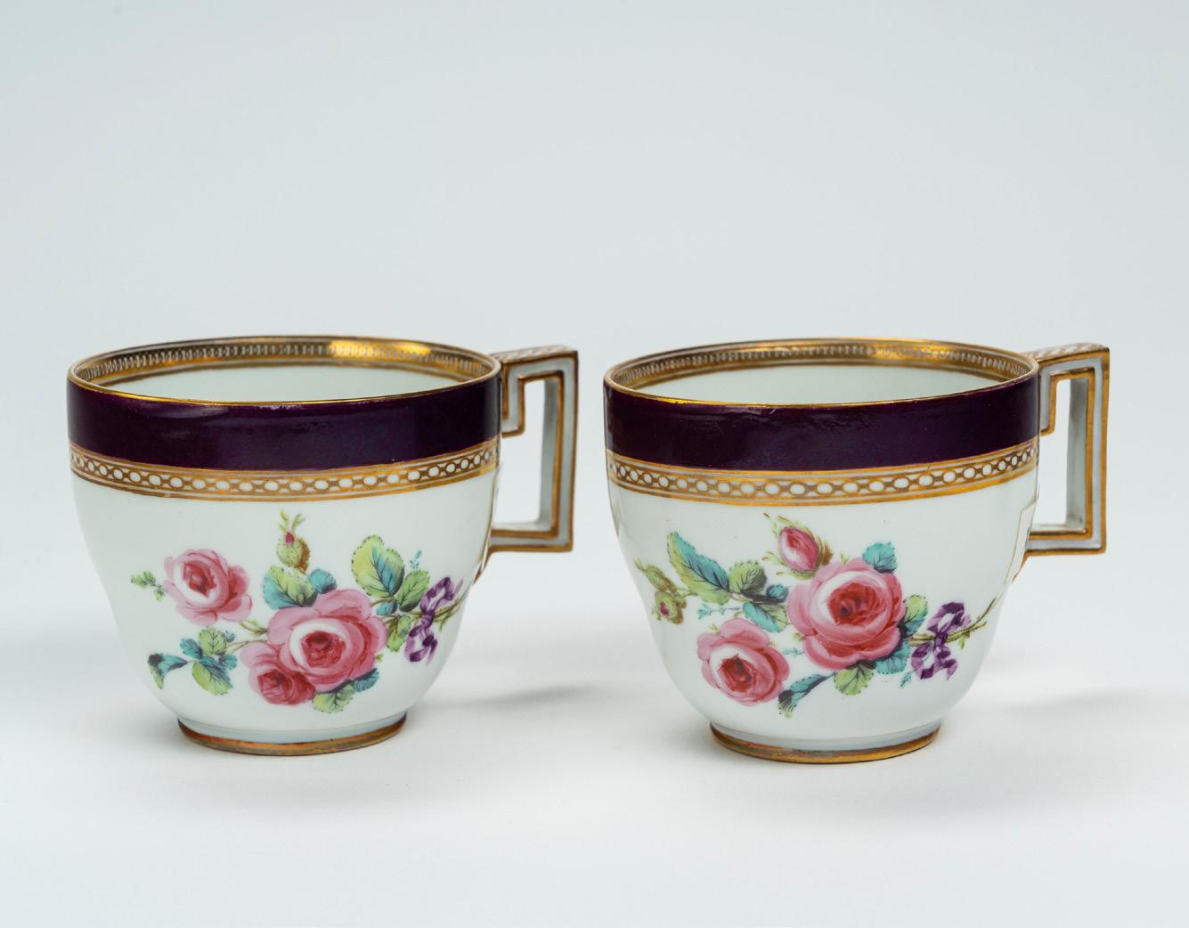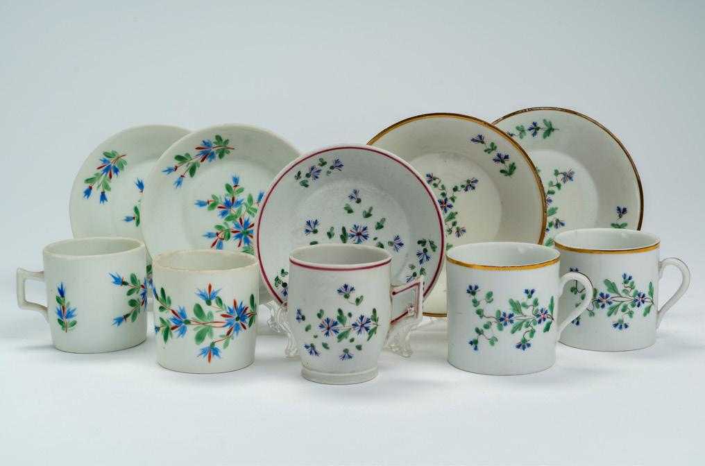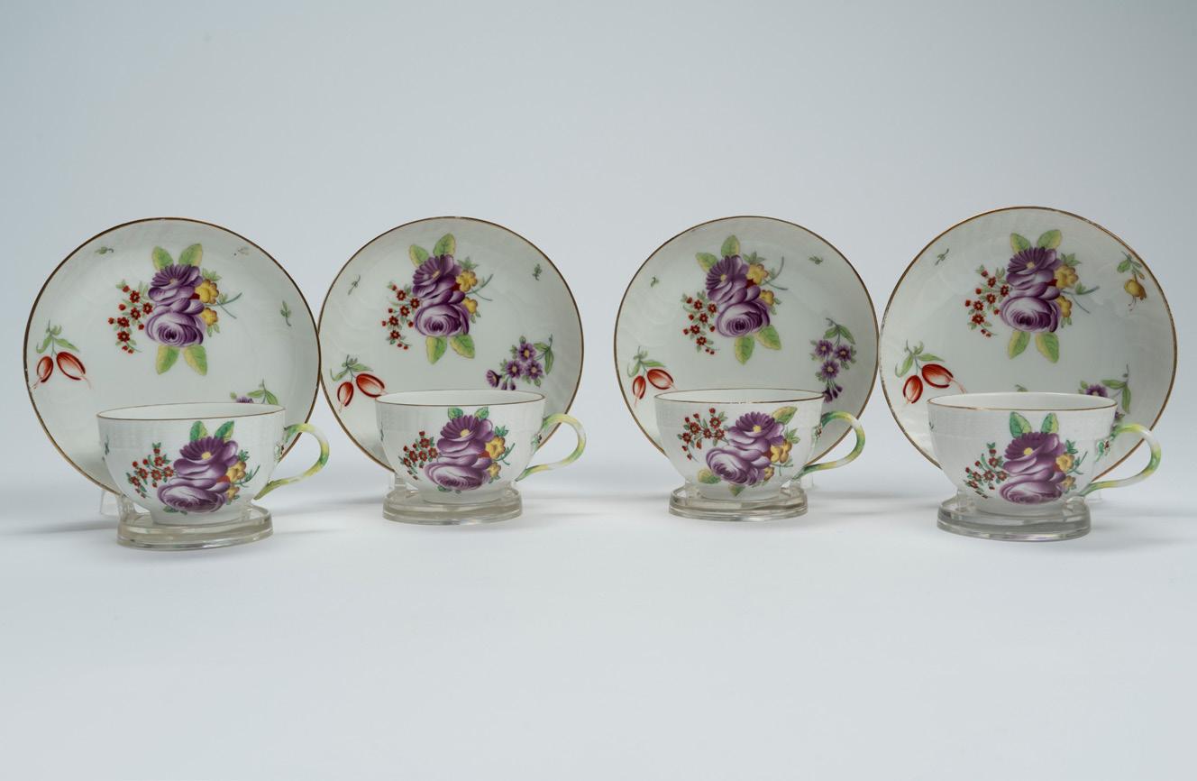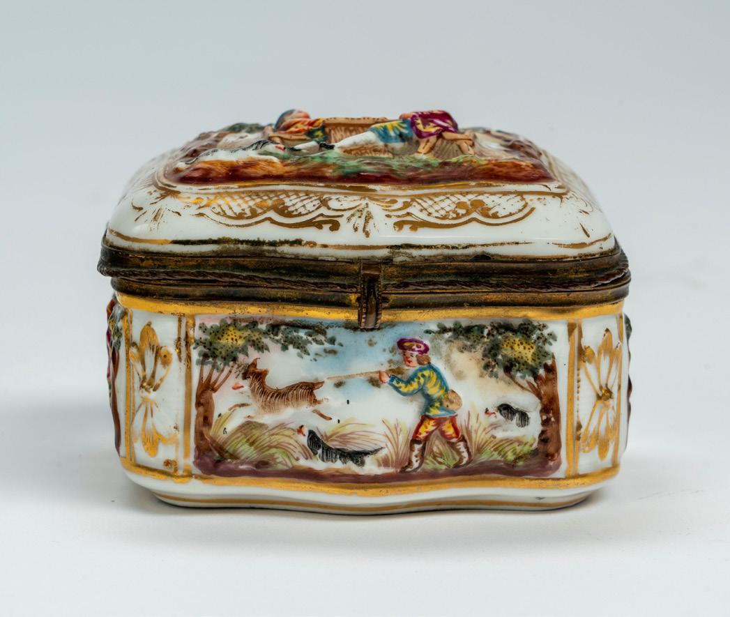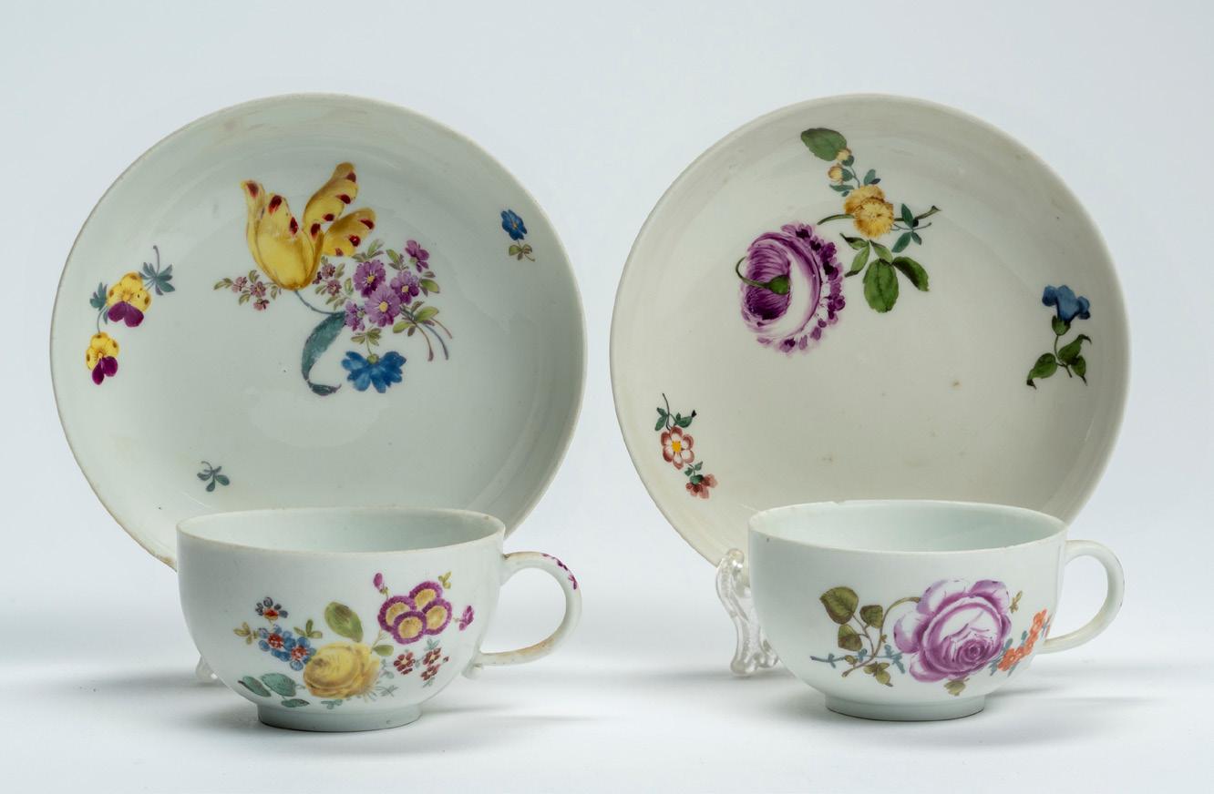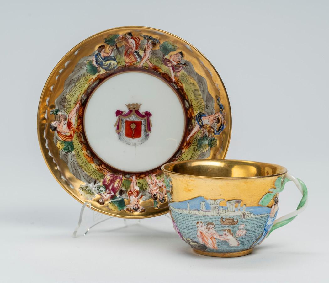Poggianti su base a rocaille. L’orchestra, da un modello creato da Johann Joachim Kaendler nel 1753 e rivisto nel 1765 con Peter Reinicke, è composta da ventuno figure di musicanti e un leggio. L’ensemble comprende: clavicembalista, liutista, suonatore di cornamusa scozzese, chitarrista, percussionista al triangolo, direttore d’orchestra, violoncellista, batterista, assistente, arpista, tamburino (tamburo laterale a spalla), soprano, violinista, oboista, trombettista, due coriste con spartito, cornista (con corno francese), flautista, flautista traverso e cantante. Alcuni esemplari con tracce di etichetta cartacea di provenienza “L. Beltrami, Torino”. Marchio di fabbrica, numeri impressi e dipinti in oro e/o rosso sotto le basi.