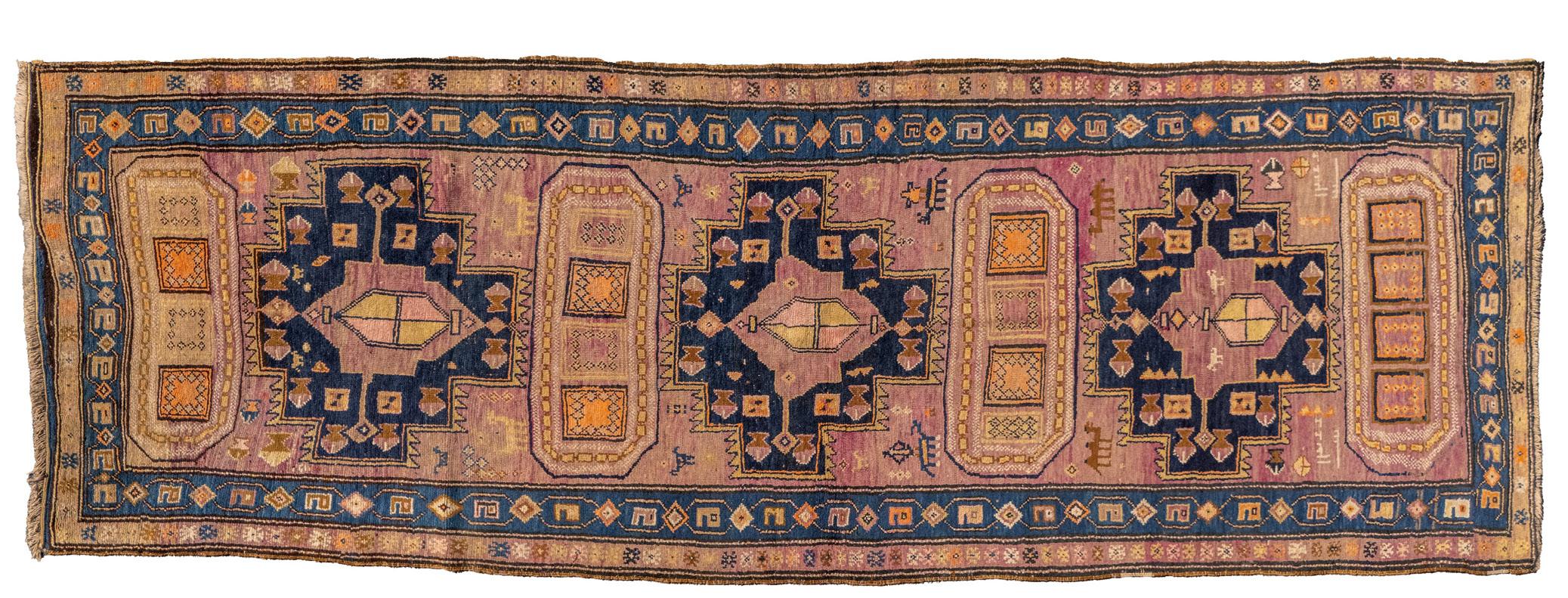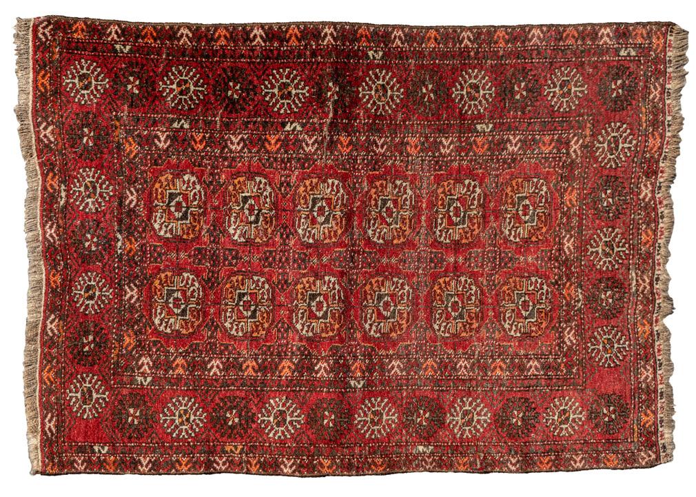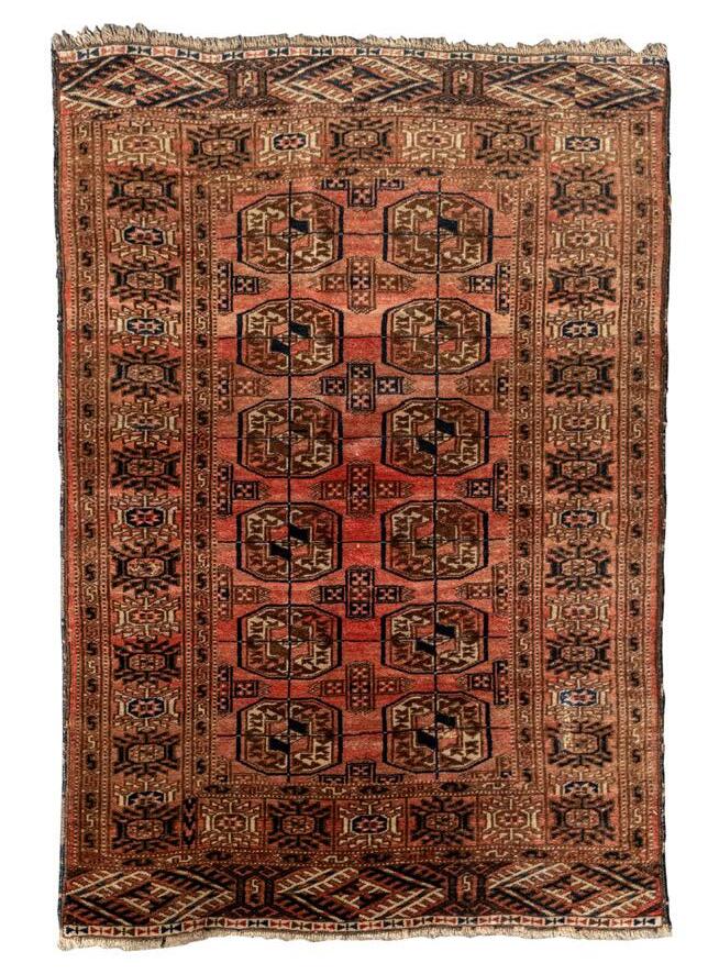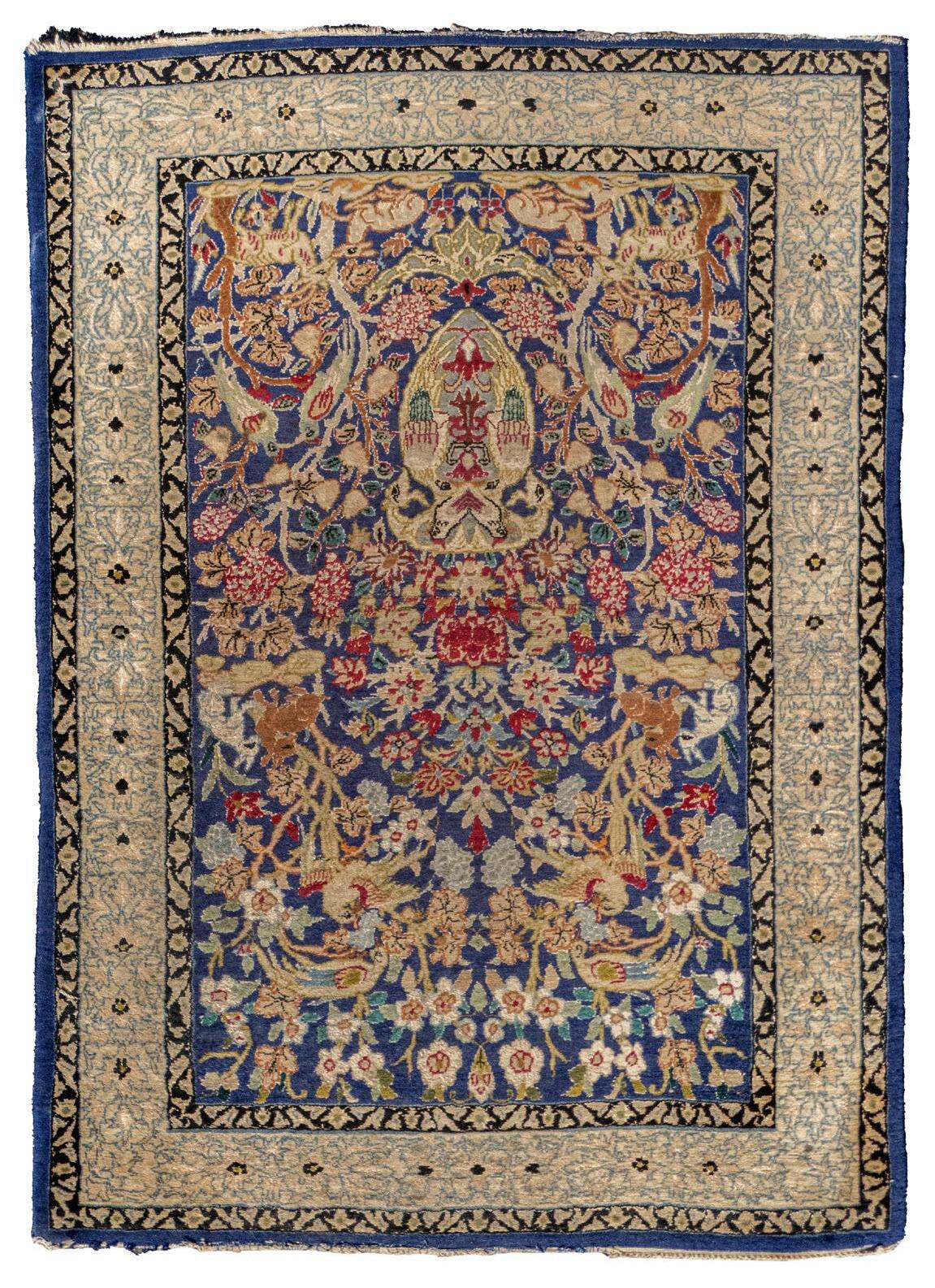 Tappeto a fondo marrone con bordura in verde riccamente decorato a motivi floreali. Secolo XX cm