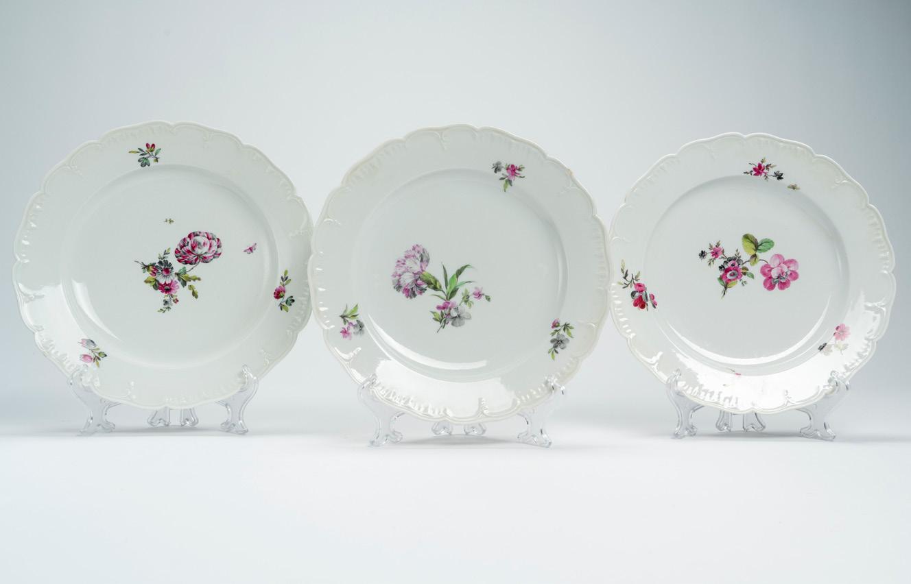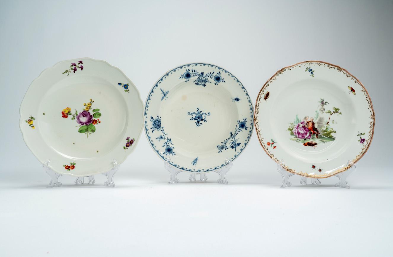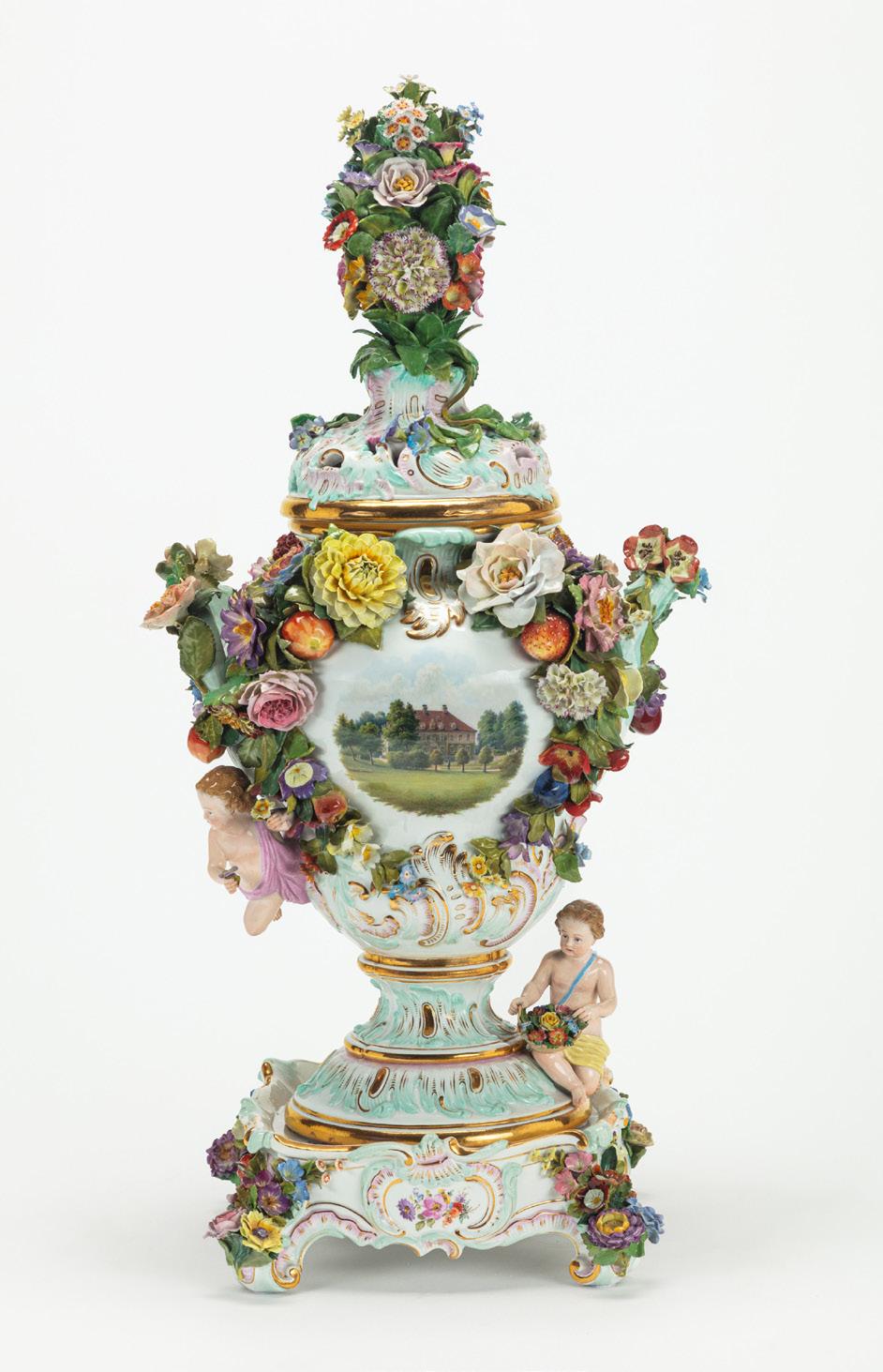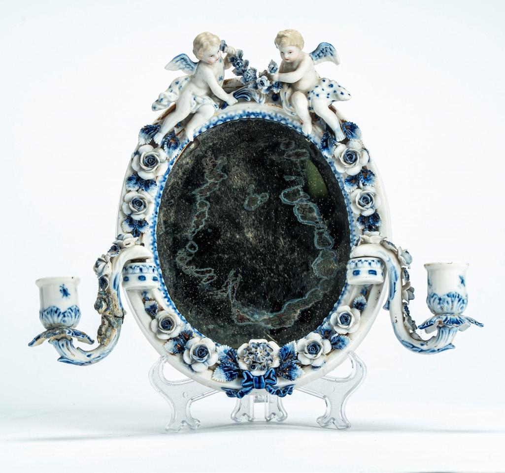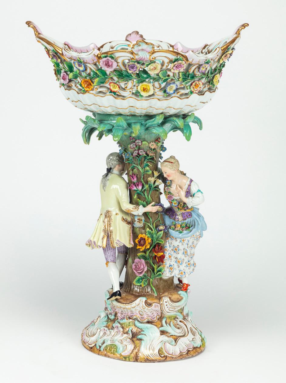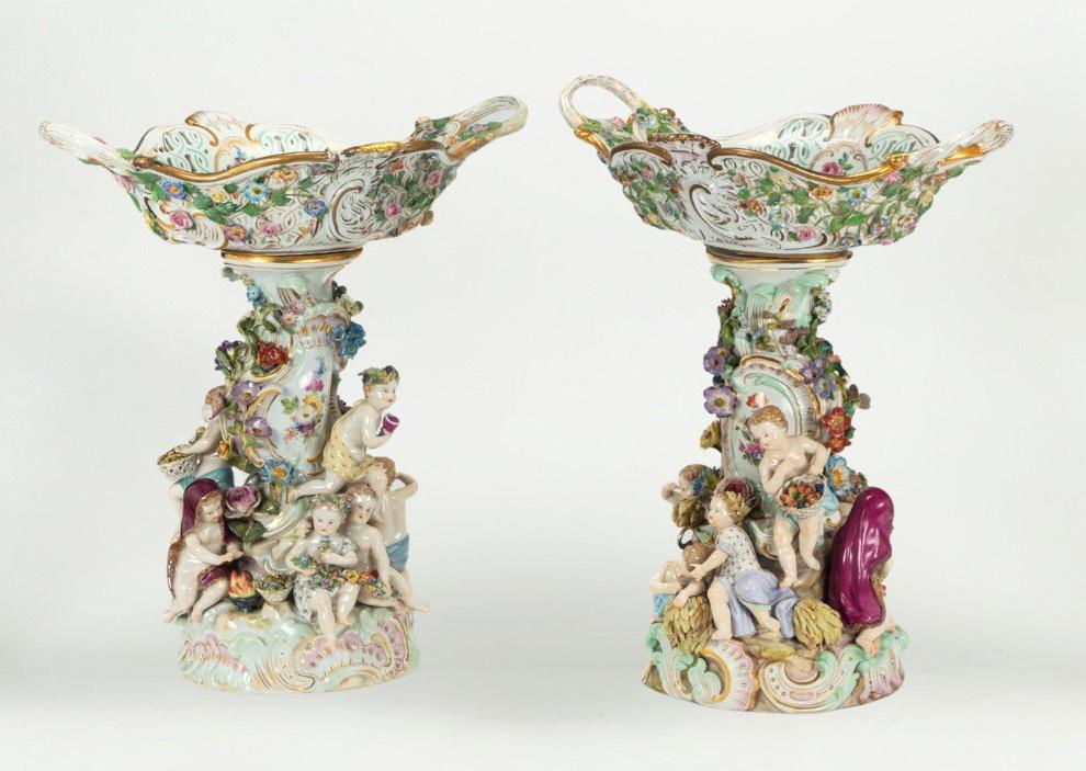 Lotto composto da un’alzata e una coppia di candelabri in porcellana policroma. Manifattura di Meissen, fine secolo XIX alzata con base h cm 54; candelabri h cm 50,5 riccamente decorati con putti allegorici (le Stagioni), foglie e fiori su basi a rocaille. I candelabri a quattro fiamme, l’alzata con cesto biansato, traforato e lumeggiato in oro.