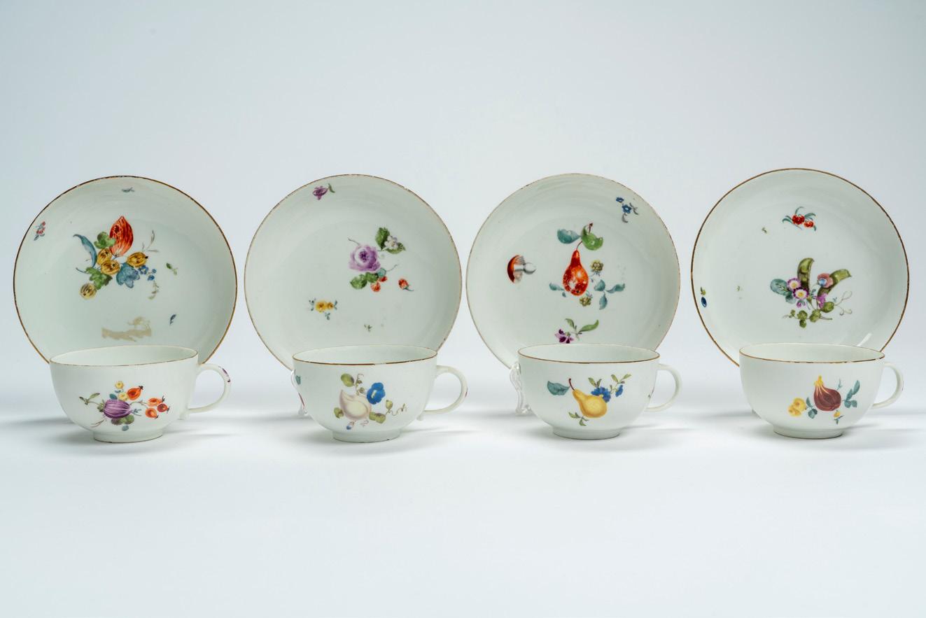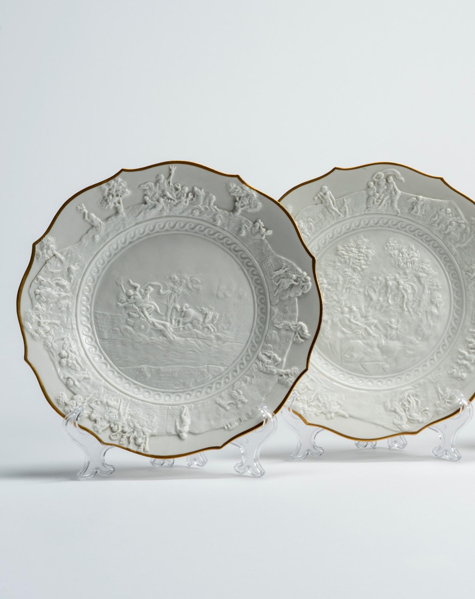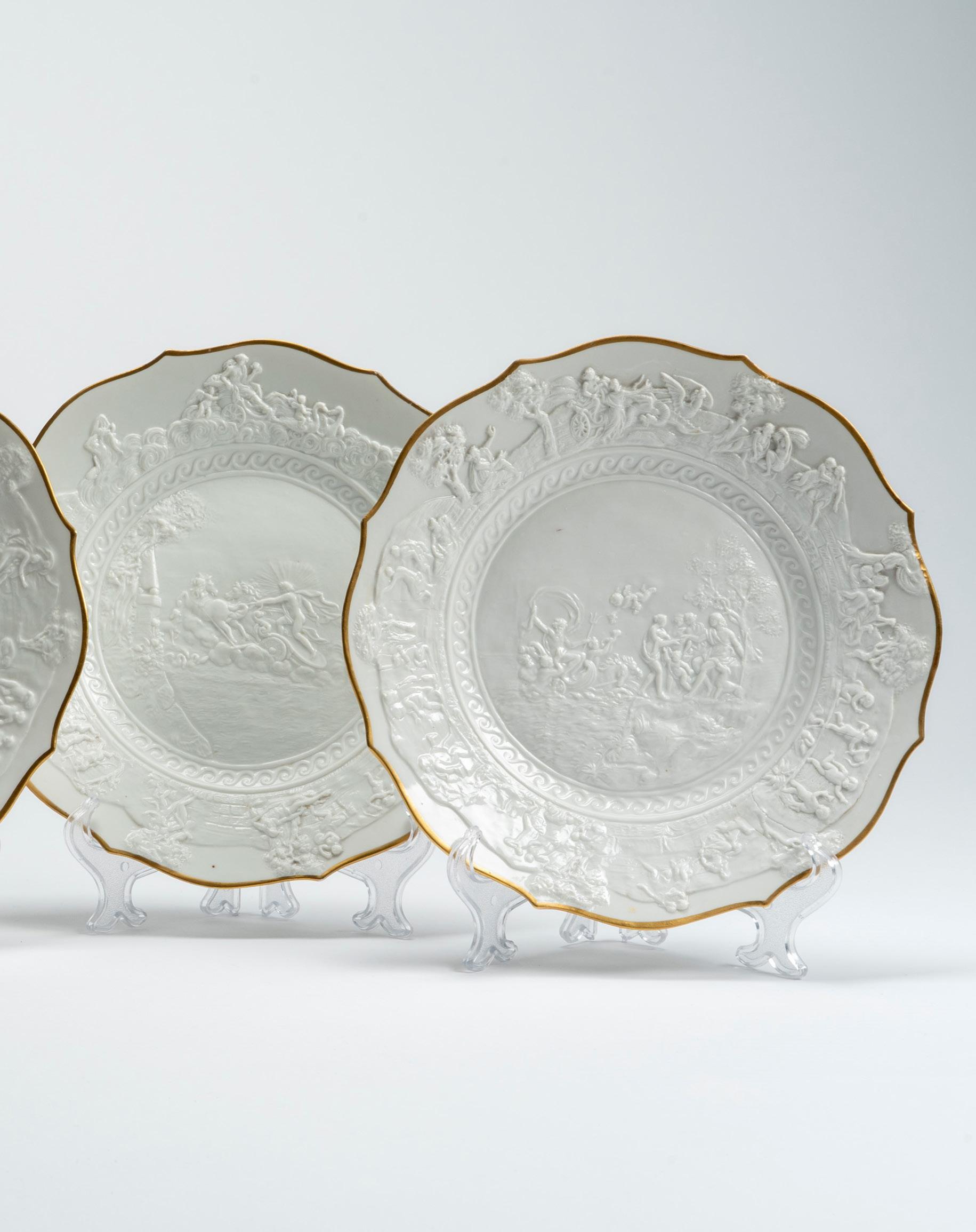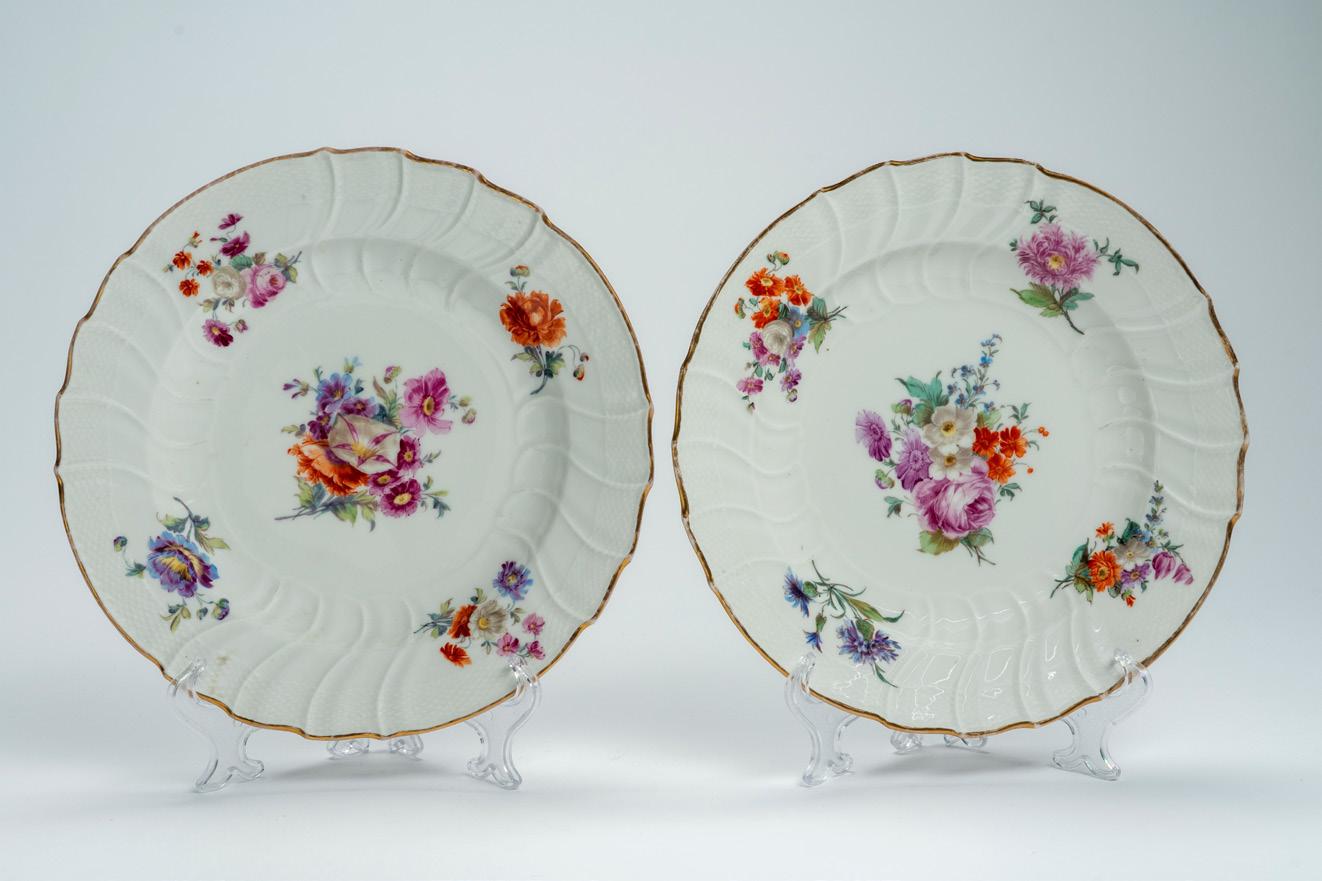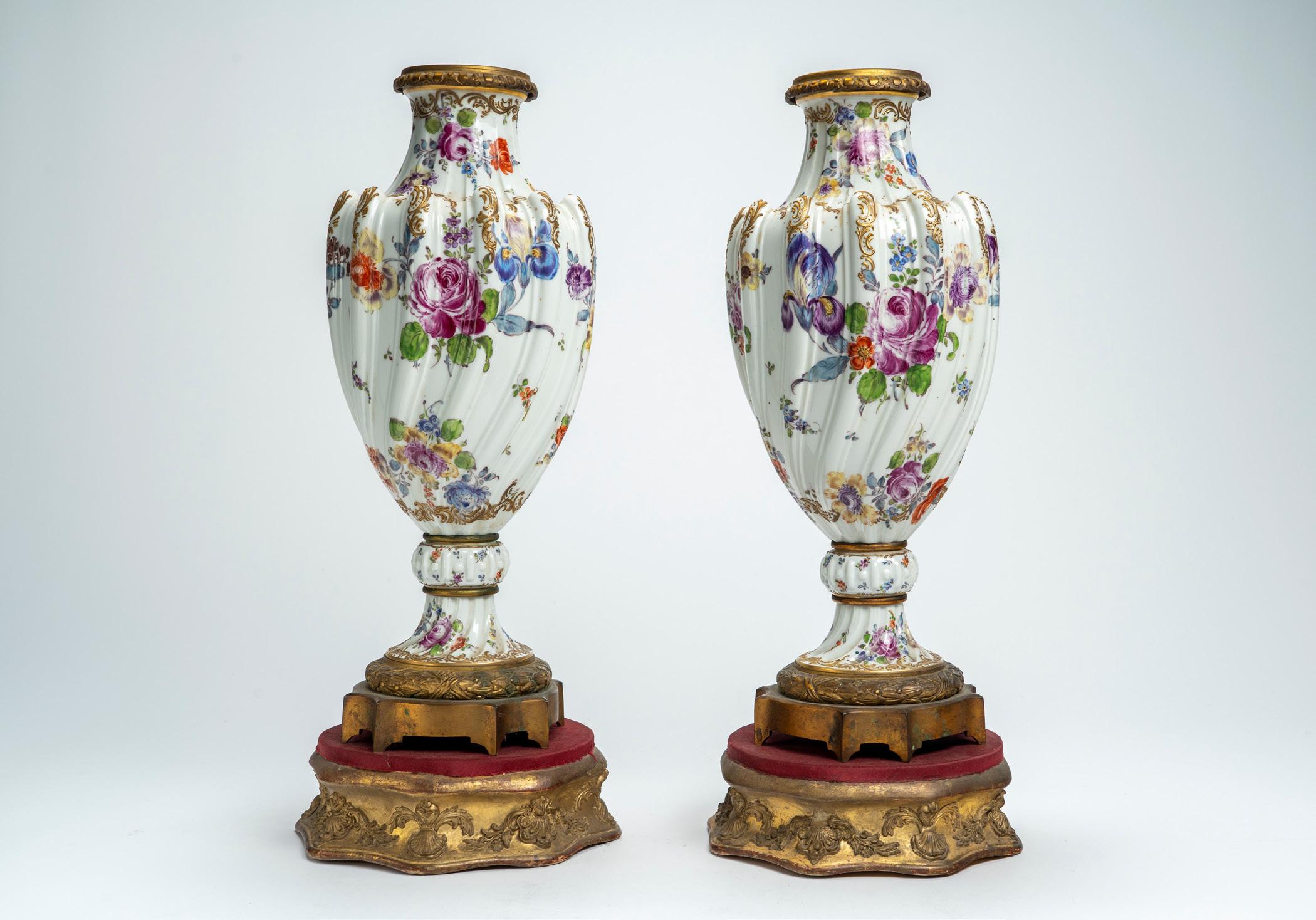 Lotto composto da un’alzata e una coppia di candelabri in porcellana policroma. Manifattura di Meissen, fine secolo XIX alzata con base h cm 54; candelabri h cm 50,5 riccamente decorati con putti allegorici (le Stagioni), foglie e fiori su basi a rocaille. I candelabri a quattro fiamme, l’alzata con cesto biansato, traforato e lumeggiato in oro.
