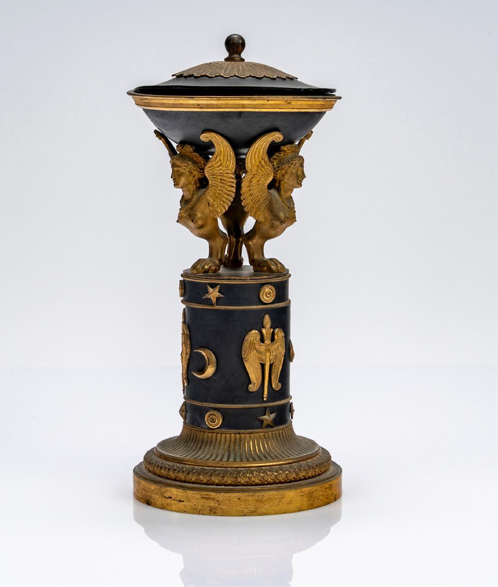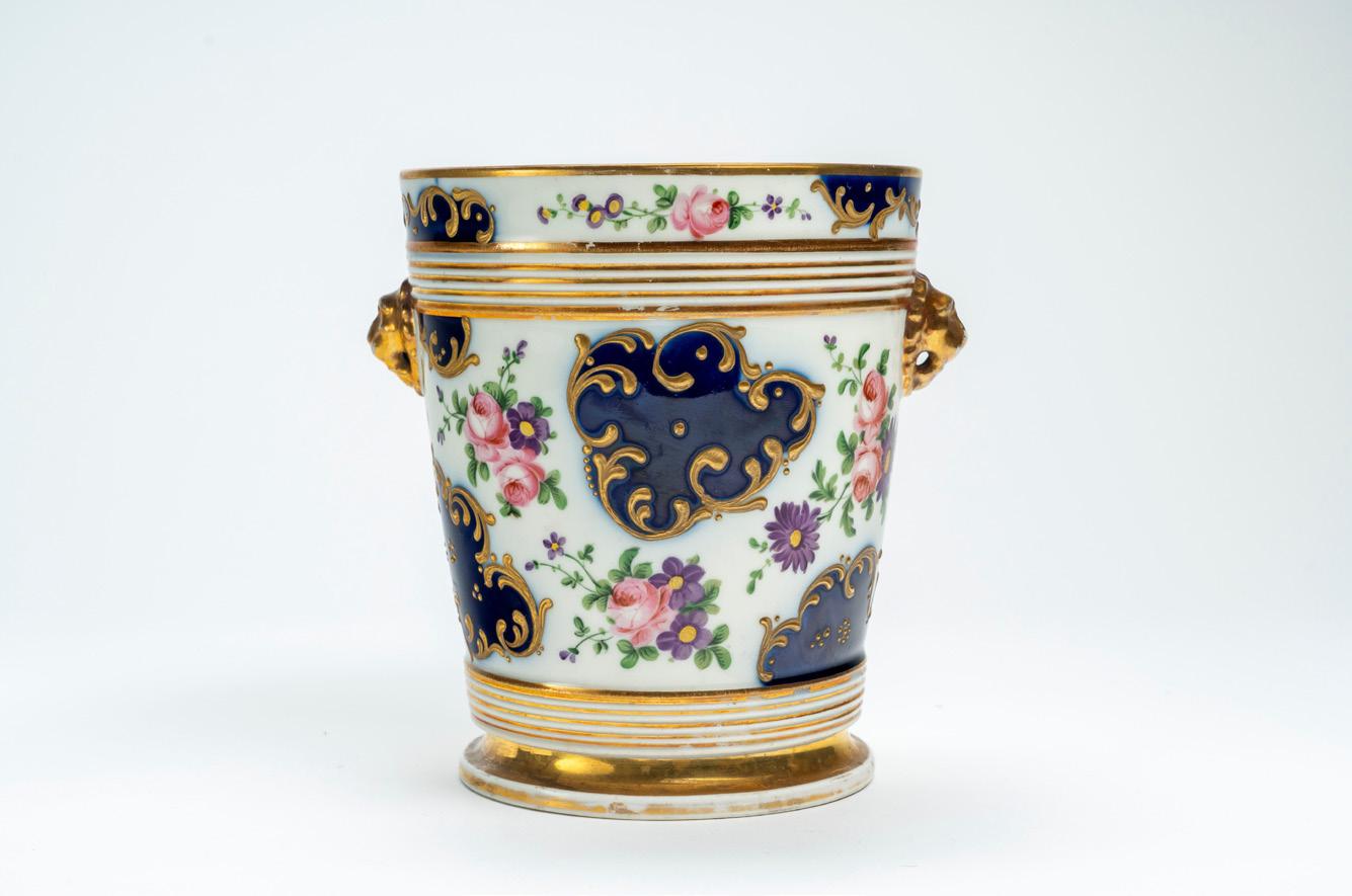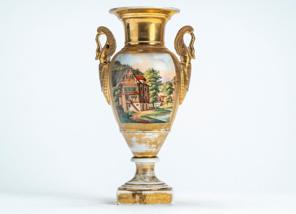 Vaso ovoidale in porcellana a fondo dorato con scene policrome agresti, anse a sfingi alate, su base quadrata dipinta a finto marmo. Francia, prima metà Secolo XIX h cm 28