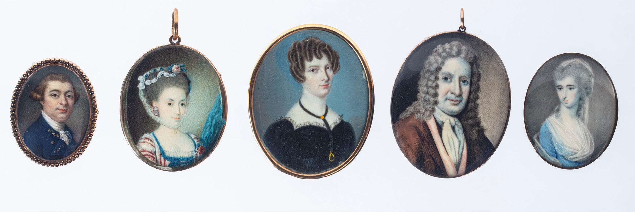 ☼ Lotto di cinque miniature su avorio raffiguranti gentiluomini e gentildonne, due in cornice a pendente, una trasformata a spilla. Tre montate in oro basso, due in oro 18 K. Secolo XVIII/XIX, cm 5,5x4,5, cm 5,4x4,3, cm 4,5x4, cm 4,2x3,4, cm 4x3 Il presente lotto è accompagnato da certificato Cites IT/CE/2025/MI/00057