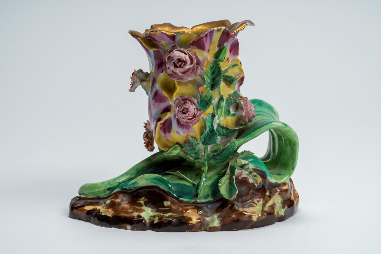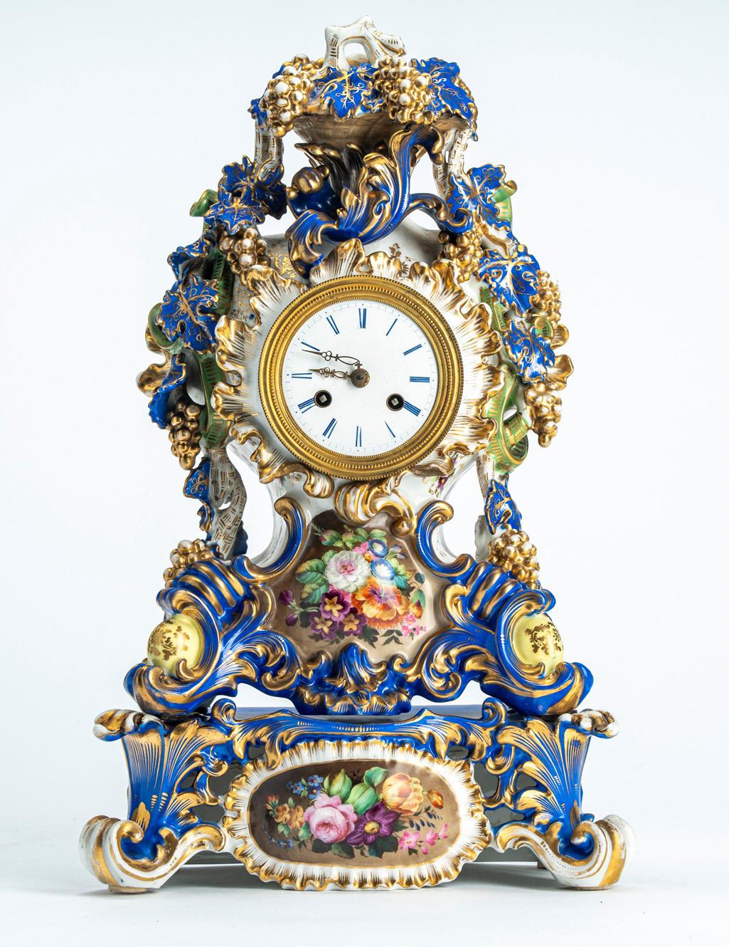 Pendola di forma mossa in porcellana policroma e dorata riccamente decorata a tralci di vite, poggiante su base con riserva ovale centrale dipinta a bouquet floreale. Quadrante circolare in smalto bianco a numeri romani. Jacob Petit, Francia, seconda metà Secolo XIX cassa h cm 34,7; h tot 42,5 Meccanismo numerato “6201”. Marchio dipinto in blu “J.R.” sotto la base