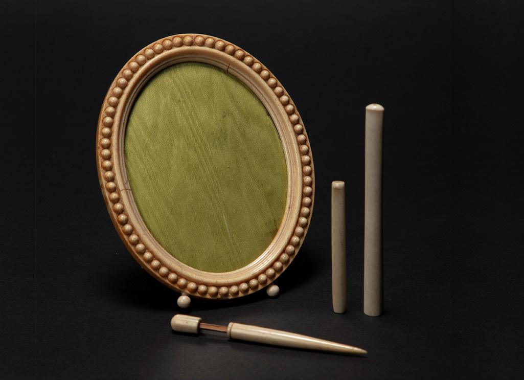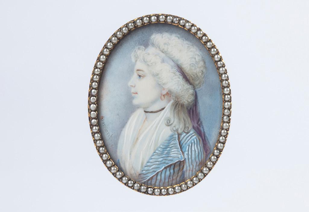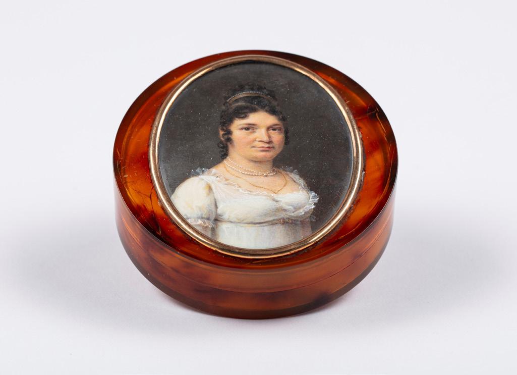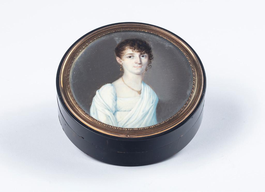 Coperchio decorato da miniatura su avorio raffigurante busto di gentildonna con abito bianco, doppio filo e diadema di perle. Difetti.