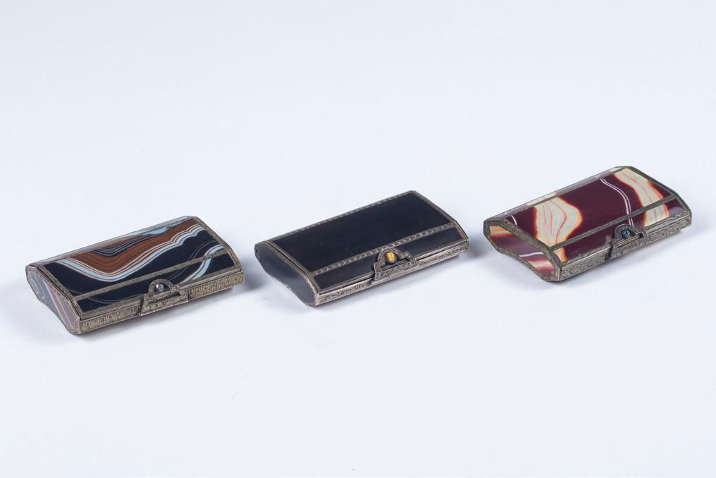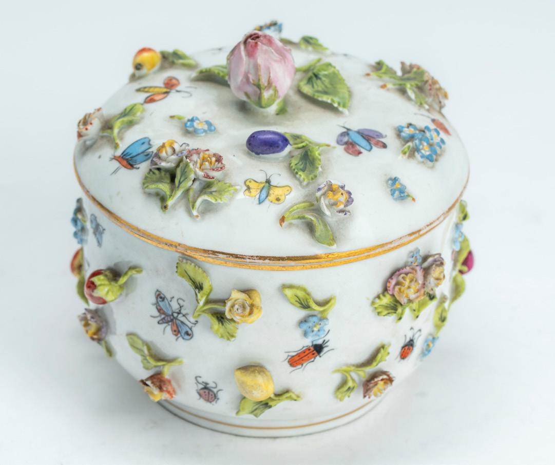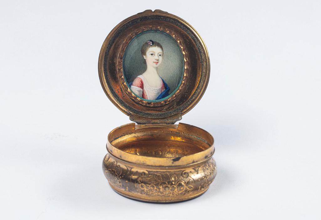 Coperchio decorato da miniatura in avorio raffigurante busto di fanciulla in veste bianca con collana e orecchini entro ghiera in oro. Difetti.