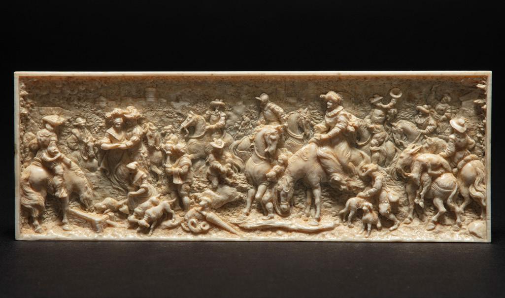 ☼ Placca in avorio finemente intagliato e a rilievo raffigurante battuta di caccia con nobili a cavallo, cani e un castello sullo sfondo. Secolo XVIII/XIX