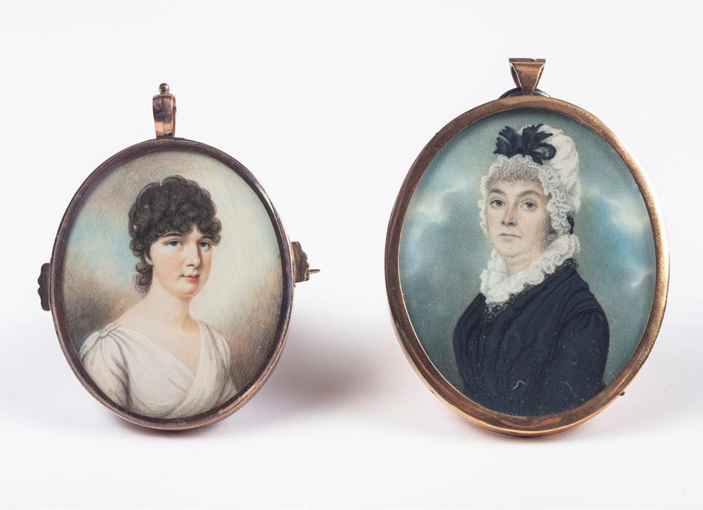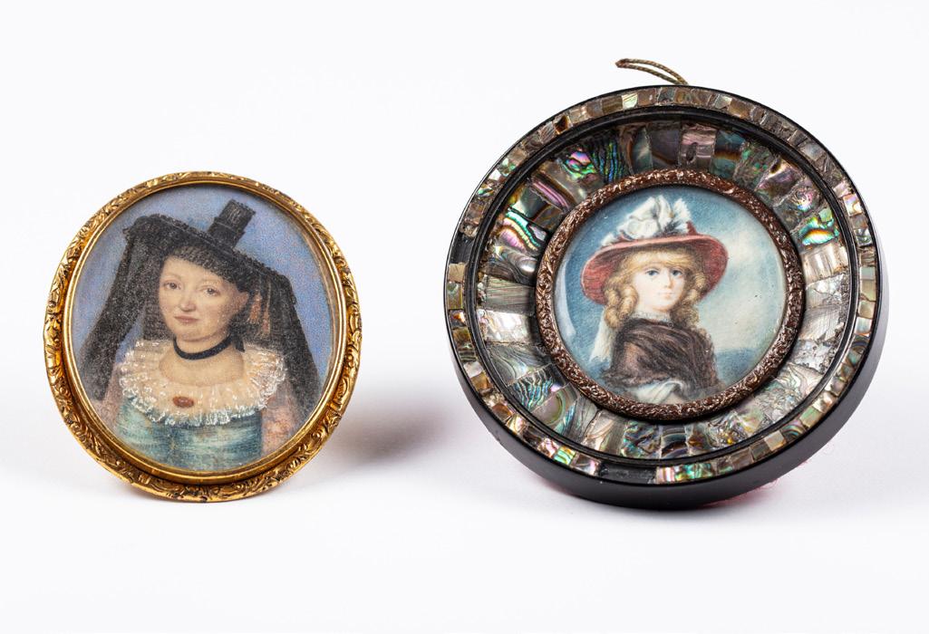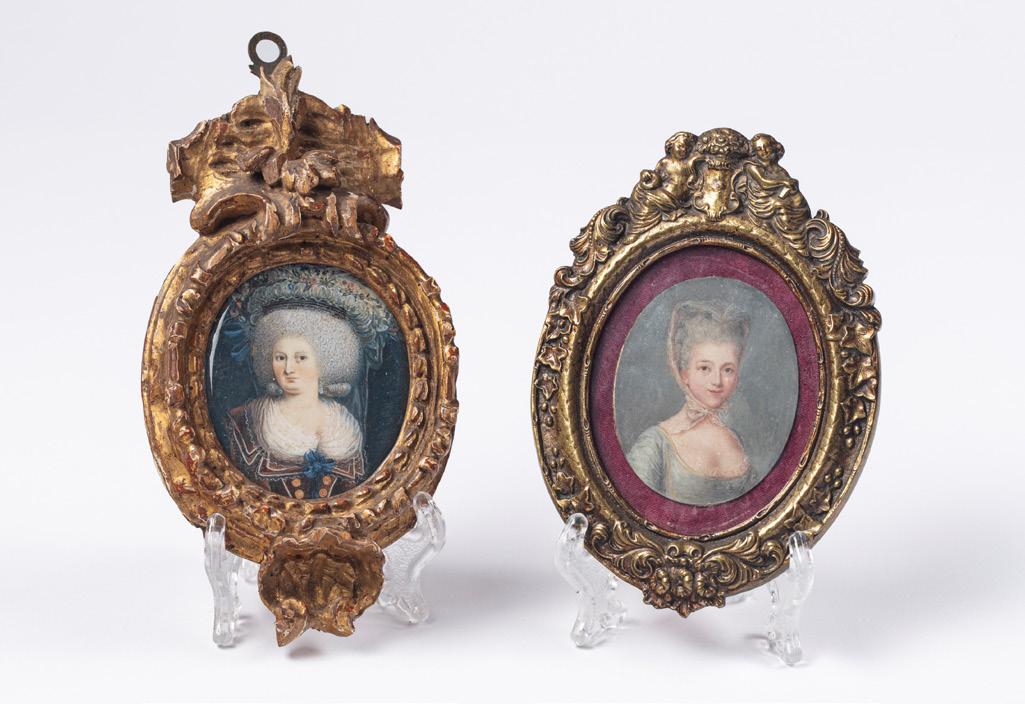 raffiguranti giovane donna con veste bianca e gentildonna in abito nero con cuffia e fiocco. Entro cornici a pendente una in metallo dorato e l’altra in oro 9 K. Una con etichetta cartacea di PROVENIENZA al retro, Beldi, Torino.