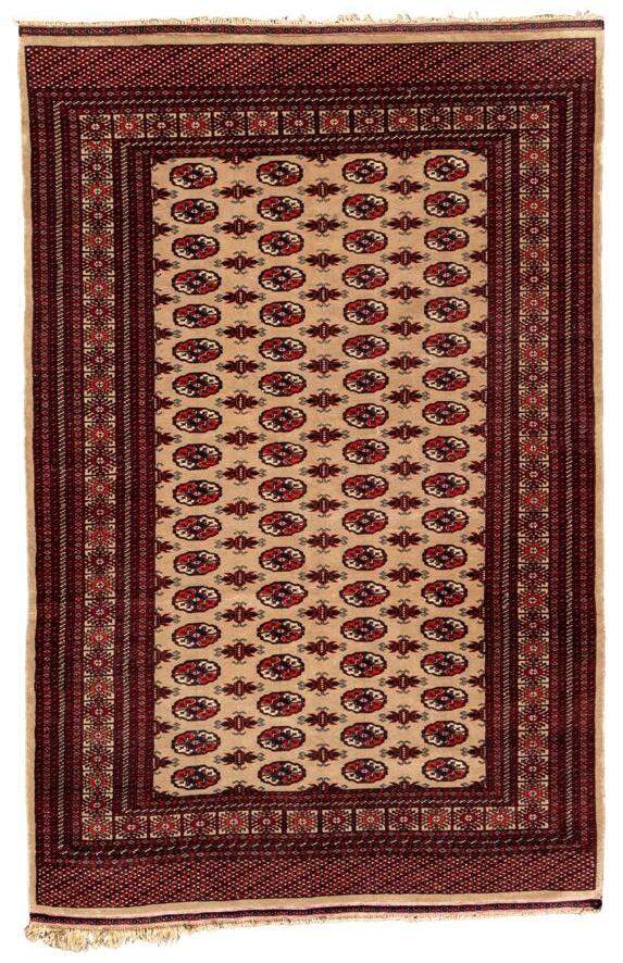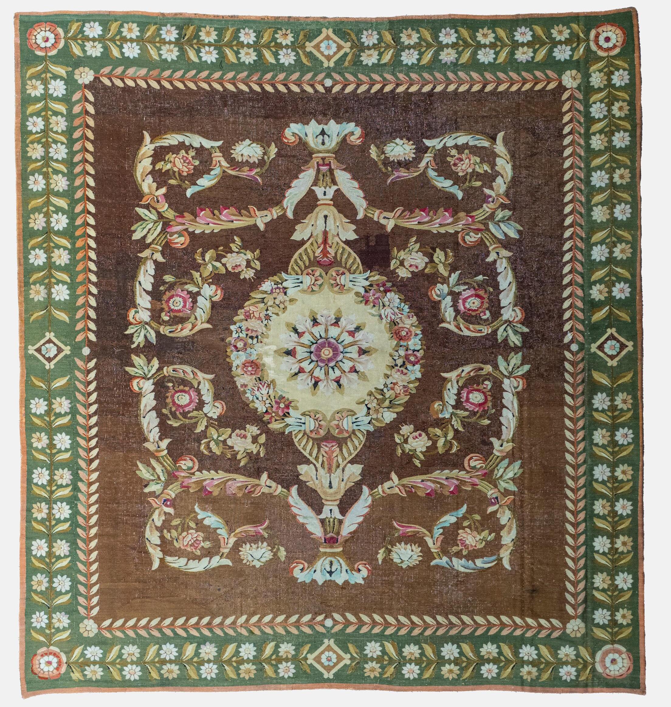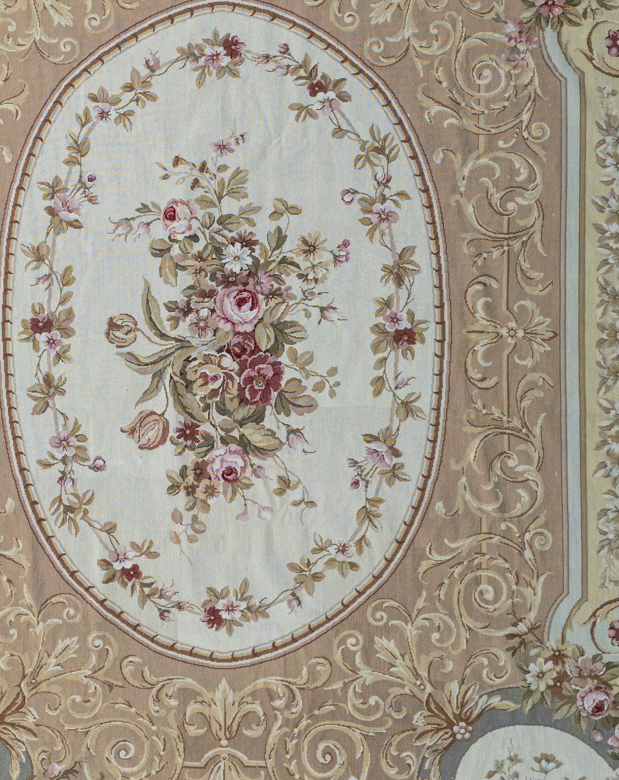 Tappeto “Aubusson” a fondo beige con medaglione centrale e quattro angolari decorati a bouquet di fiori. Secolo XX