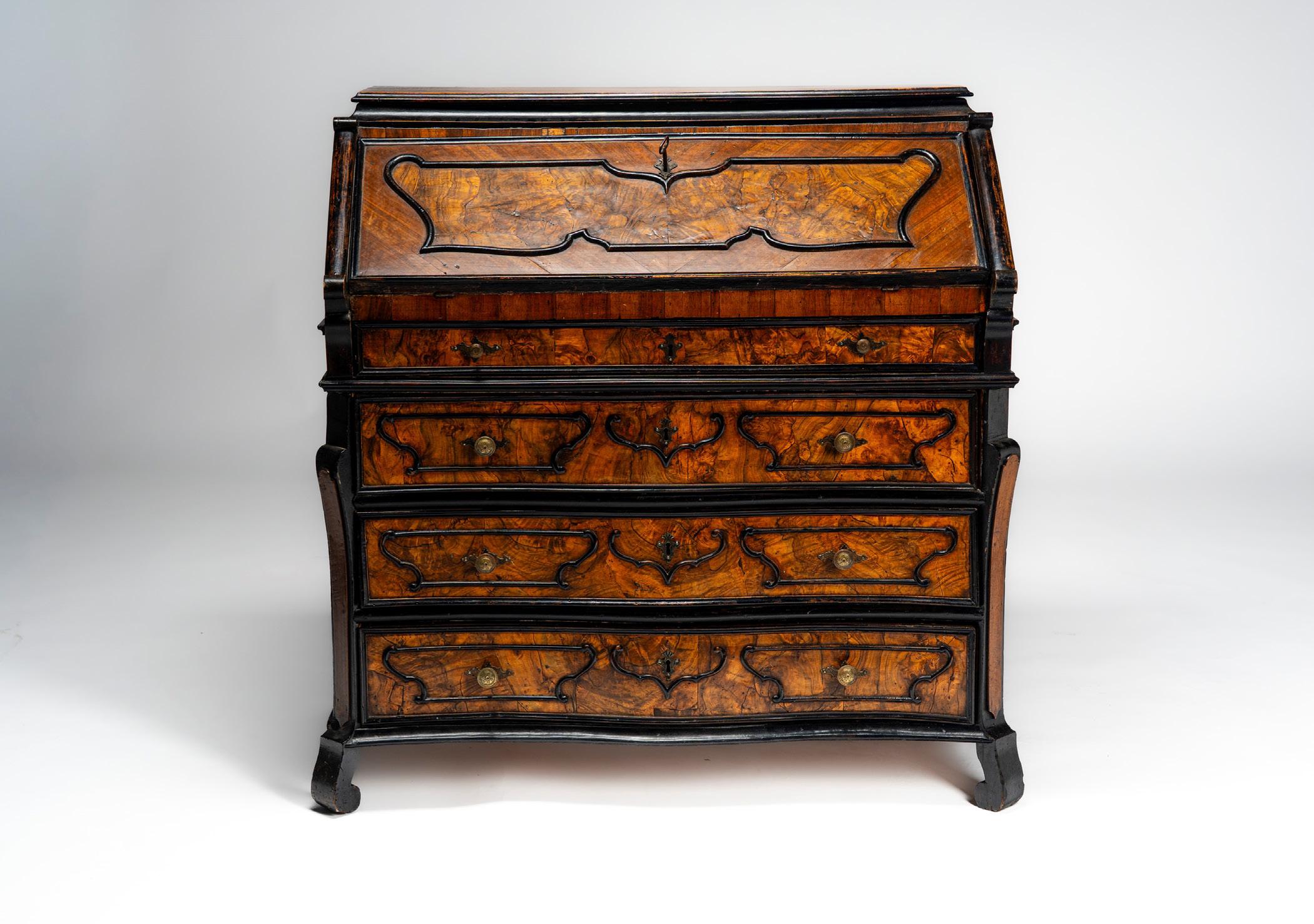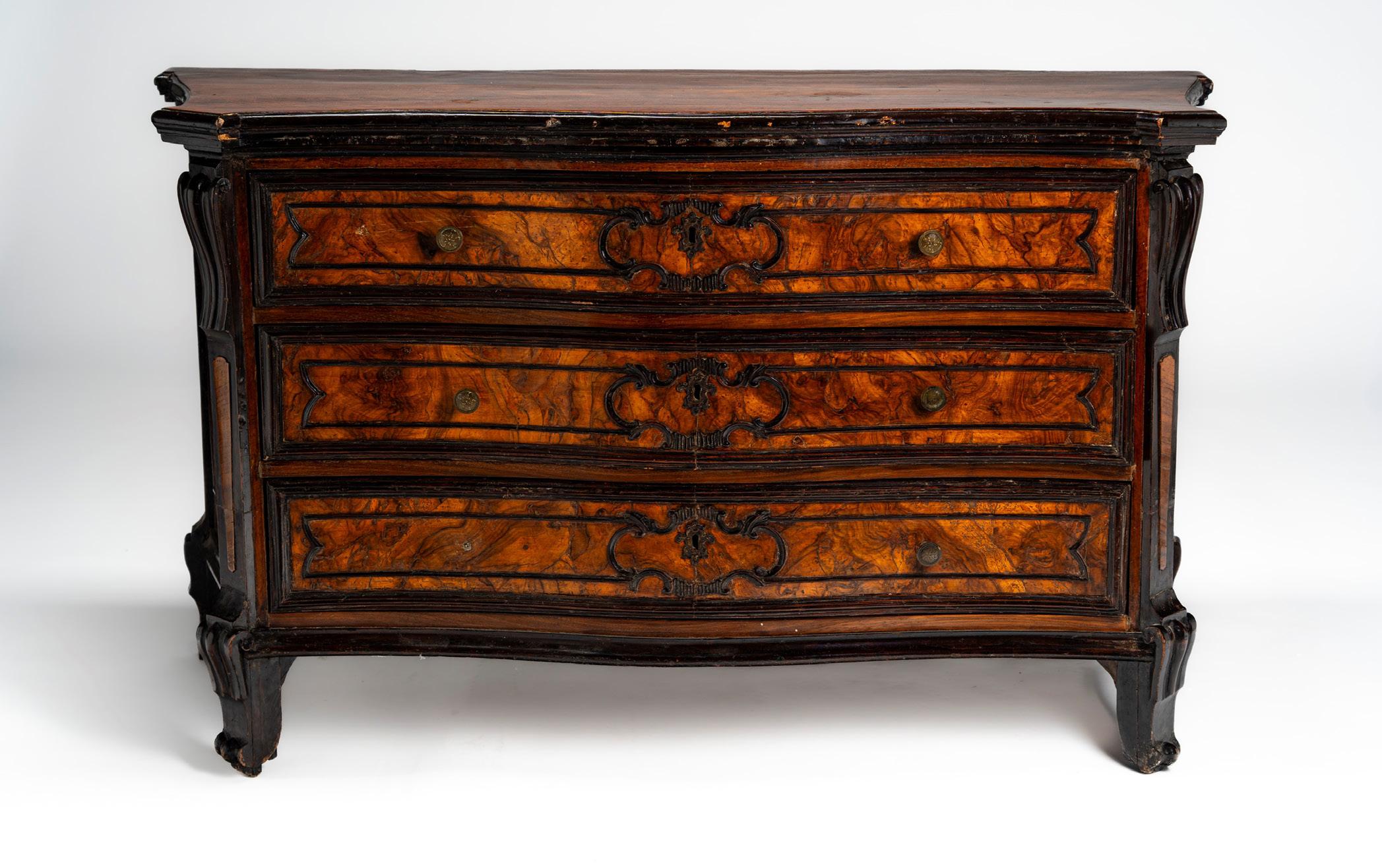 Cassettone lastronato in noce e radica di noce con fronte mosso a tre cassetti profilati da cornici in legno ebanizzato. Montanti a lesena terminante a voluta scanalata. Lombardia, secolo XVIII
