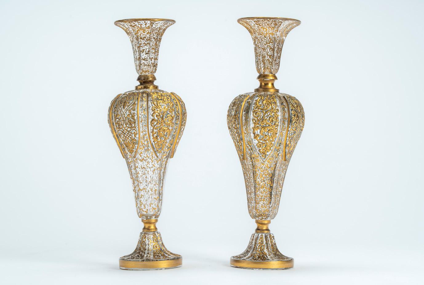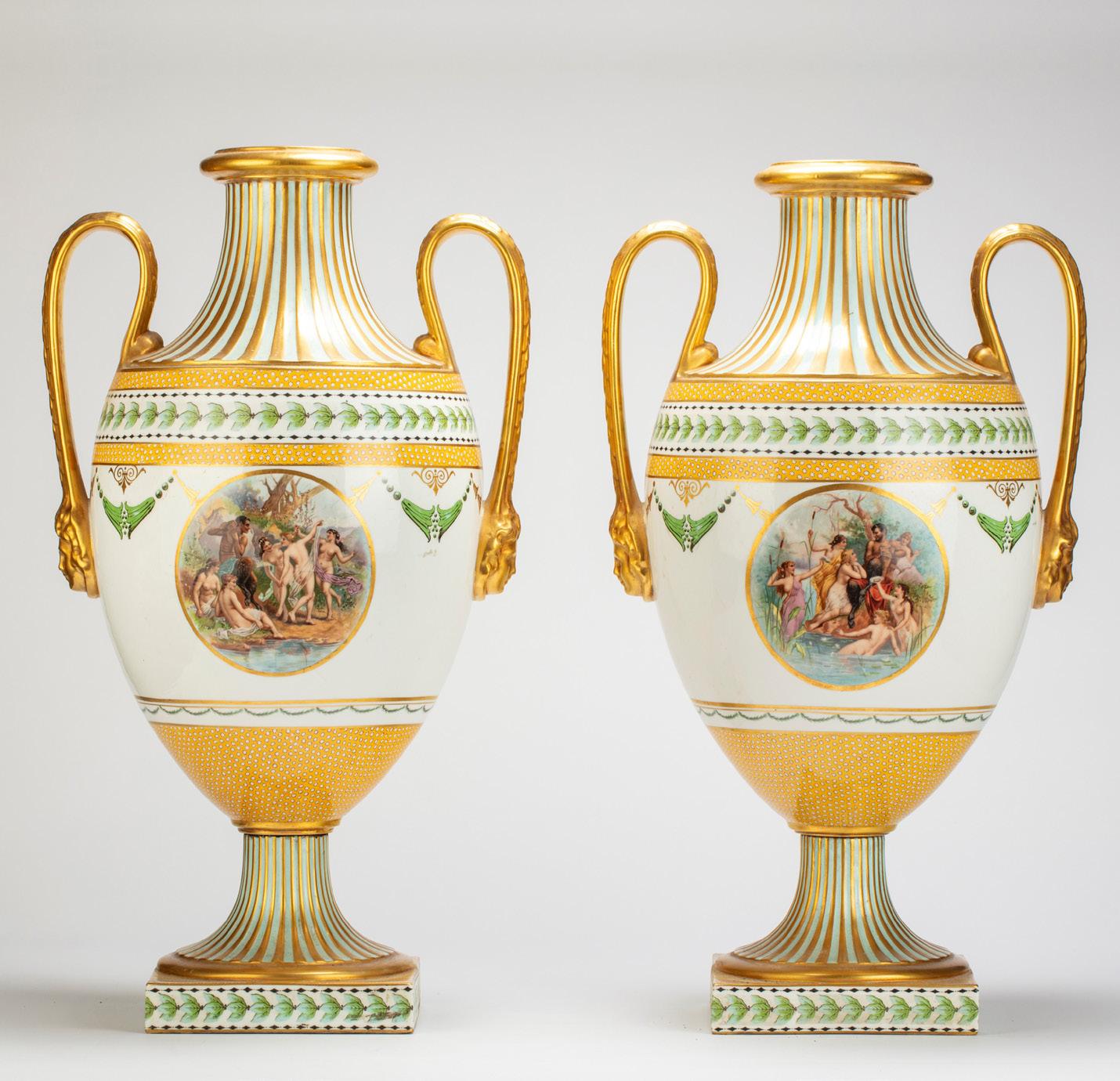 Coppia di vasi biansati ad anfora in porcellana a fondo oro e bordeaux con scene agresti policrome, su basi quadrate. Francia, prima metà Secolo XIX h cm 24