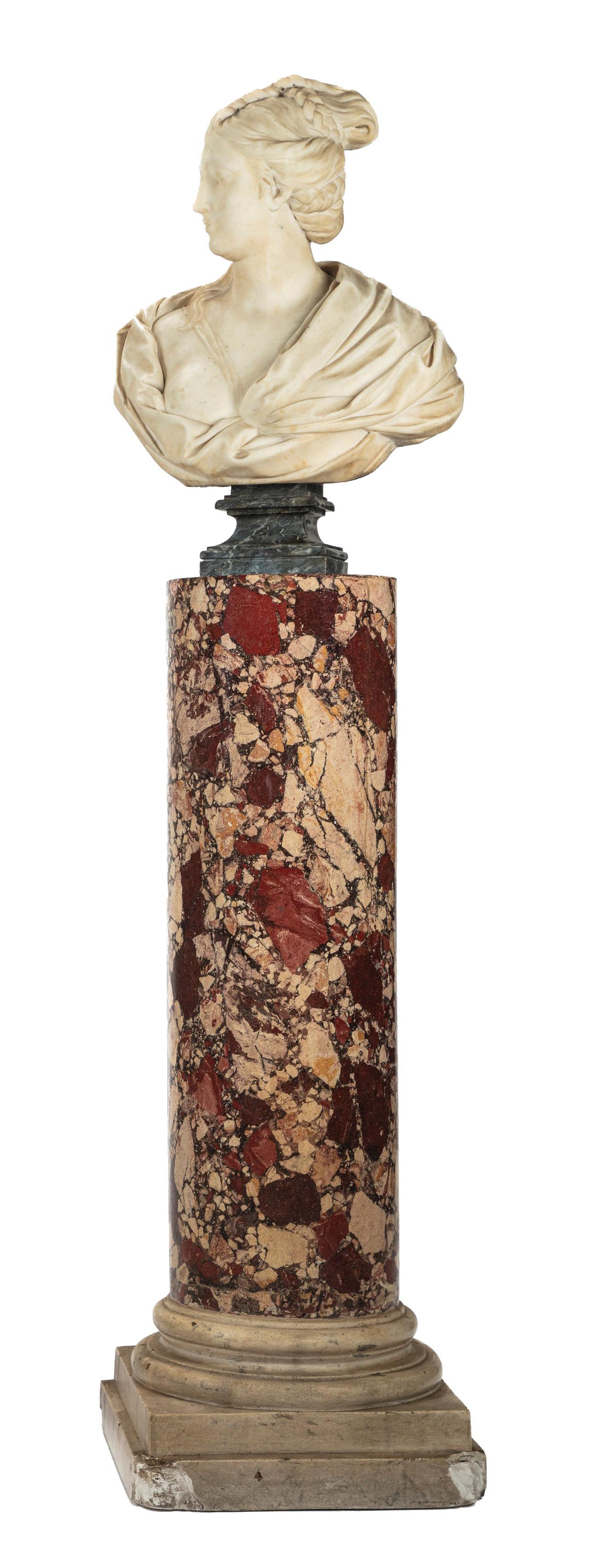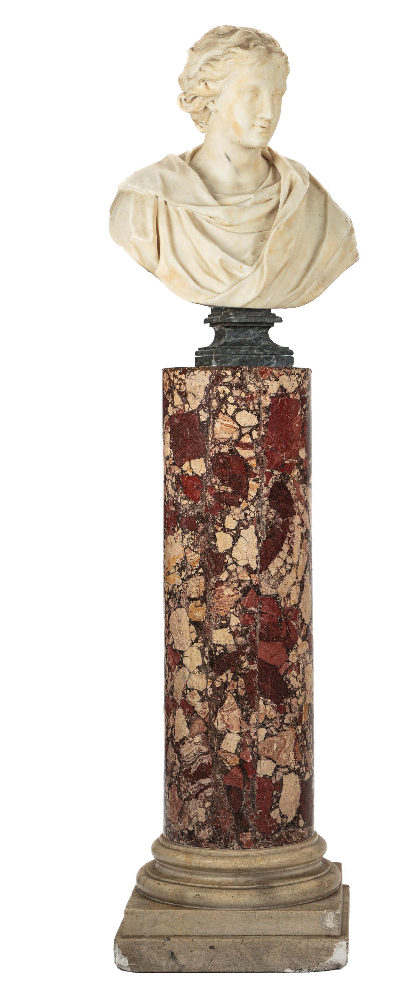 Due busti su basi a plinto in legno intagliato e dipinto raffiguranti San Filippo e San Simone, secolo XVIII-XIX h cm 76