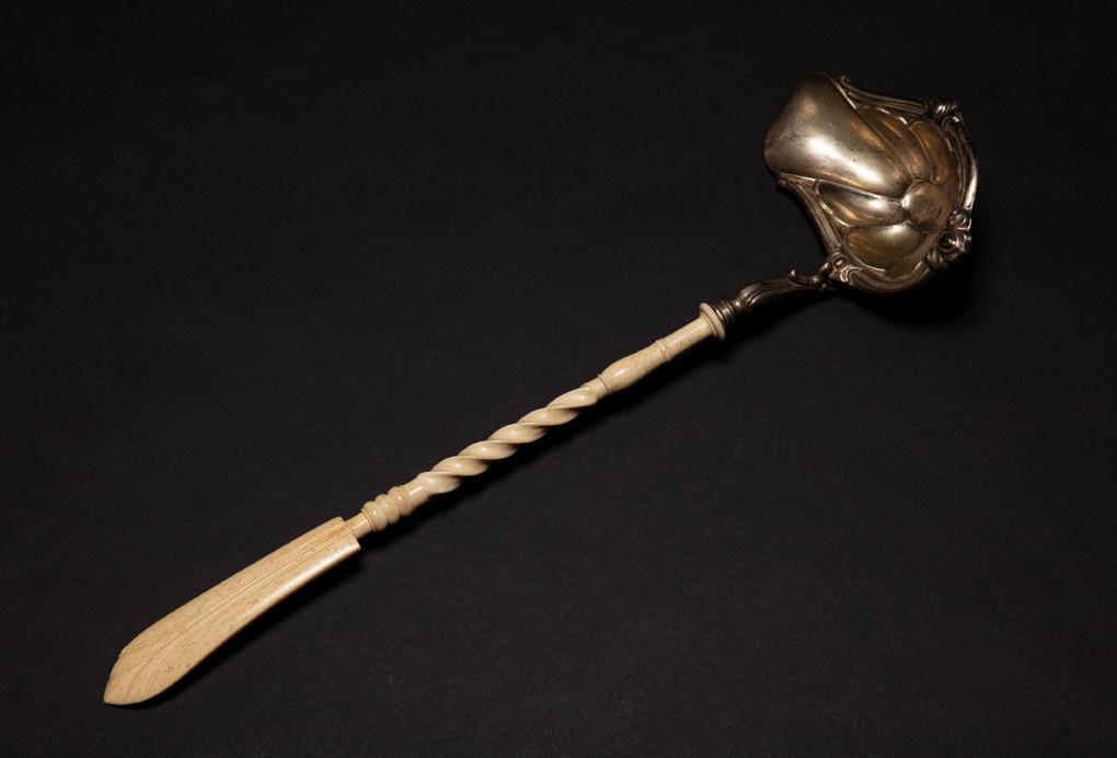 ☼ Mestolo per il punch in metallo argentato con manico in avorio tornito e intagliato a spirale. Secolo XIX