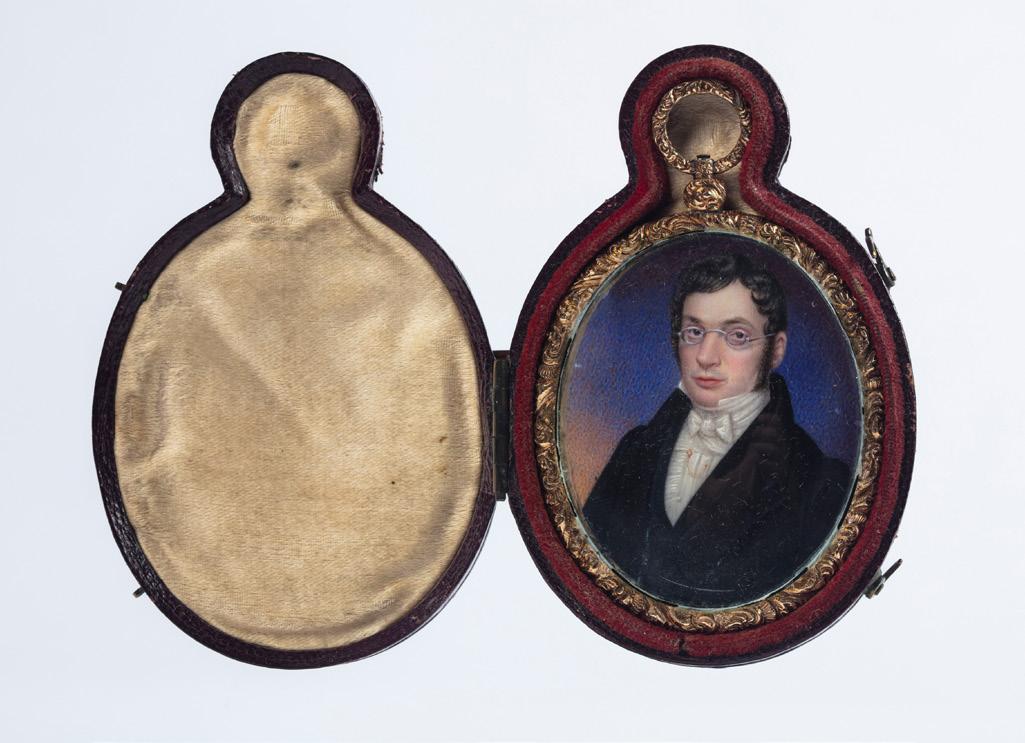 ☼ Doppia miniatura fronte e retro su avorio. Secolo XVIII/XIX, raffigurante gentiluomo con occhiali e gentildonna con cuffia a fiocchi e fiori, fili di perle e catena d’oro (cm 5x4) in cornice a pendente in lastra d’oro sbalzata e cesellato a volute (cm tot. 7,5x5). Entro custodia sagomata rivestita in cuoio.
