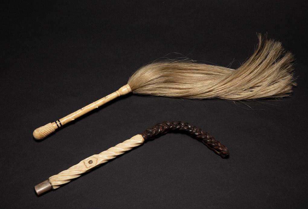 ☼ Lotto composto da un frustino in crine di cavallo con impugnatura in avorio intagliato terminante a soggetto egizio e una frusta in cuoio intrecciato con manico in avorio intagliato a spirale con stemma araldico centrale e finale in argento. Secolo XX l max cm 20 (solo manico in avorio del frustino)
