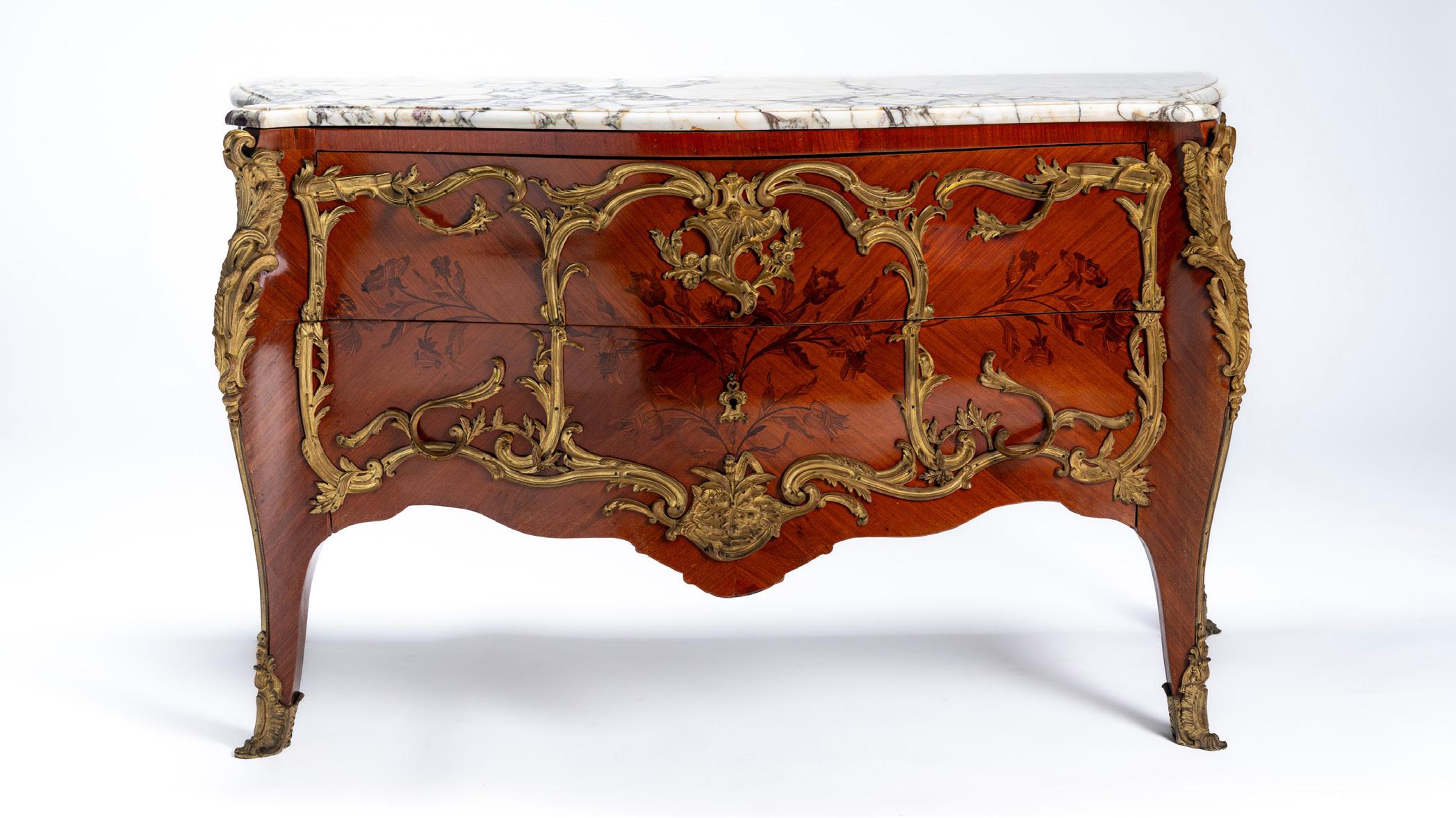 Commode di gusto francese Luigi XV di forma mossa e bombata impiallacciata e intarsiata a motivi floreali con ricche applicazioni in bronzo, fronte a due cassetti e piano in marmo bianco sagomato, inizio XX secolo. marmo cm 152x62; h tot 89,8 Difetti.