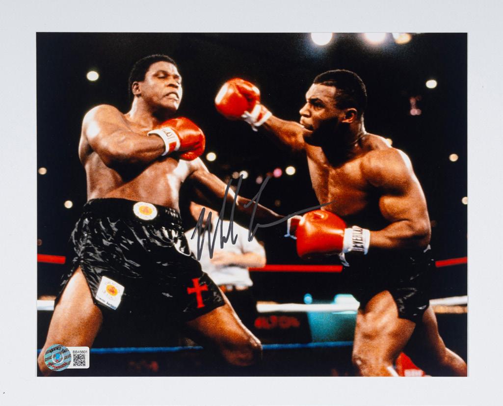 Foto autografata da Mike Tyson con dimensioni 21,5x 20 cm (8”x10” inch) e certificata dalla Beckett. Michael Gerard Tyson (New York, 30 giugno 1966) è un ex pugile statunitense, soprannominato “Iron Mike”, che è considerato uno dei migliori pugili di tutti i tempi, campione del mondo dei pesi massimi dal 1986 al 1990, con una breve parentesi nel 1996. Tyson vinse i suoi primi 19 incontri per KO, 12 dei quali alla prima ripresa. Nel 1986, all’età di 20 anni 4 mesi e 22 giorni, conquistò la corona WBC contro Trevor Berbick,[9] divenendo il più giovane campione del mondo dei pesi massimi, record che tuttora rimane imbattuto. Un anno dopo vinse anche i titoli WBA ed IBF, divenendo campione indiscusso ed il primo peso massimo ad unificare i campionati del mondo. Memorabili anche le sue sconfitte soprattutto quelle contro Evander Holyfield: passata alla storia la rivincita quando Tyson fu squalificato per aver morso le orecchie dell’avversario staccandogli un pezzo di cartilagine dell’orecchio destro.