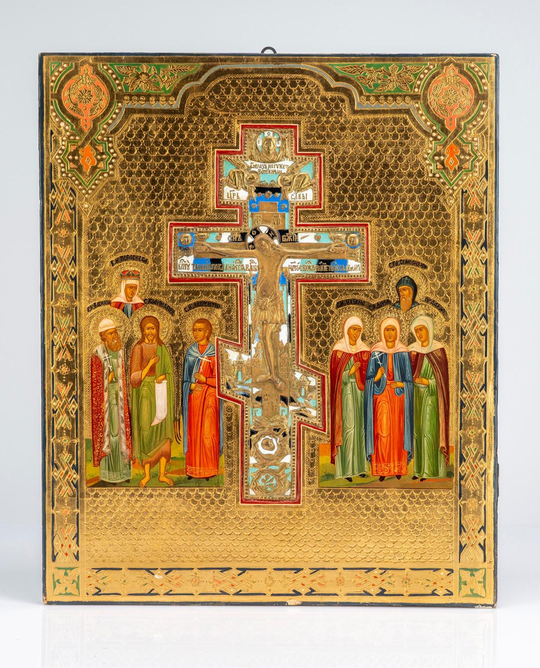 Nell’icona ra igurante Santi, dall’alto verso il basso compaiono: la Madonna di Kazan, san Nicola Taumaturgo, vescovi e Padri della Chiesa, san Giorgio, santa Anastasia, san Procopio, santa Giuliana e l’arcangelo Michele.