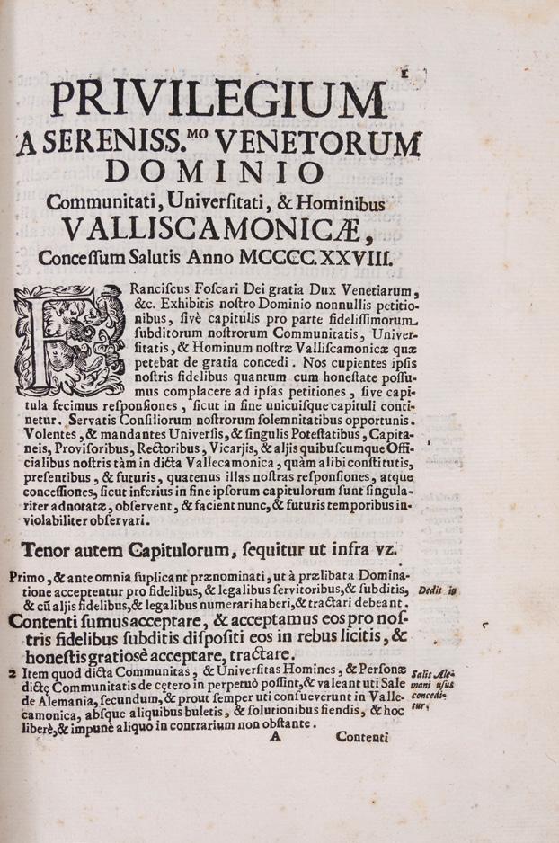 Documento pergamenaceo di 53 carte di cui due bianche (106 pp. in totale), in 4°, 255 x 170 mm., sottoscritto nel Palazzo Ducale di Venezia il 1 di ottobre 1509, in fine una Tabula Presentis Commissionis divisa in duas partes, prima carta con elegante bordura a motivi floreali dipinti in oro, rosso, verde, blu e violetto, tre medaglioni contenenti il Leone di Venezia, lo stemma della famiglia Moro, un’immagine di Cristo con un francescano, testo vergato in una elegantissima scrittura corsiva racchiusa entro uno specchio di scrittura rigato in rosso, legatura in pelle coeva con cornici a secco ai piatti e decorazioni in oro in stile Aldino, con palmette, fiori, losanghe etc.Ex libris al contropiatto: “Caroli Vicecomitis Caburri March.nis”.