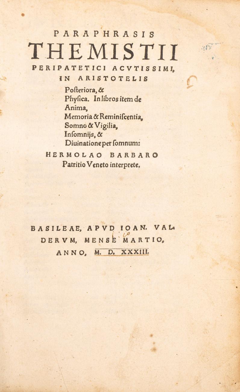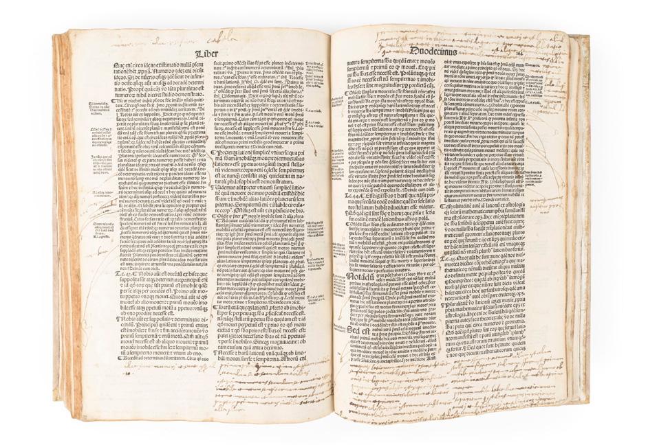 Venetiis: apud Iuntas, 1551 (Venetijs: apud haeredes Lucaentonij Iuntae, mense Ianuario 1551). In 2°. Al frontespizio Giglio fiorentino e iniziali L A circondati da ghirlanda sorretta da due putti, decine di diagrammi, figure, schemi e piccole illustrazioni nel testo. Legato con. S.Thomae Aquinatis In Libros Aristotelis De Coelo et Mundo Commentaria. Venezia, apud Iuntas, 1551. Giglio fiorentino con iniziali al frontespizio, diagrammi e figure xilografiche, ottimo esemplare. legatura coeva in cartone ricoperto di pergamena.