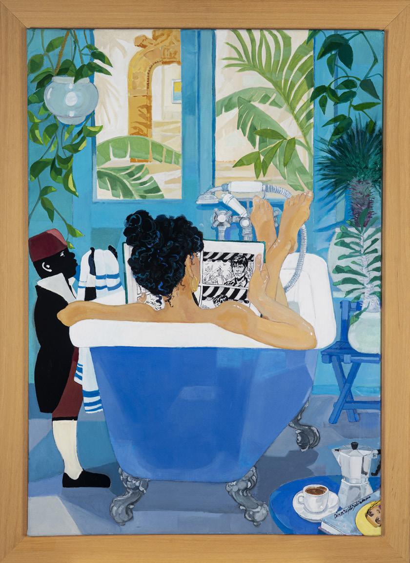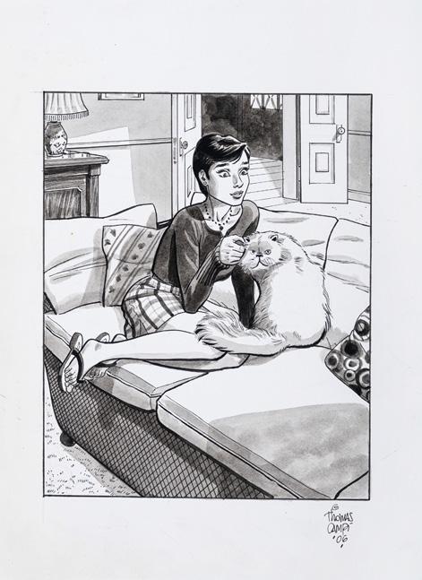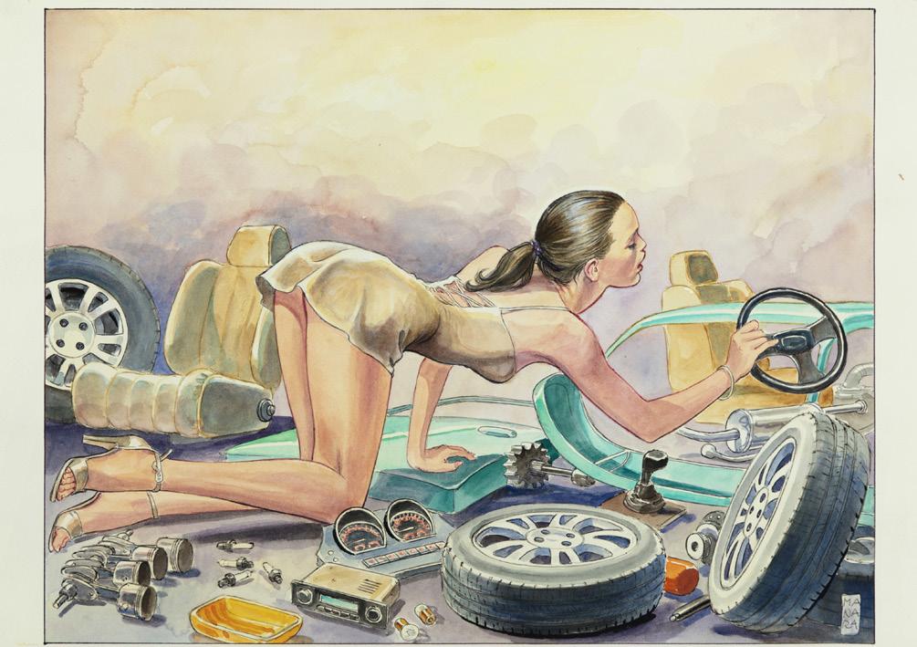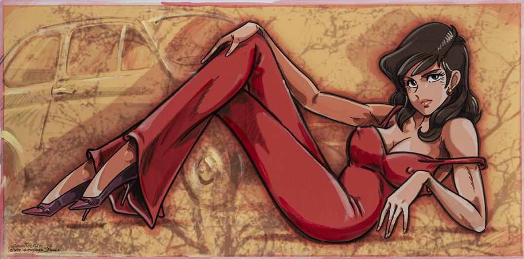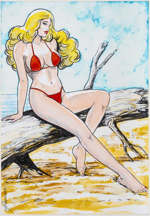 Illustrazione originale realizzata da Frollo durante gli anni ‘80 per la sua Mona Street. Siamo nella Boston degli anni Venti del Novecento, Mona Street è una scaltra fanciulla da poco uscita dal college, curve morbide candidamente ostentate, un viso innocente dallo sguardo ironico e un sorriso appena accennato sulle labbra. L’ammiccamento malizioso c’è già nel nome, dunque, ma tutte le storie di Mona sono sottese di ammorbante erotismo, ingegnosamente narrate dall’autore. Firmata.