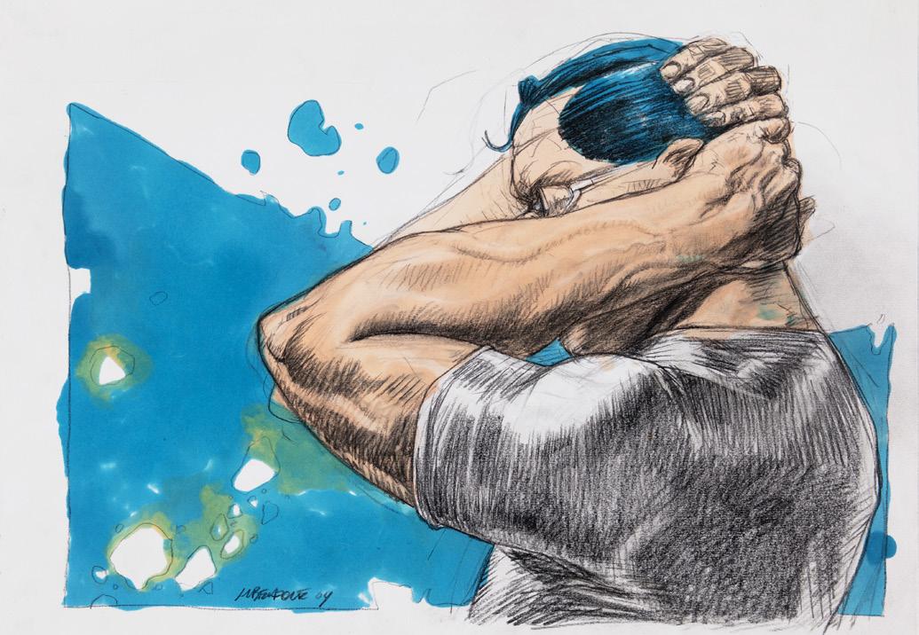 Charcoal and watercolor on paper applied to thin cardboard. Original illustration made by Liberatore in 2009 and published in the volume “Ranx” by Glenat in 2010. A splendid portrait of the character that made Liberatore an undisputed master of international comics. Signed and dated.