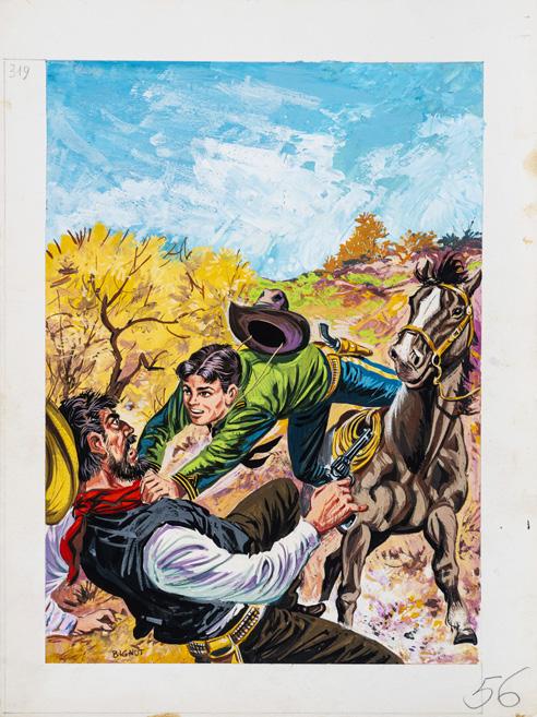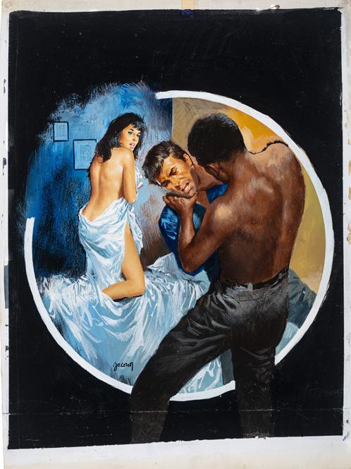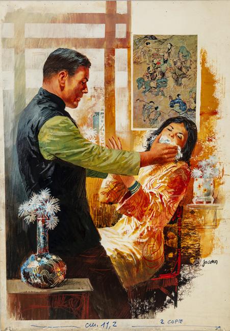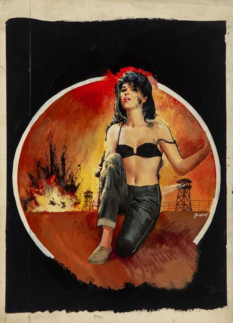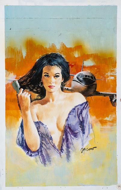 Tempera on cardboard. Original cover made by Jacono for “OS 117: qua la mano, Sagarra” by Josette Bruce, published in the famous Segretissimo series n. 456 by Mondadori in 1972. Posting holes in the margins. Signed.