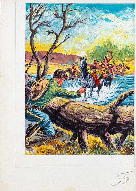 Originale di copertina realizzato da Uberti per “Luna Sorgente in pericolo”, edito su Gli albi di Kinowa n. 34 dalla Editrice Dardo nel 1965. Fori di affissione ai margini, segni di umidità e ondulatura della carta. Firmato.