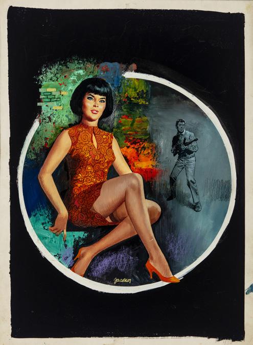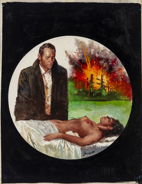 Originale di copertina realizzato da Jacono per “OS 117: qua la mano, Sagarra” di Josette Bruce, edito nella celebre collana Segretissimo n. 456 dalla Mondadori nel 1972. Fori di affissione ai margini. Firmato.