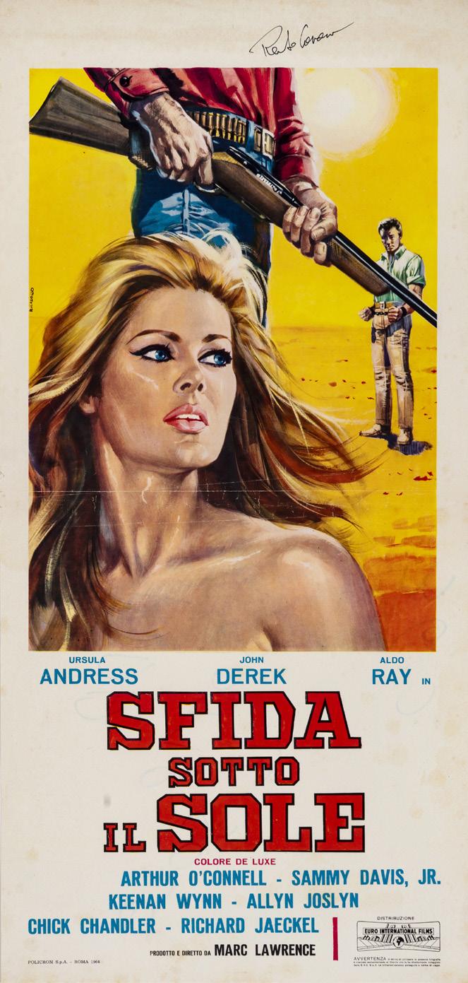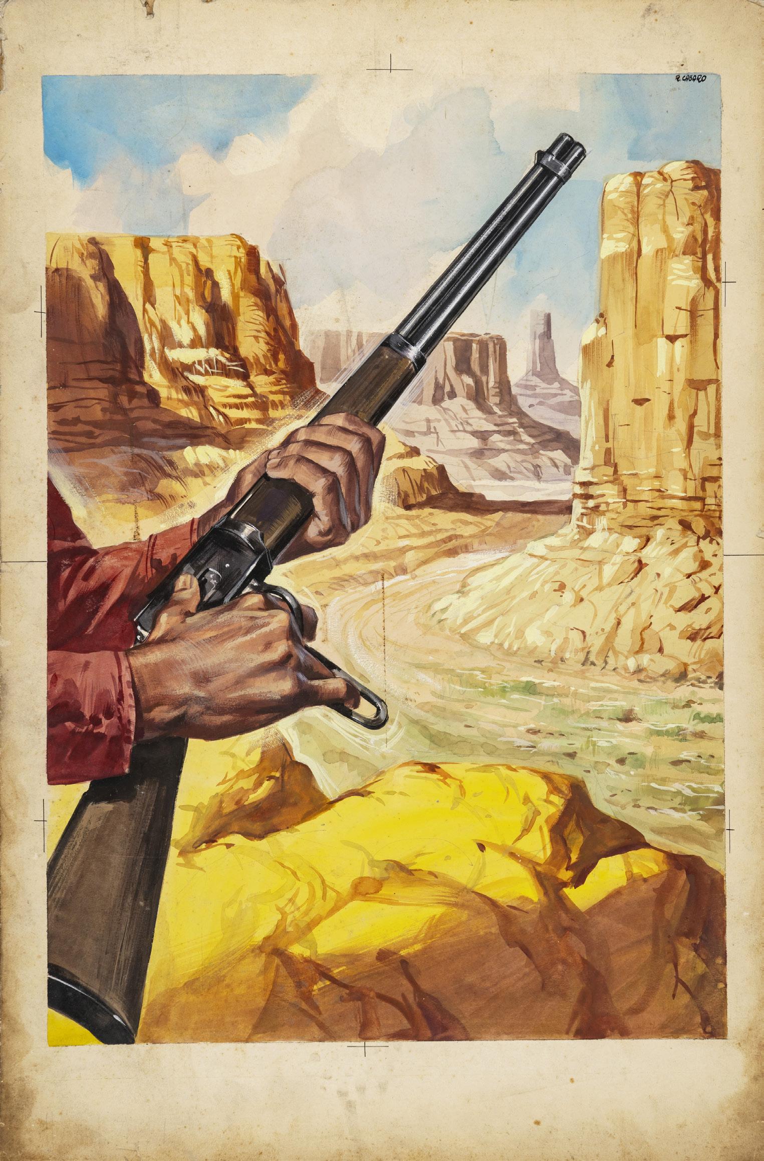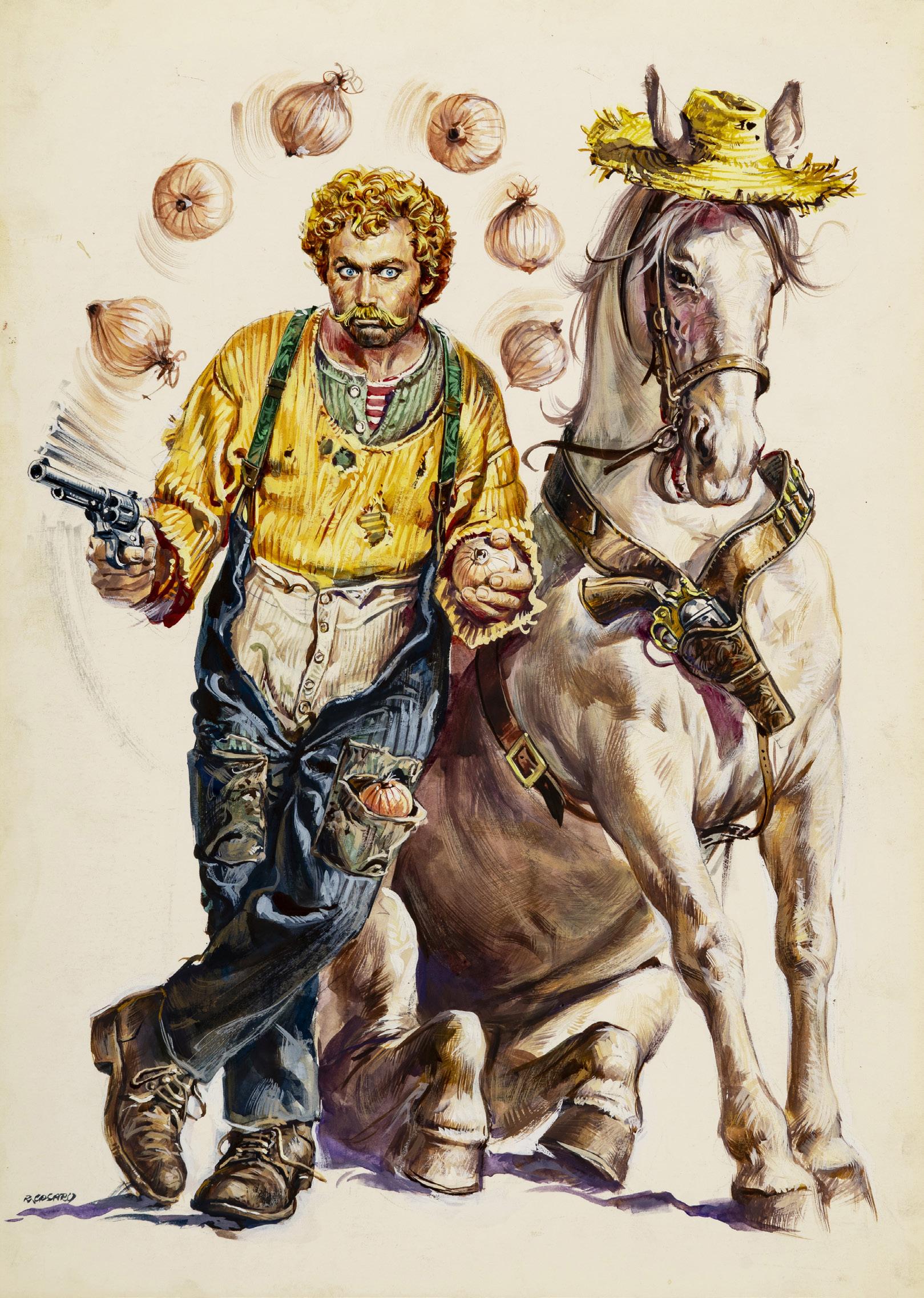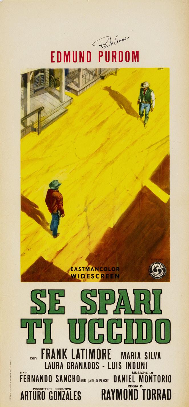 Tempera on cardboard. Original artwork made by Casaro for the movie poster of “The Last Ride to Santa Cruz”, directed by Rolf Olsen with Edmund Purdom and Klaus Kinski in 1964. Signed.
