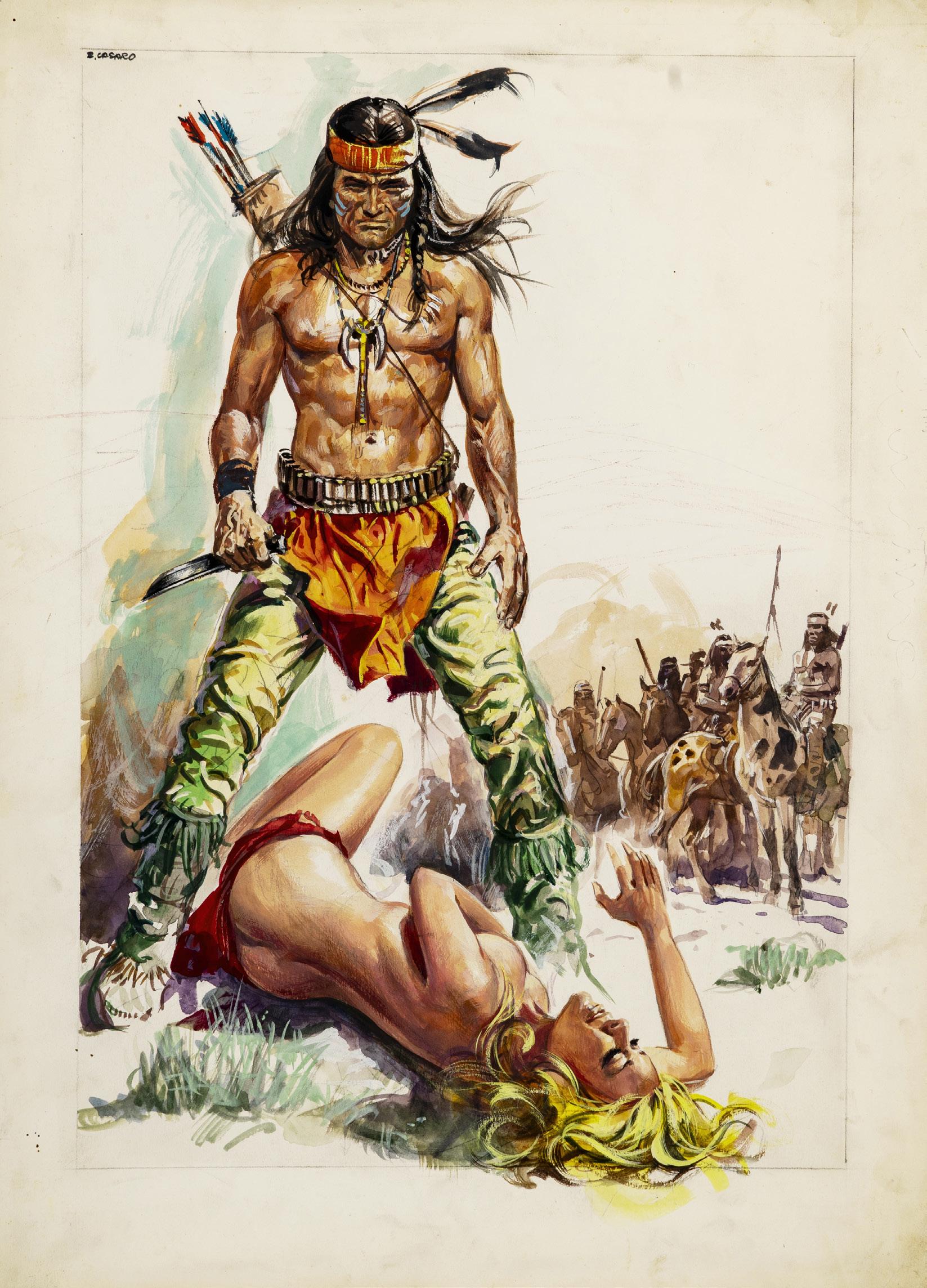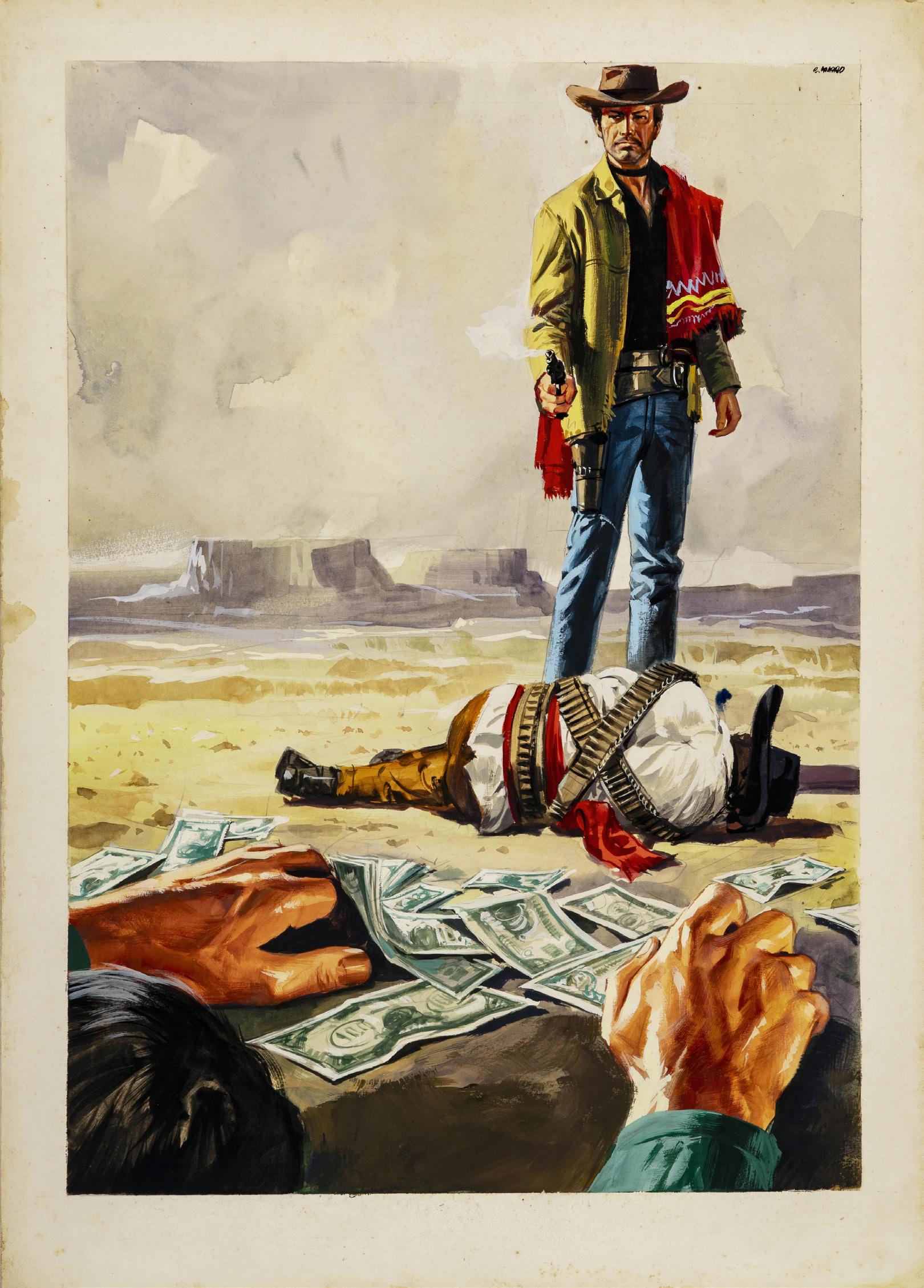 Tempera on cardboard. Original artwork made by Casaro for the movie poster of “Bandidos”, directed by Massimo Dallamano (under the pseudonym Max Dillman) and starring Enrico Maria Salerno in 1967. Slight creases at the top corners. Signed.