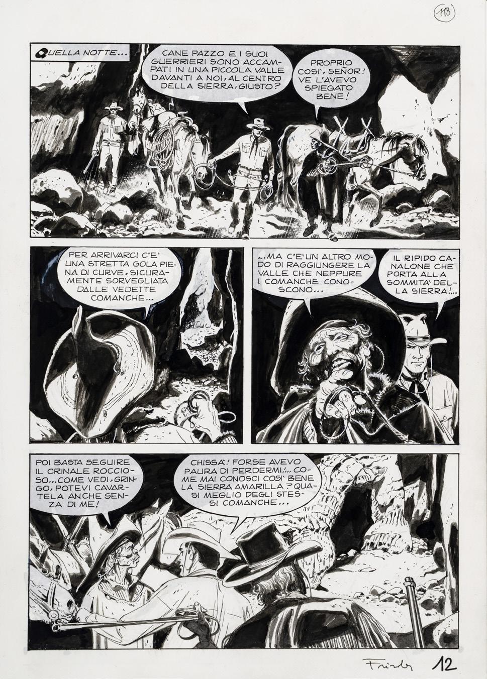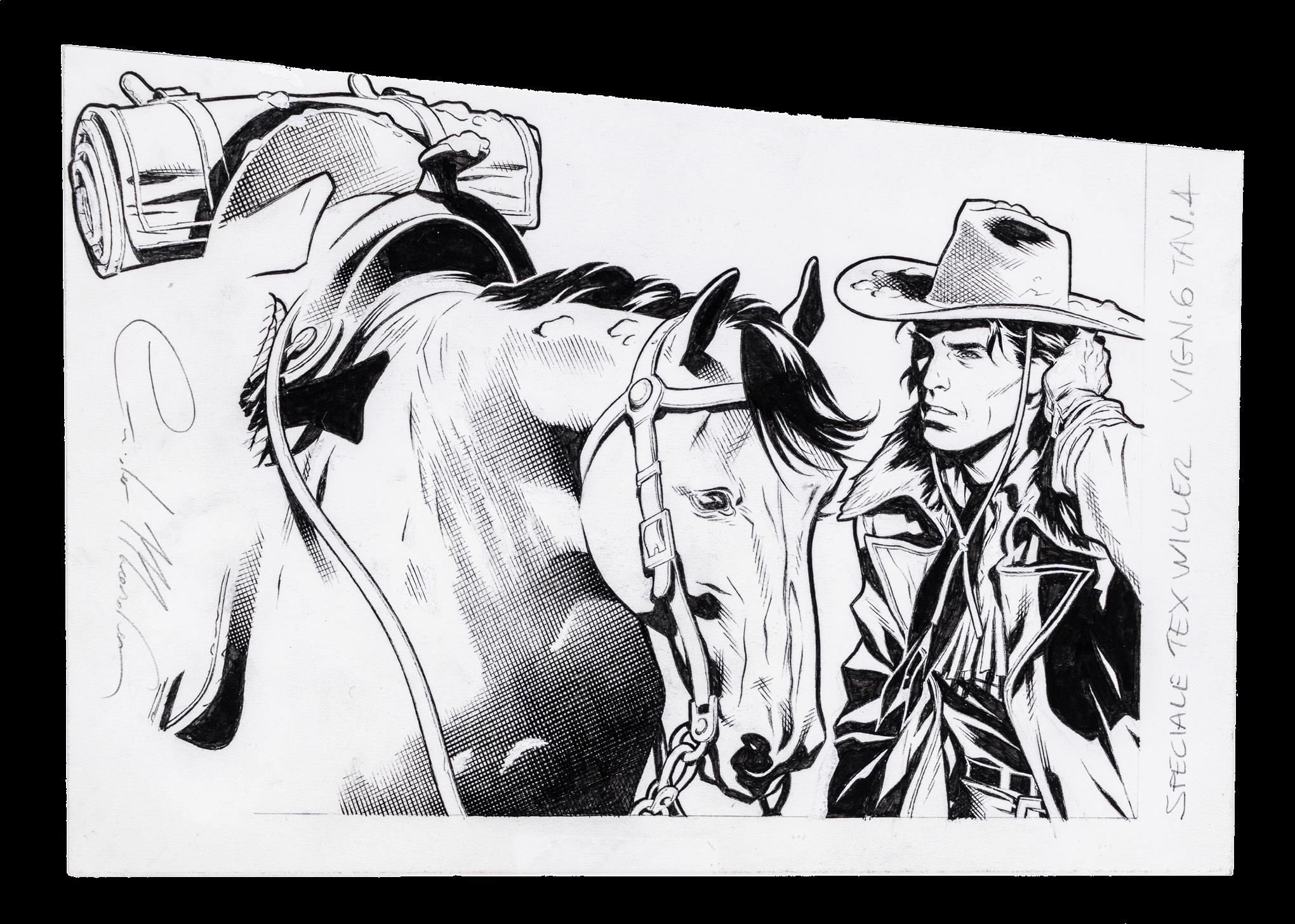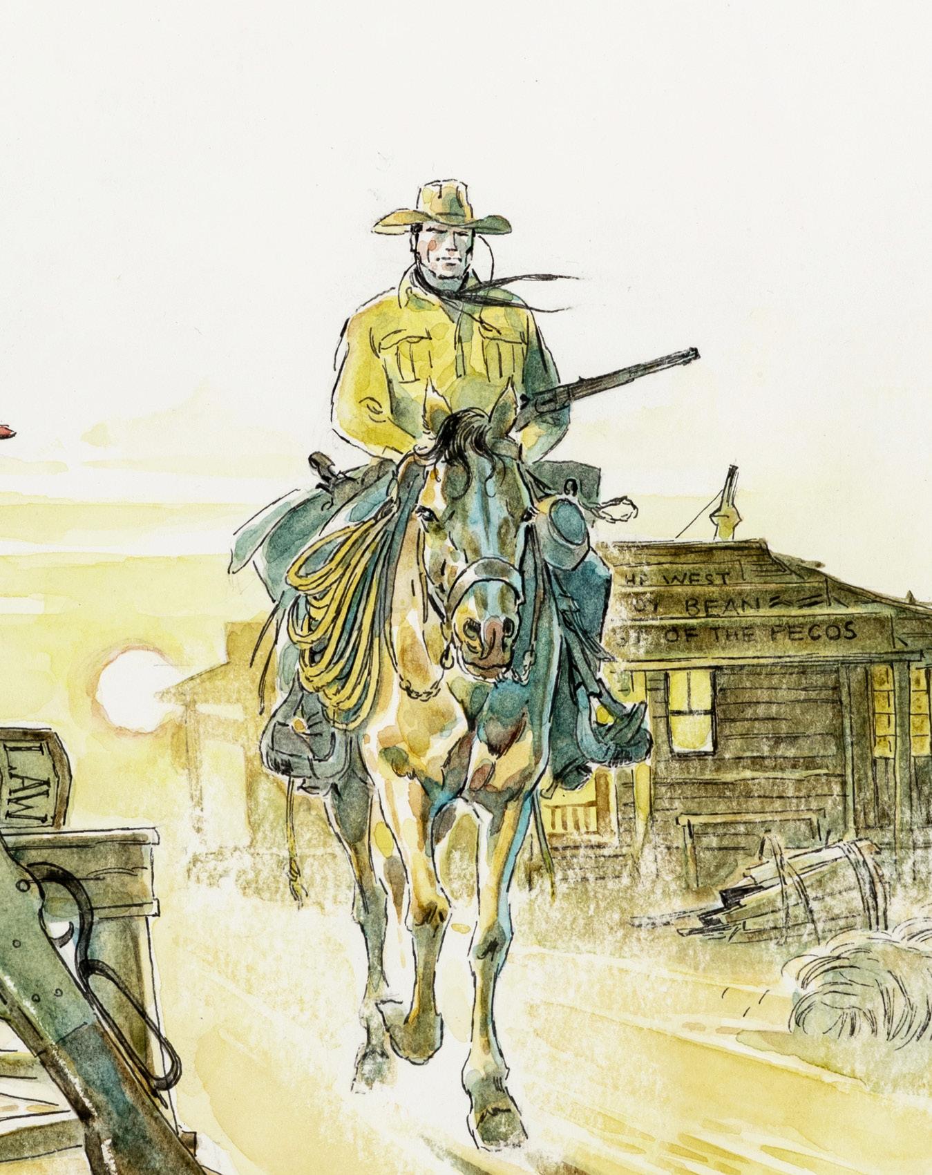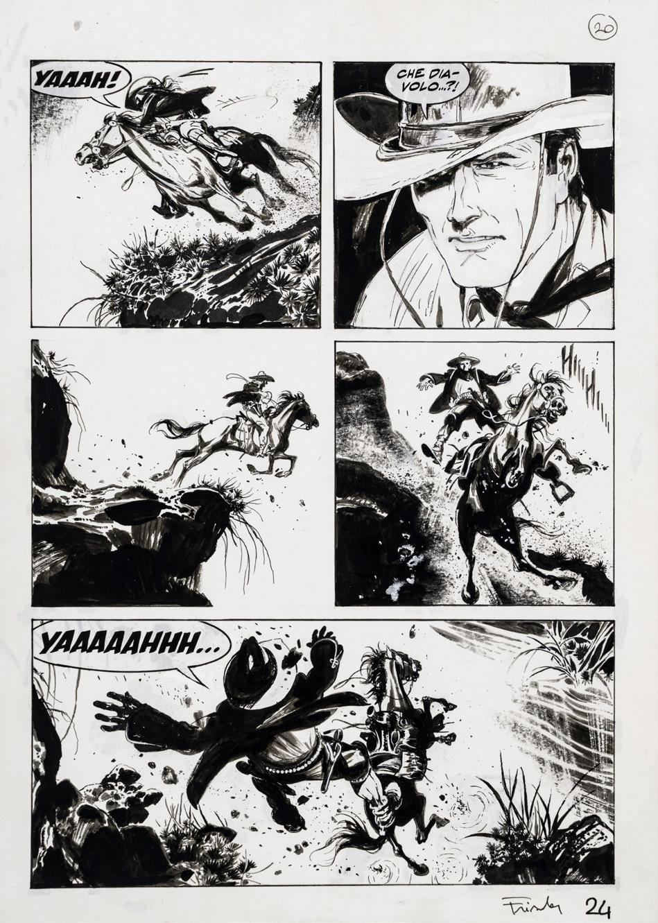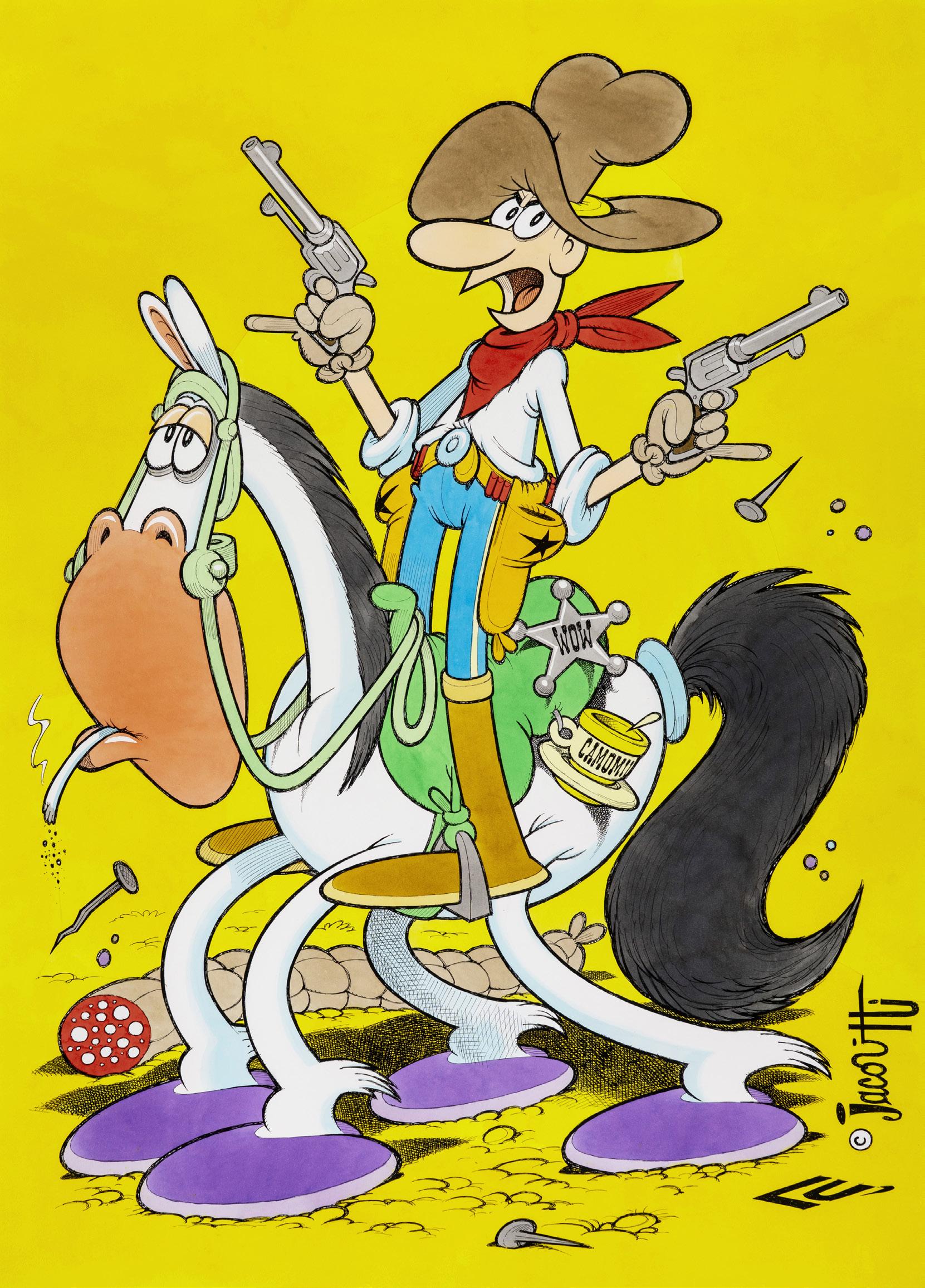 Pencil, ink and watercolor on cardboard. Original illustration made by Carnevali for the Ronfi series in the mid-1980s. Slight dent in the upper right corner. Signed.