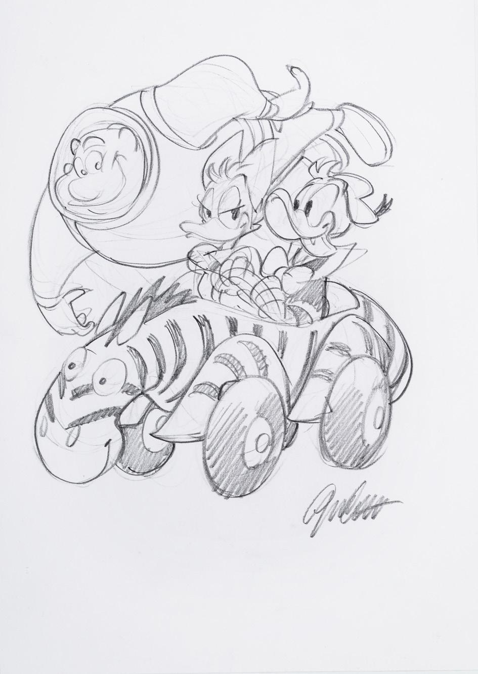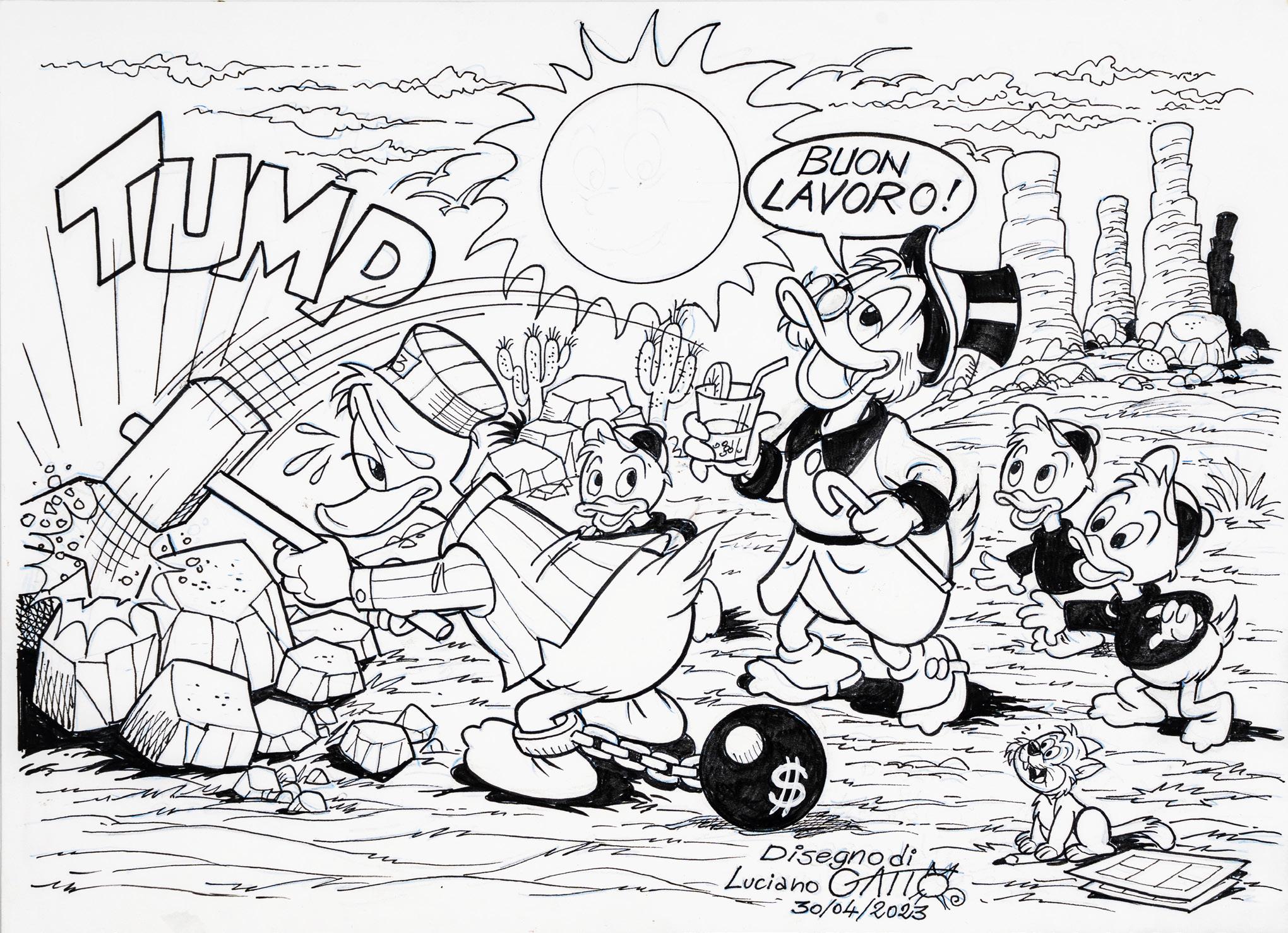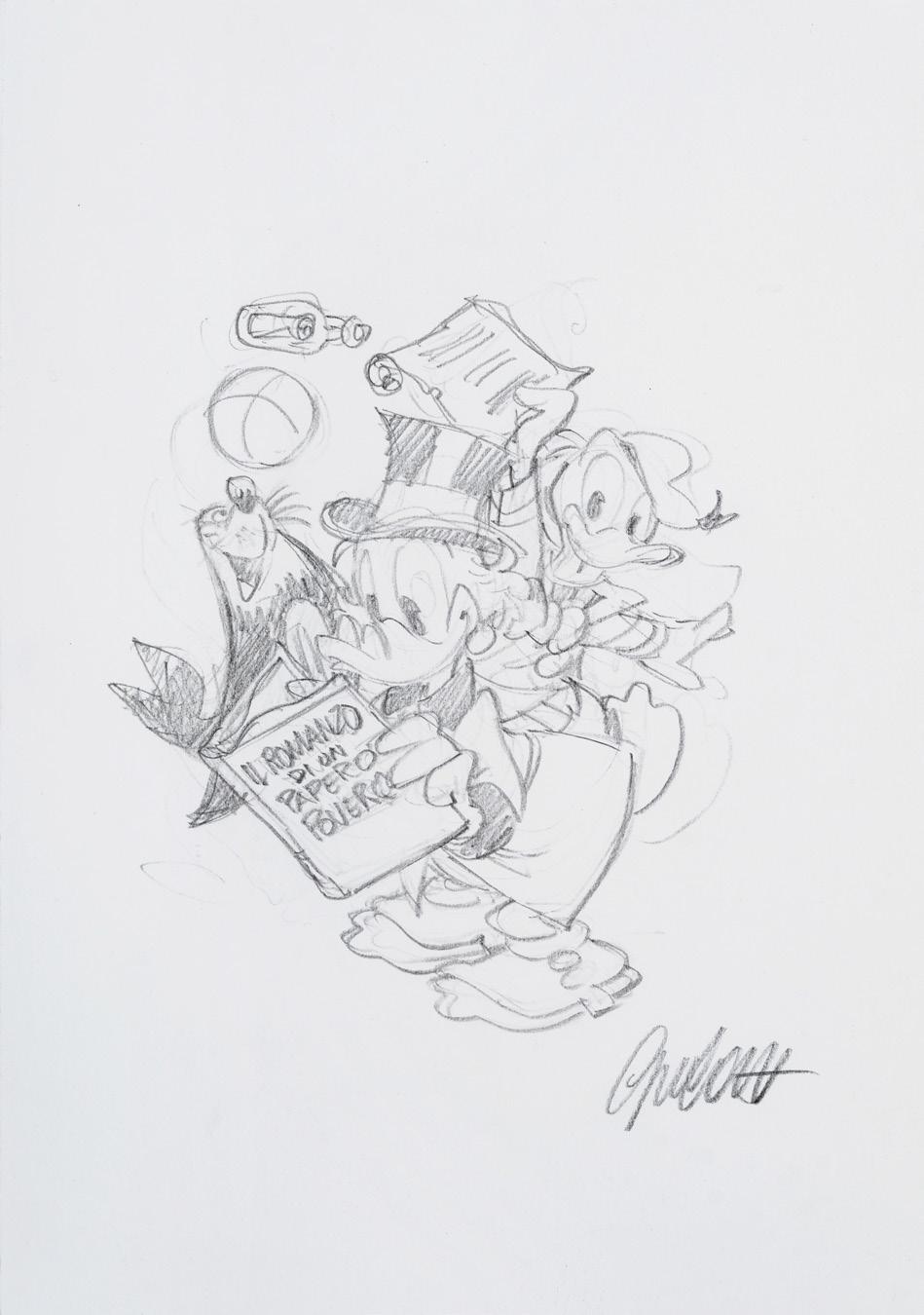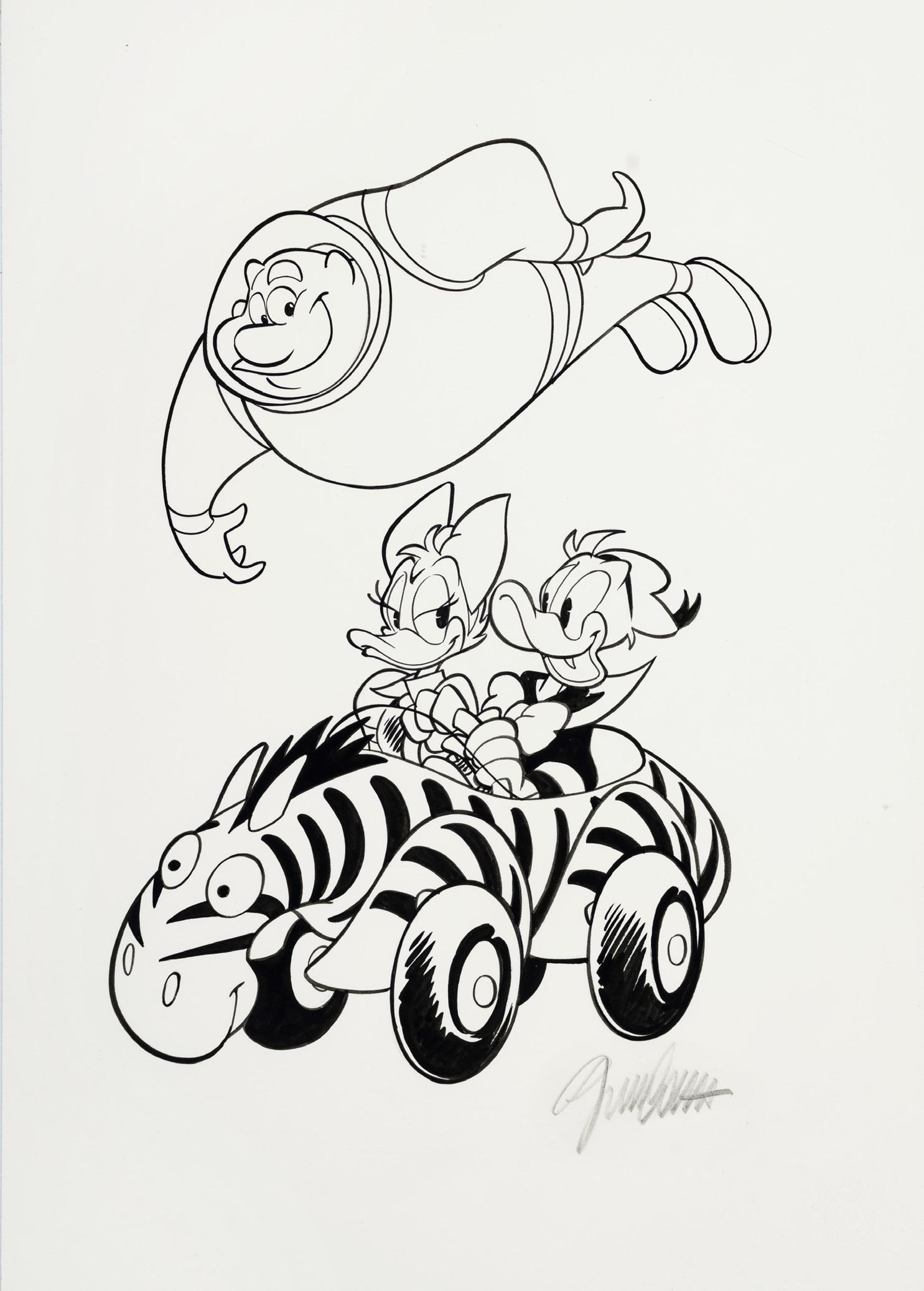 Pencil and ink on thin cardboard. Original illustration made by Ziche for the series “What’s the air like in... Paperopoli?”, published in Topolino n. 3542 on page 3 in October 2023.
