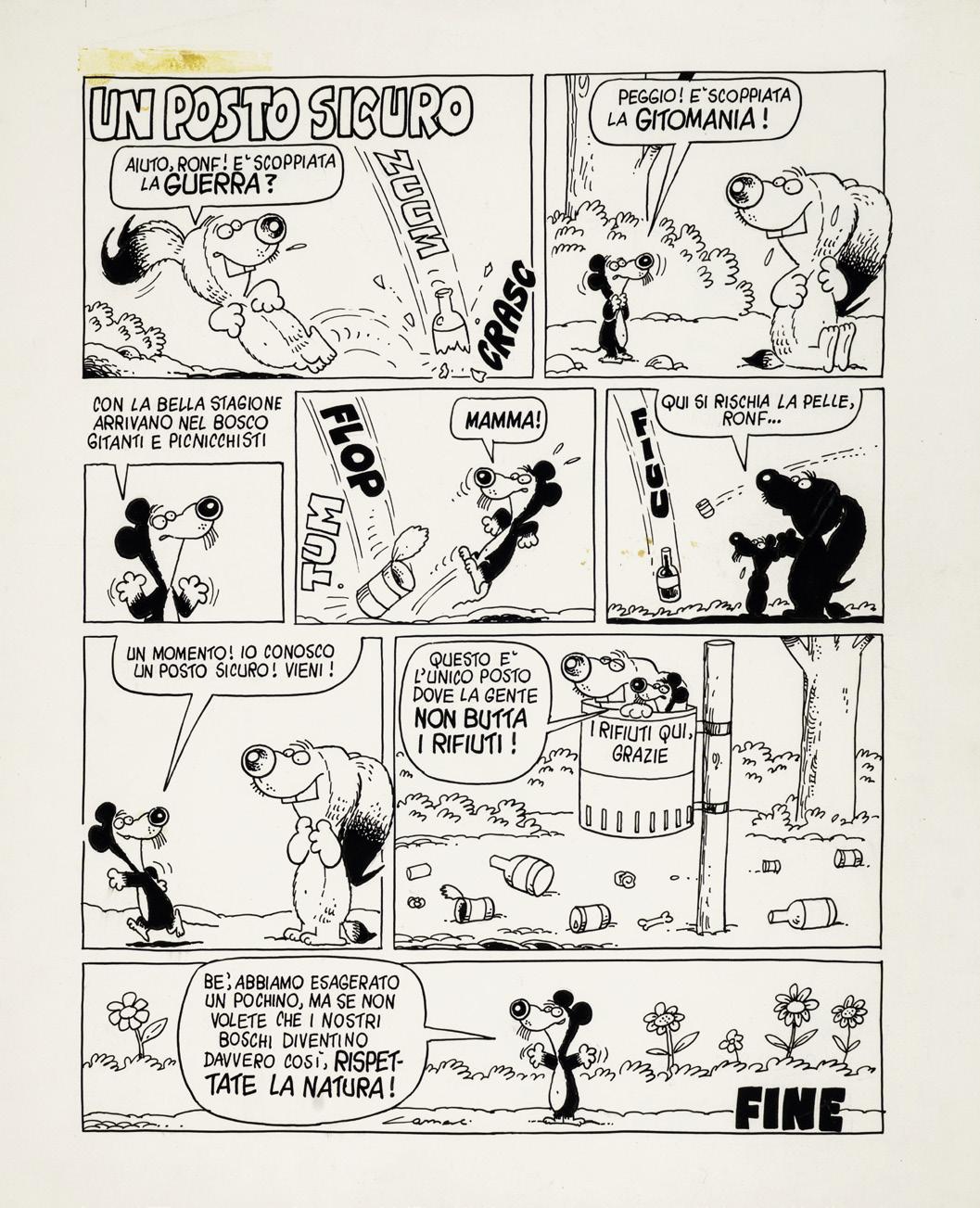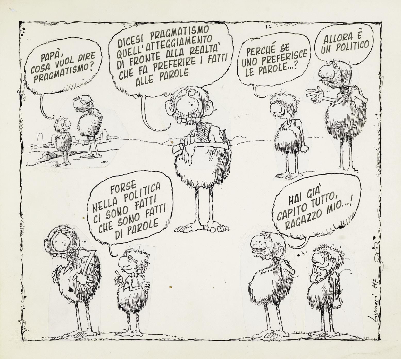 Pencil, ink and collage on thin cardboard. Original comic strip n. 102 made by Lunari for “Girighiz” in 1967. The series takes its name from the protagonist Girighiz, a prehistoric caveman grappling with everyday problems that serve as a pretext for a social and political critique of modern issues. Signed and numbered.