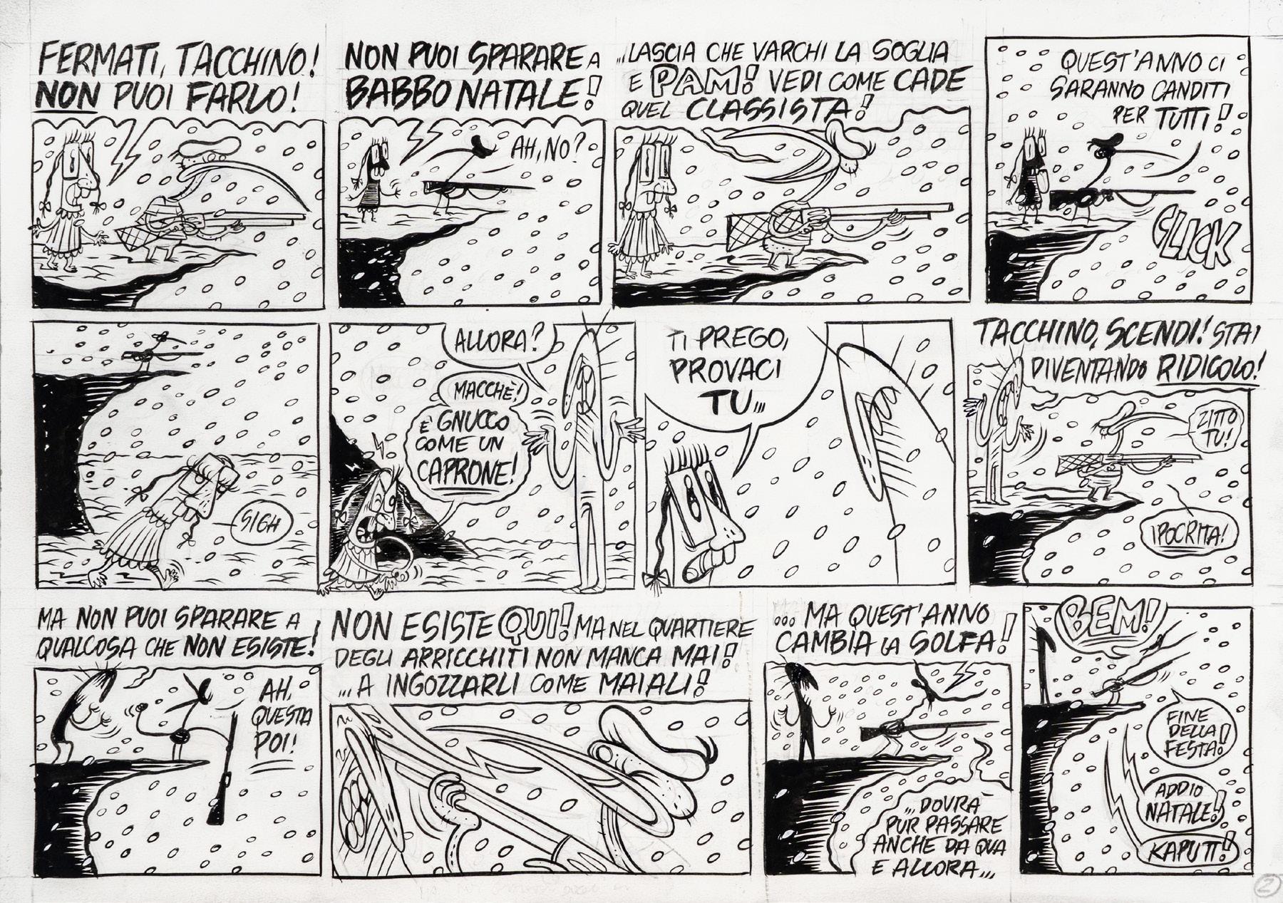 Pencil and ink on thin cardboard. Original comic art made by Carnevali for the Ronfi series in the mid-1980s. Creases.