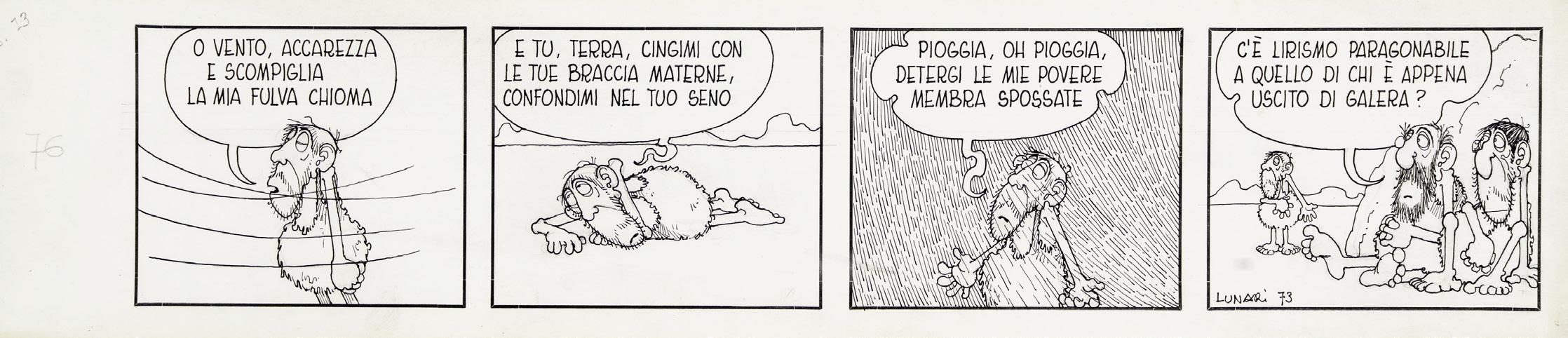 Pencil and ink on thin cardboard. Original strip n. 73 made by Lunari for “Girighiz” in 1966. The series takes its name from the protagonist Girighiz, a prehistoric caveman grappling with everyday problems that serve as a pretext for a social and political critique of modern issues. Signed and numbered.