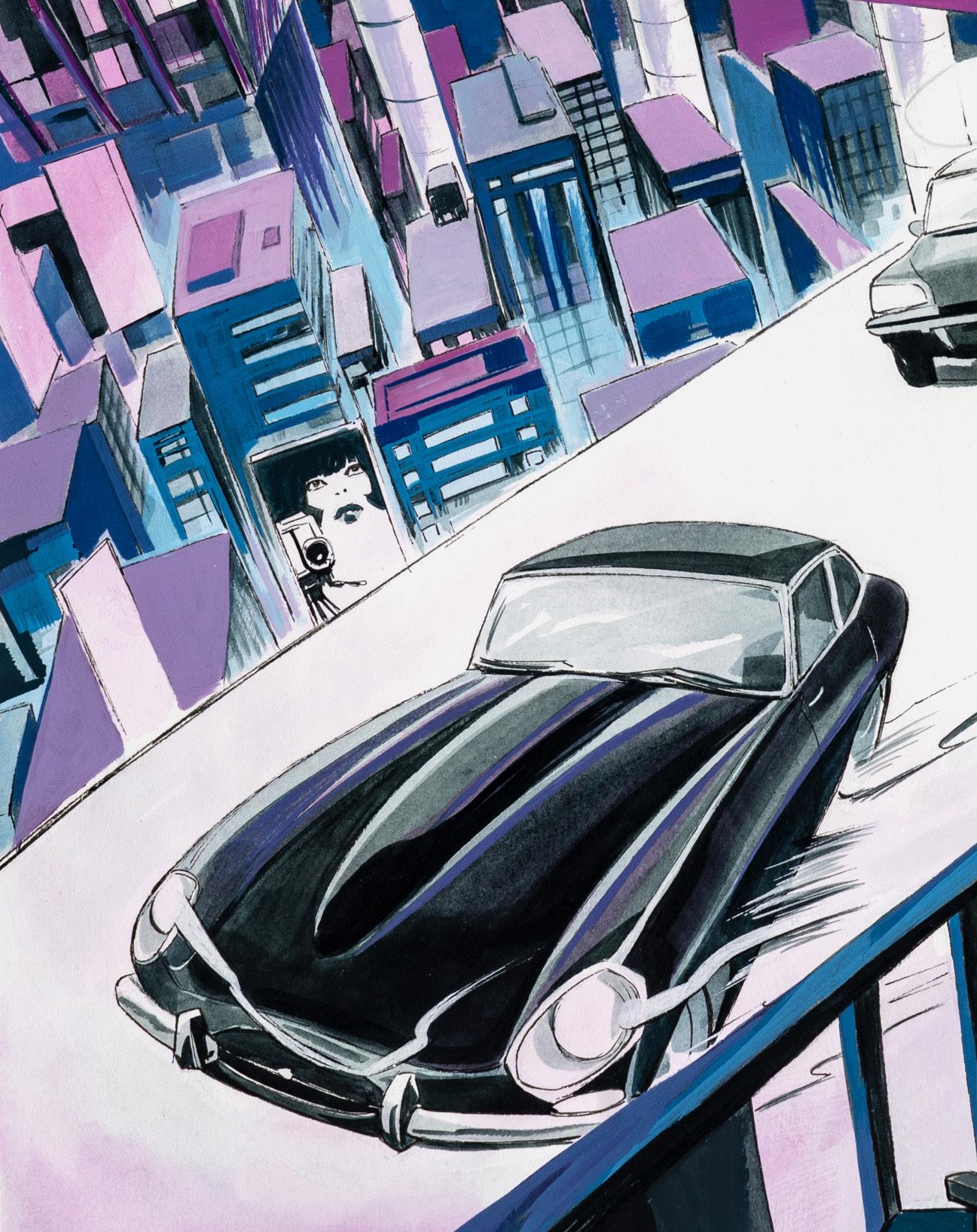 Pastel and ink on thin cardboard. Original comic art made by Bacilieri for the comic book adaptation of Giorgio Scerbanenco’s novel “Venere privata,” first published in Linus magazine and subsequently published in volume form by Oblomov Edizioni in 2022. Signed.