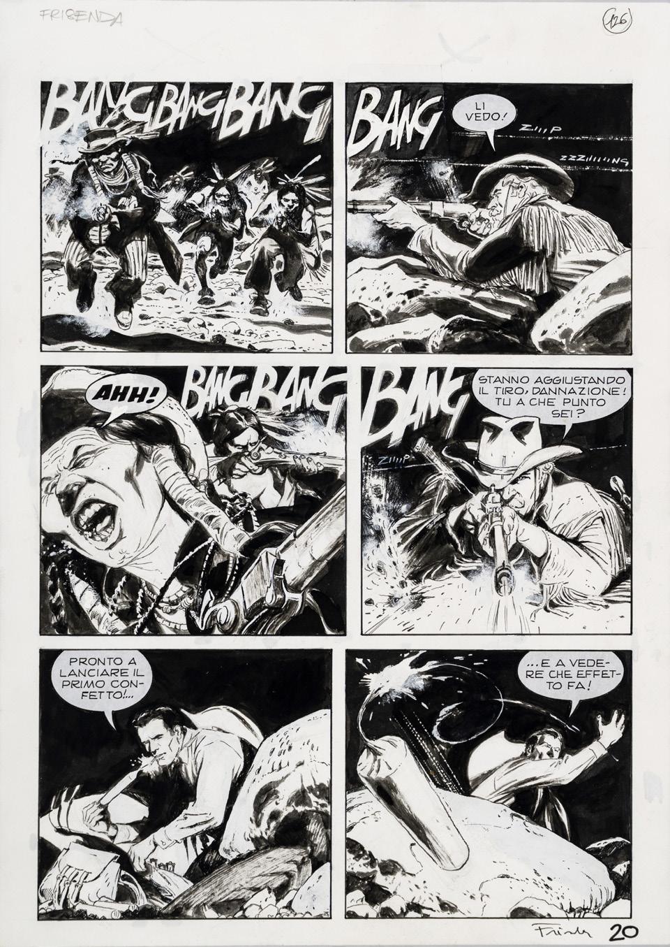 Tavola originale n. 117 realizzata da Lunari per “Girighiz” nel 1967. La serie prende il nome dal protagonista Girighiz, un cavernicolo della preistoria alle prese con problemi quotidiani che sono un pretesto per rivolgere una critica sociale e politica ai temi moderni. Foro all’angolo superiore sinistro. Firmata e numerata.