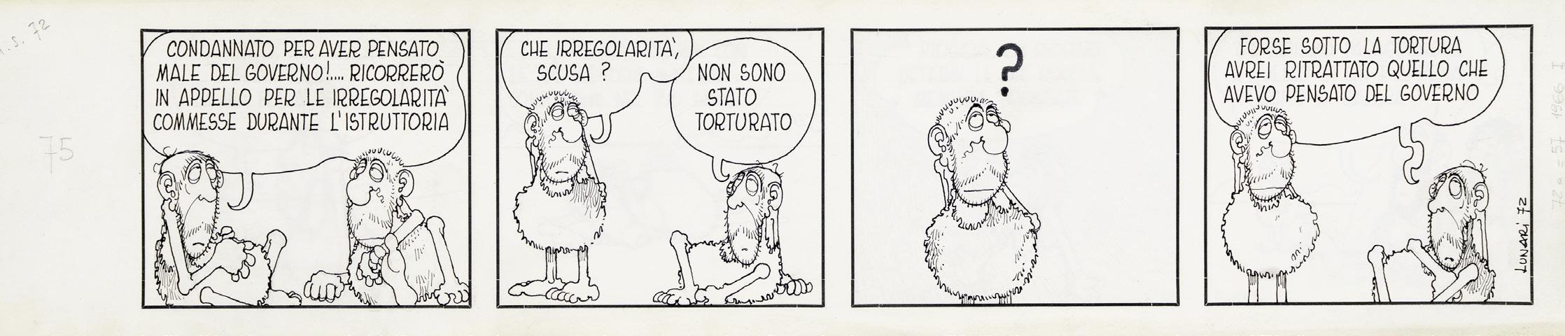 Pencil and ink on thin cardboard. Original strip n. 72 made by Lunari for “Girighiz” in 1966. The series takes its name from the protagonist Girighiz, a prehistoric caveman grappling with everyday problems that serve as a pretext for addressing social and political critique of modern issues. Signed and numbered.