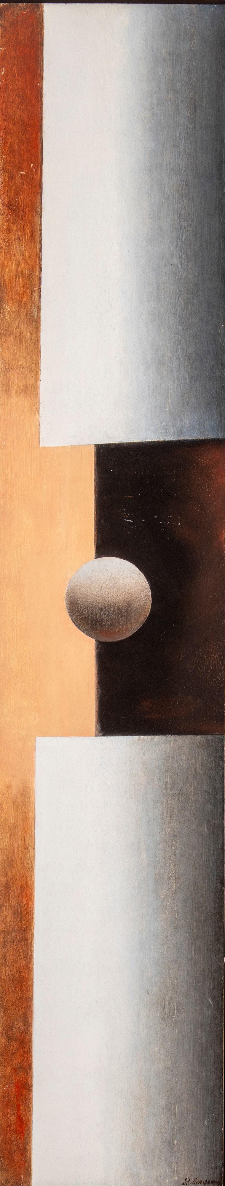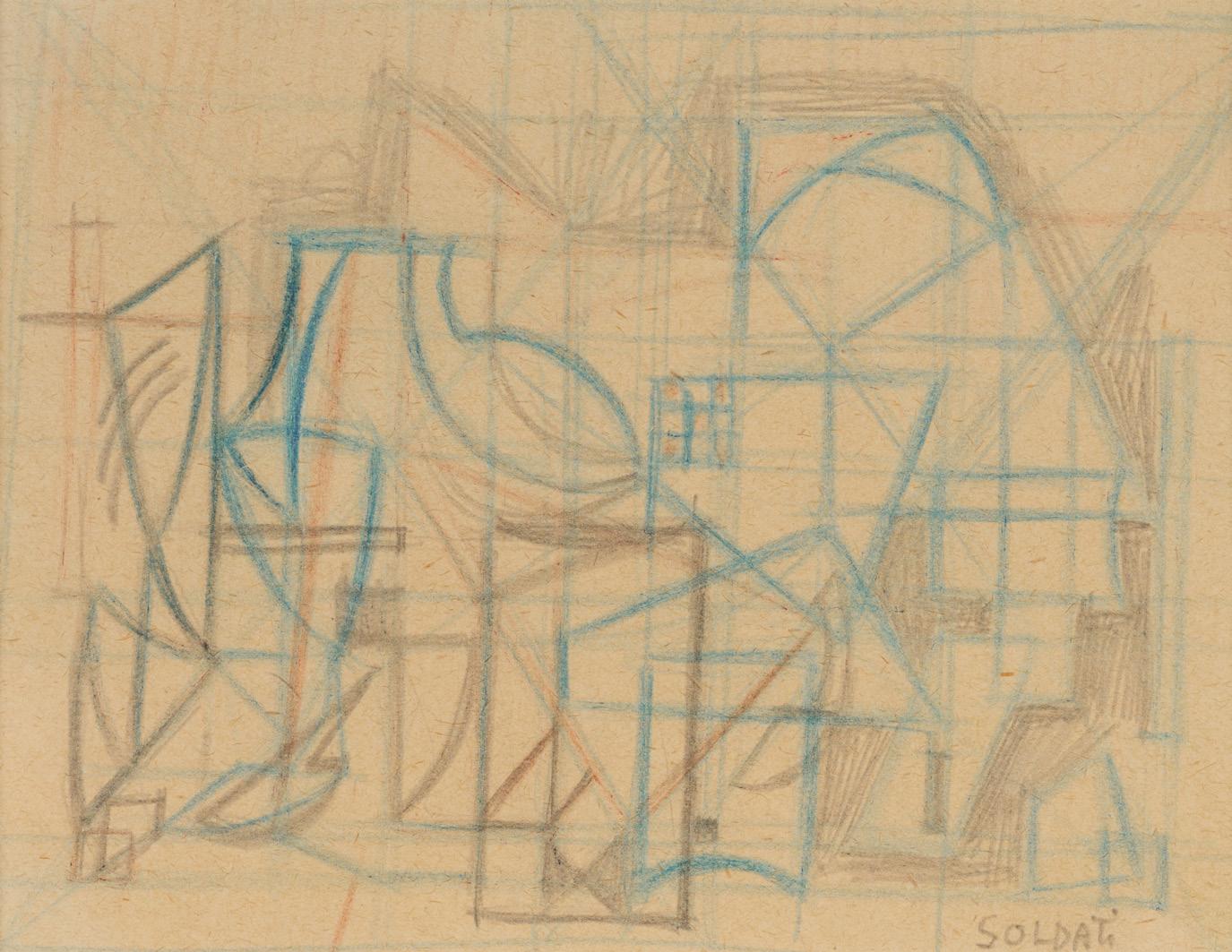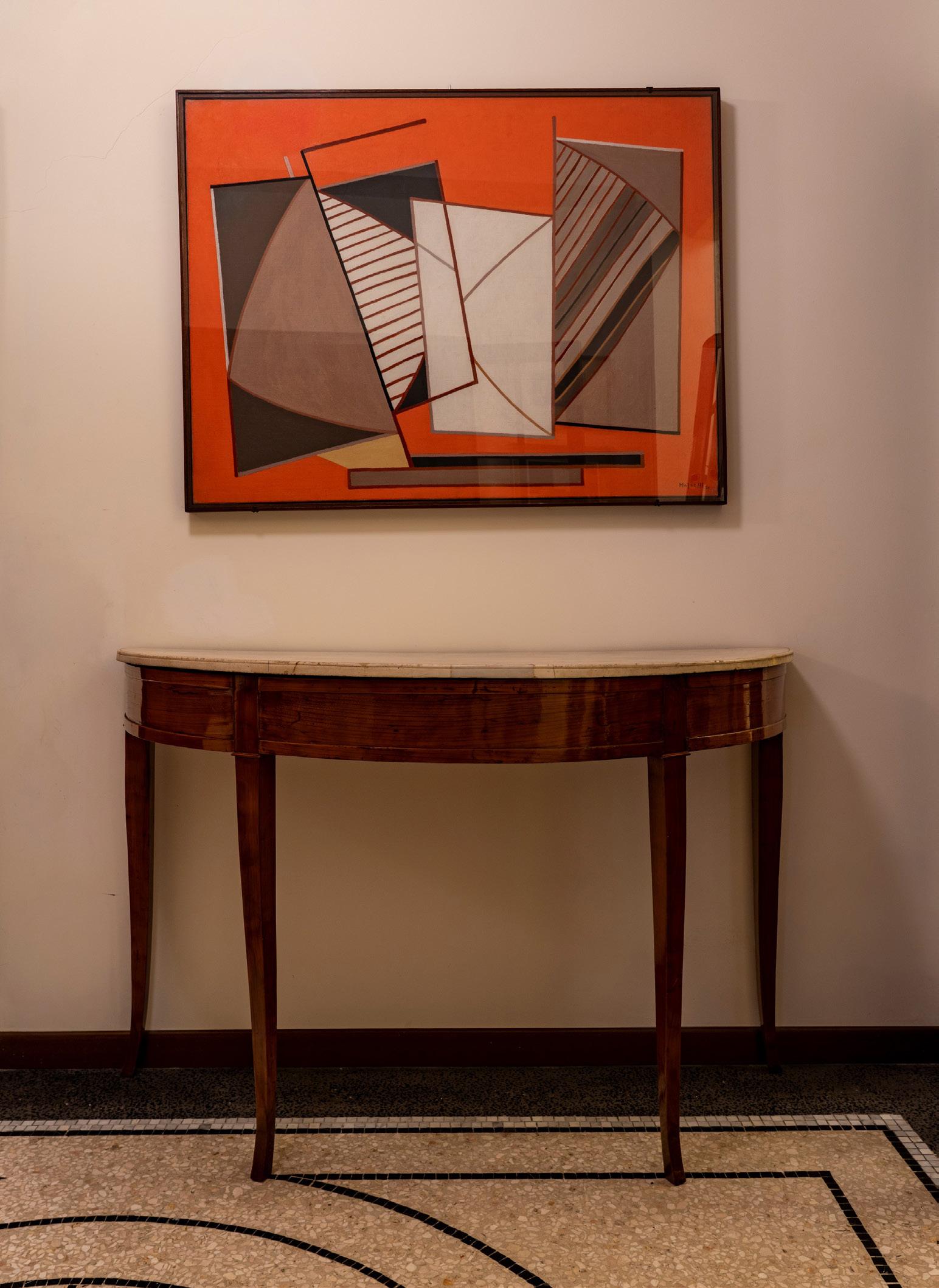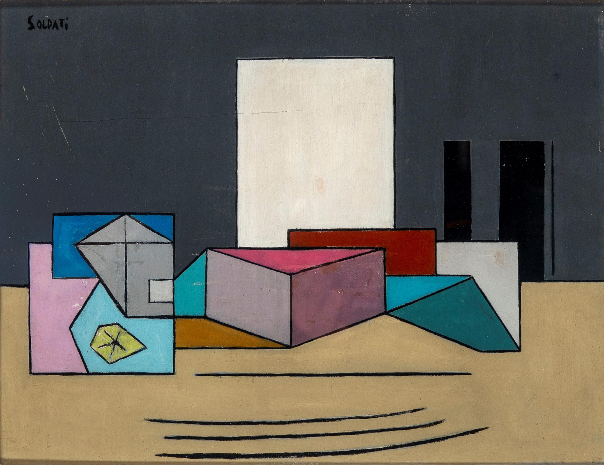 Nel frattempo, a Milano le opere cominciavano ad affollare le pareti e tutte le superfici orizzontali, fino a invadere persino la sala da bagno. I quadri geometrici appesi ai muri ricordavano al Professore le mirabolanti opere ingegneristiche che aveva visto progettare – ponti, dighe, bacini di contenimento – suscitandogli uno spazio mentale in cui triangoli, archi, ellissi e rettangoli si confrontavano in un equilibrio calibrato e sempre vibrante, portando armonia nell’intimo del suo abitare. È in questo contesto che la collezione si arricchisce di una prima composizione di Atanasio Soldati, dove diverse superfici piane strutturate in rettangoli e quadrati, costruiscono un ordine modulare, con una vibrazione tonale quasi musicale. È un’opera chiave, del primo astrattismo italiano, che anticipa il concetto di “astrazione poetica” dove il linguaggio razionale è innervato di sensibilità.