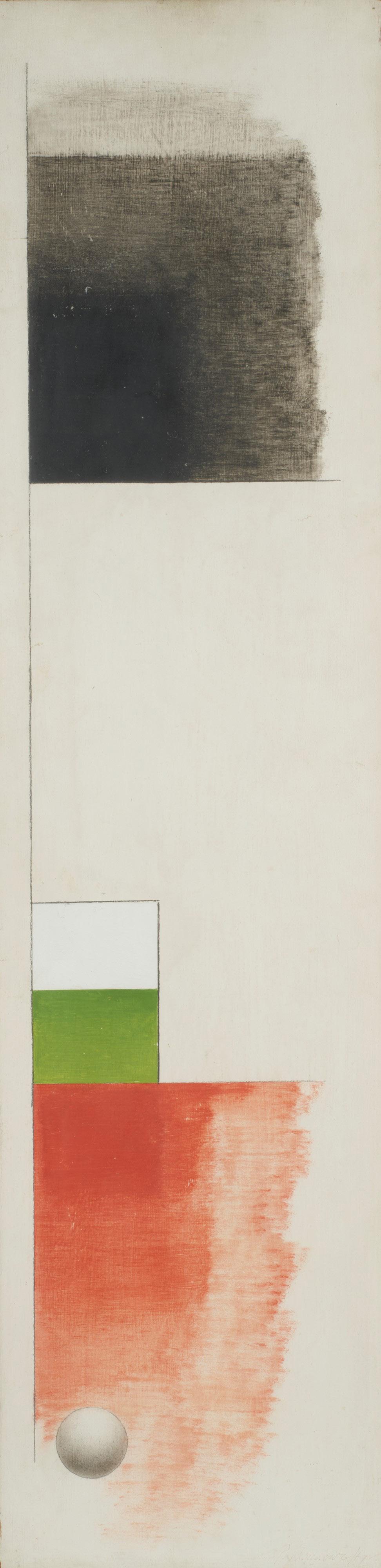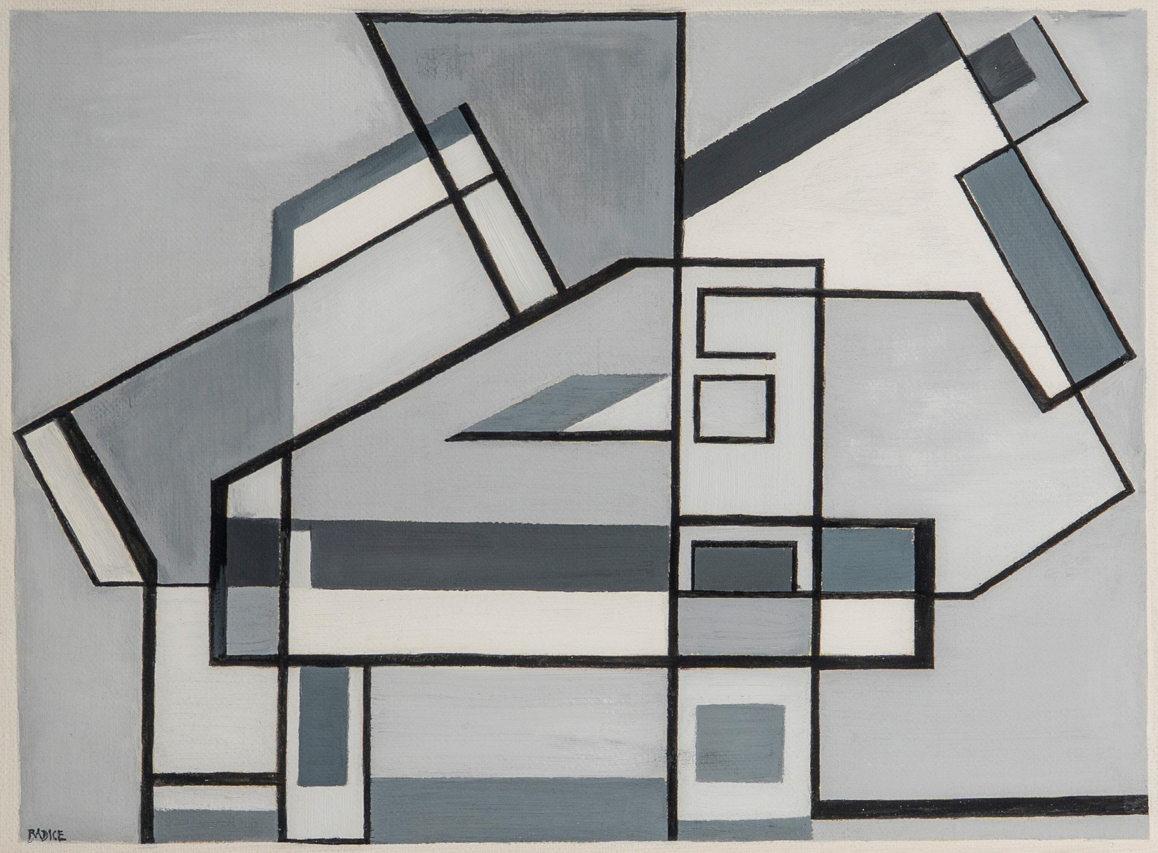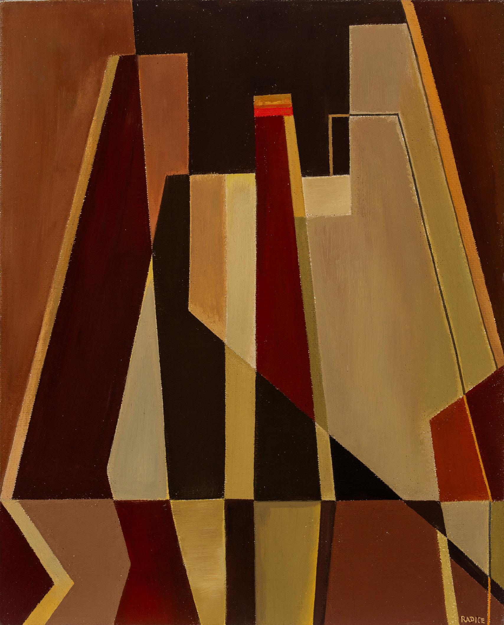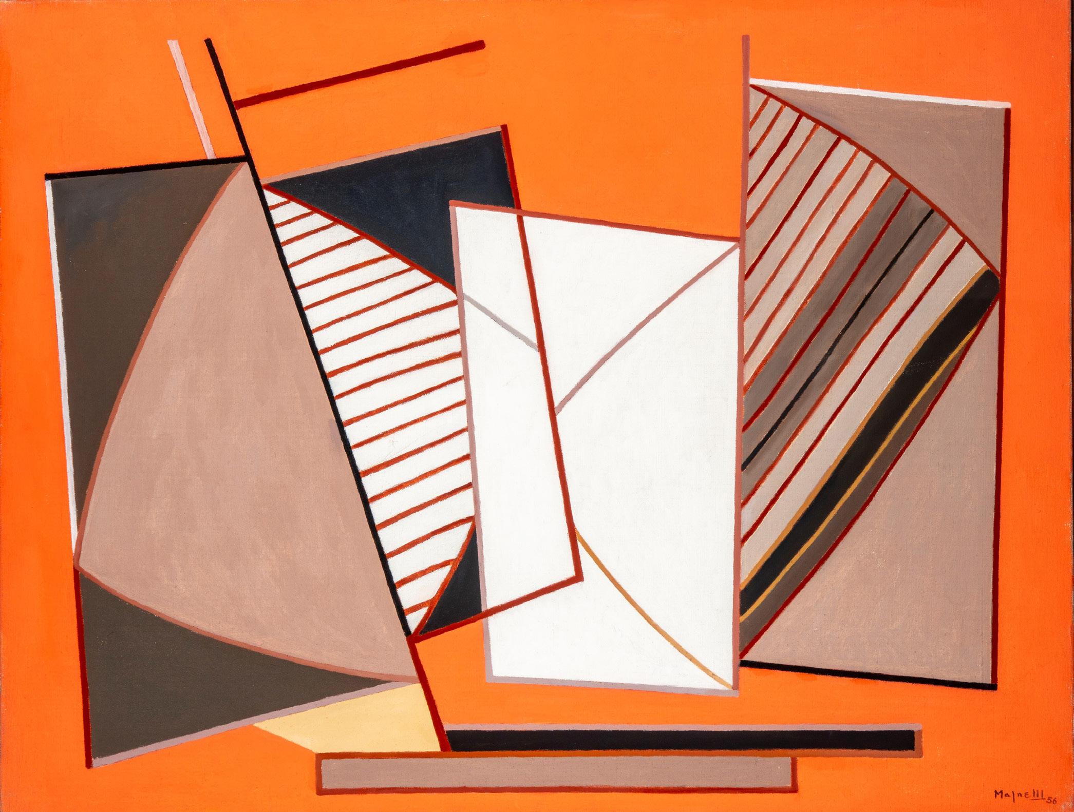 Nel frattempo, a Milano le opere cominciavano ad affollare le pareti e tutte le superfici orizzontali, fino a invadere persino la sala da bagno. I quadri geometrici appesi ai muri ricordavano al Professore le mirabolanti opere ingegneristiche che aveva visto progettare – ponti, dighe, bacini di contenimento – suscitandogli uno spazio mentale in cui triangoli, archi, ellissi e rettangoli si confrontavano in un equilibrio calibrato e sempre vibrante, portando armonia nell’intimo del suo abitare. È in questo contesto che la collezione si arricchisce di una prima composizione di Atanasio Soldati, dove diverse superfici piane strutturate in rettangoli e quadrati, costruiscono un ordine modulare, con una vibrazione tonale quasi musicale. È un’opera chiave, del primo astrattismo italiano, che anticipa il concetto di “astrazione poetica” dove il linguaggio razionale è innervato di sensibilità.