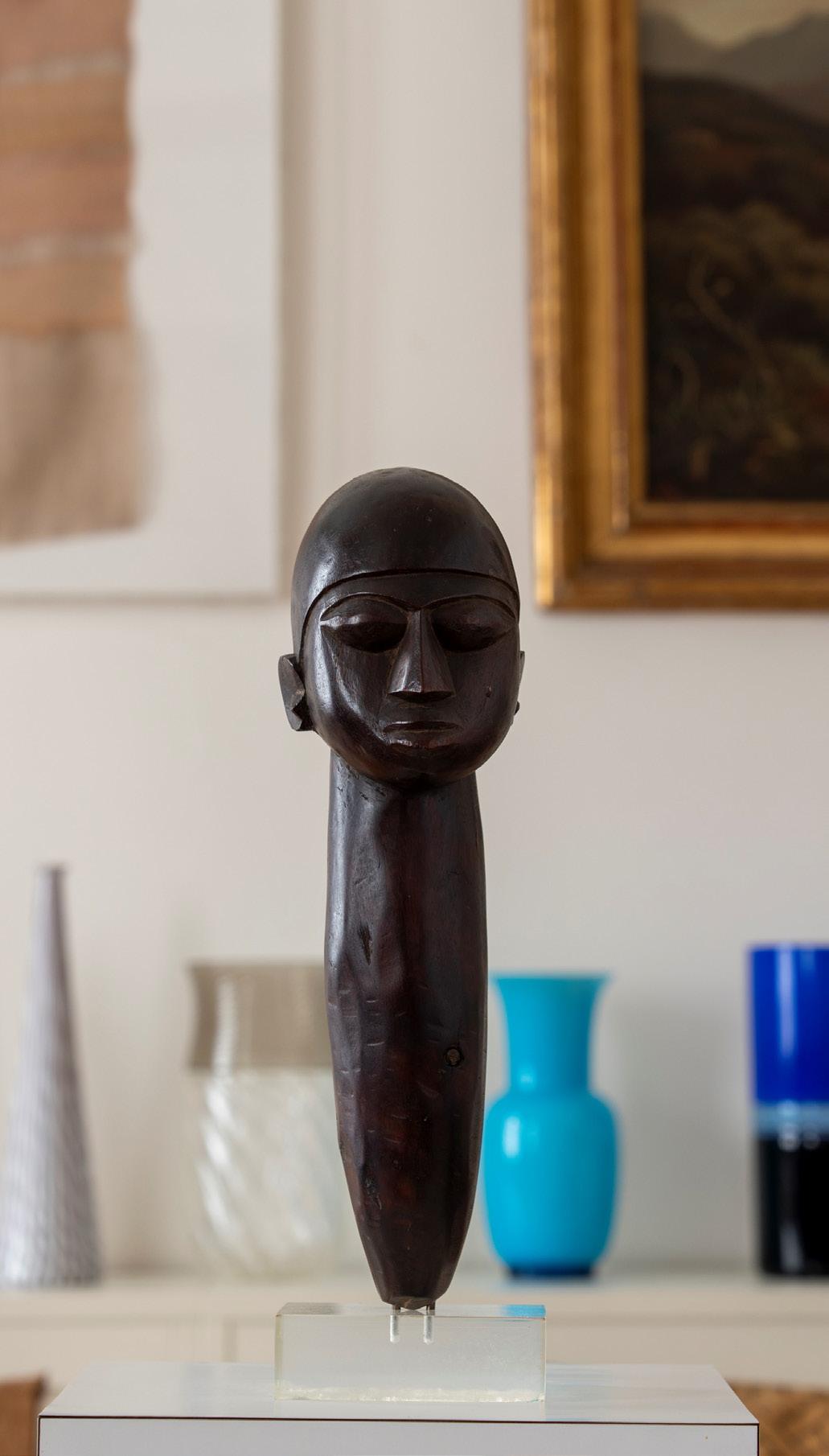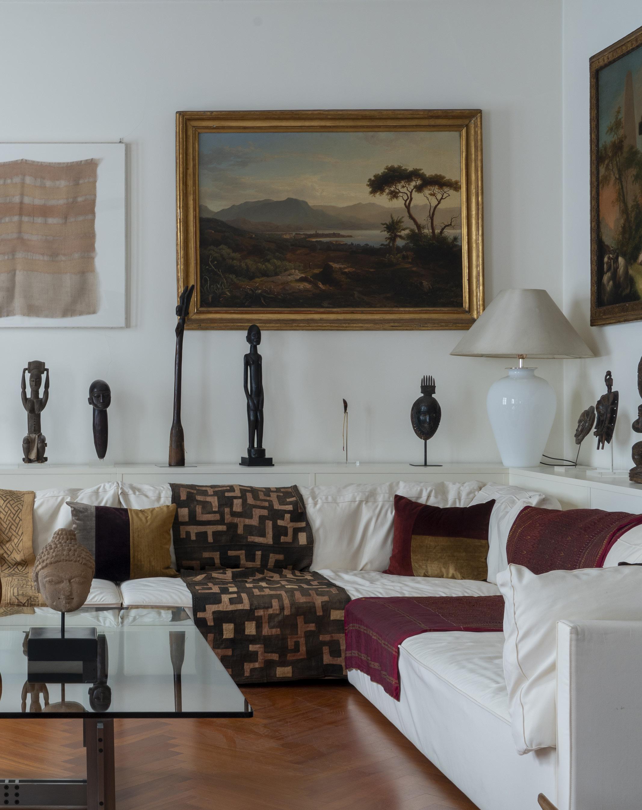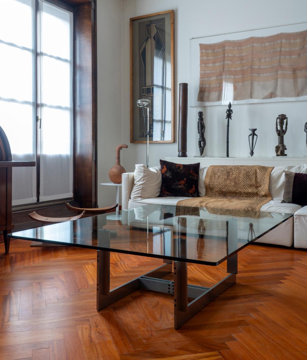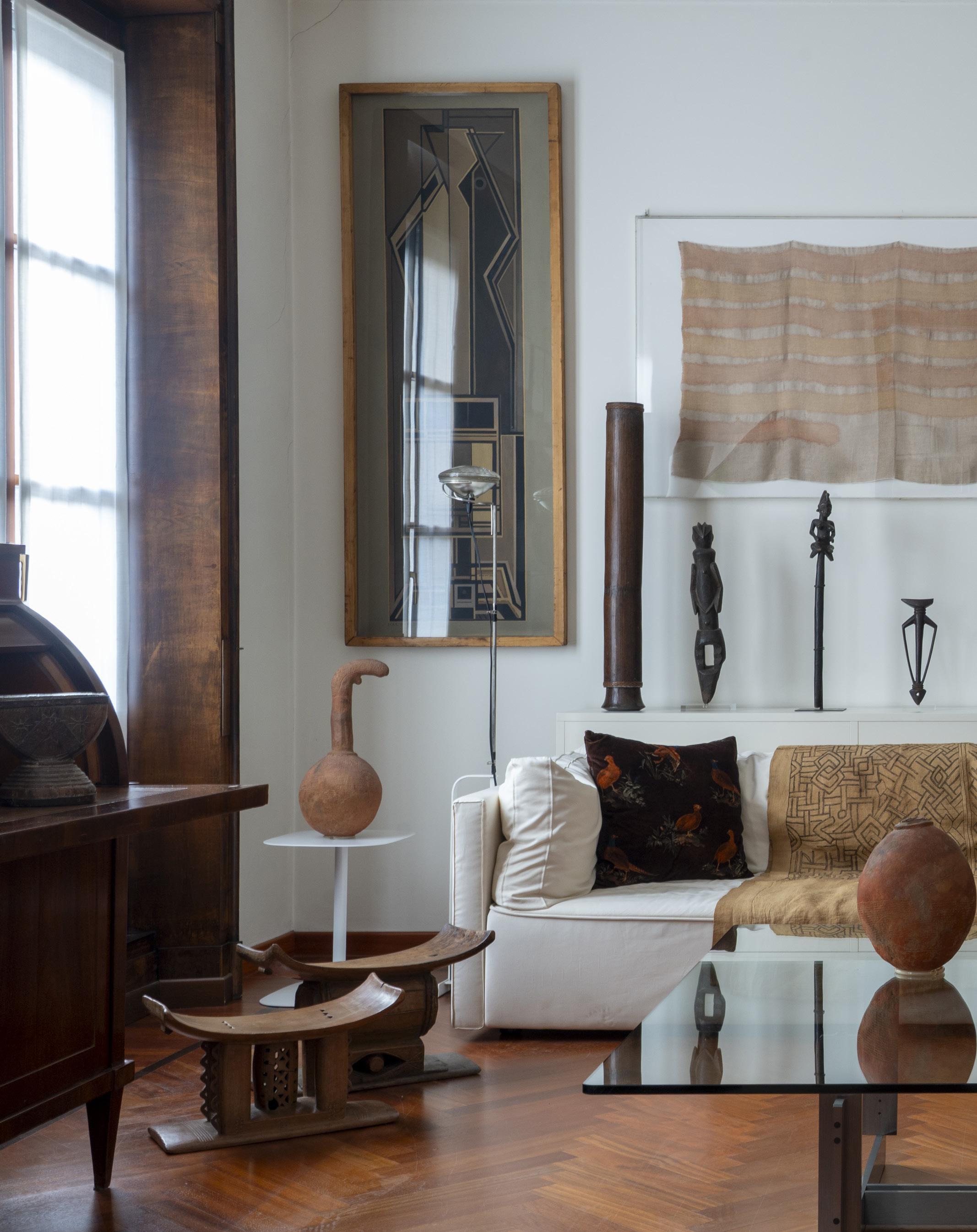 Le sue case raccontano questa postura esistenziale meglio di qualsiasi cronologia. Sono architetture interiori, mappe di un pensiero che si è sedimentato negli anni. Entrare in questi spazi significa attraversare una geografia privata fatta di equilibri silenziosi, di accostamenti inattesi, di presenze scelte a una a una nel corso dei decenni. Qui l’arte africana dialoga con il design, la pittura astratta del Novecento convive con arredi d’epoca rigorosi, le sculture si dispongono come sentinelle domestiche accanto a tavoli e finestre. Nulla appare esibito: tutto è vissuto.