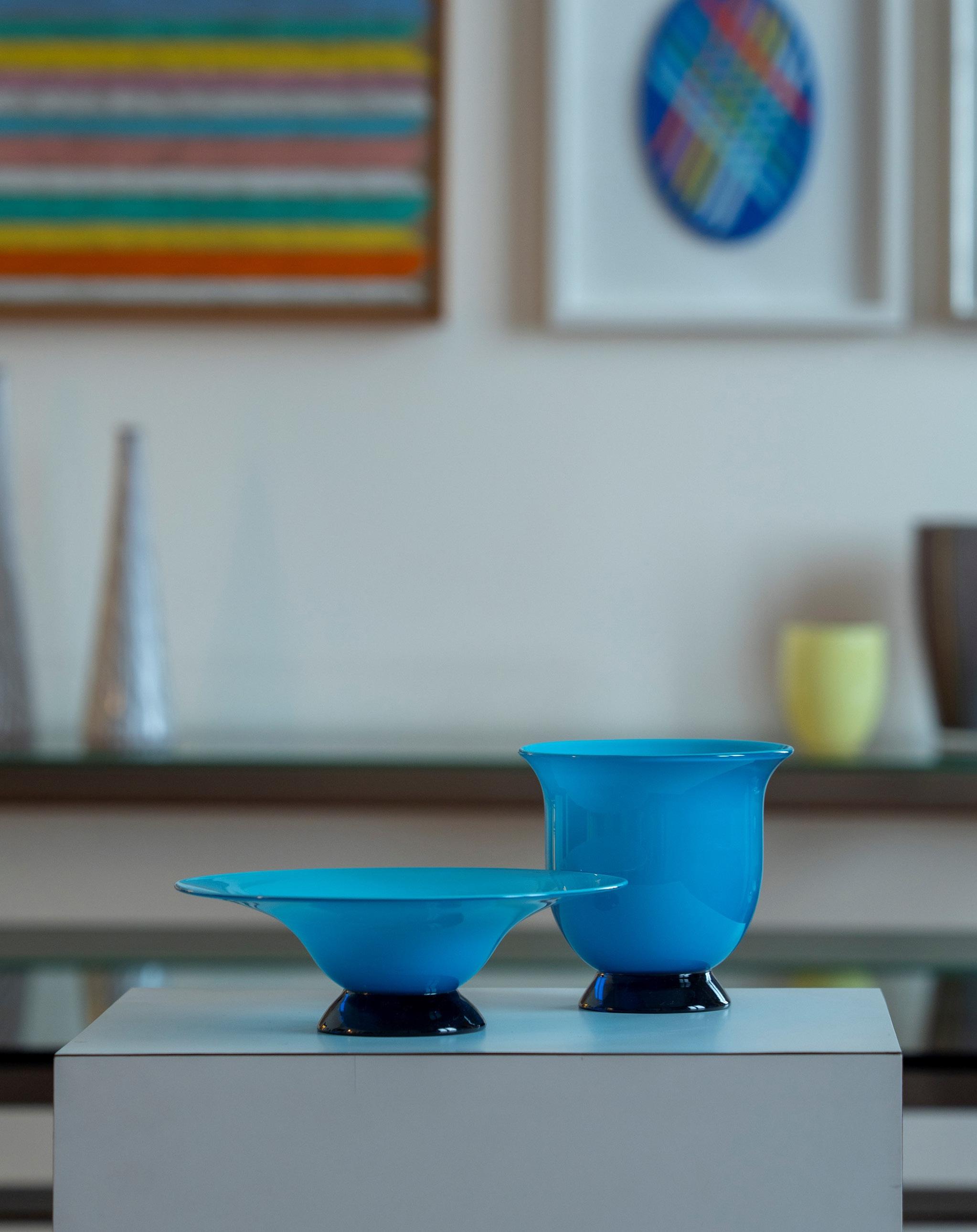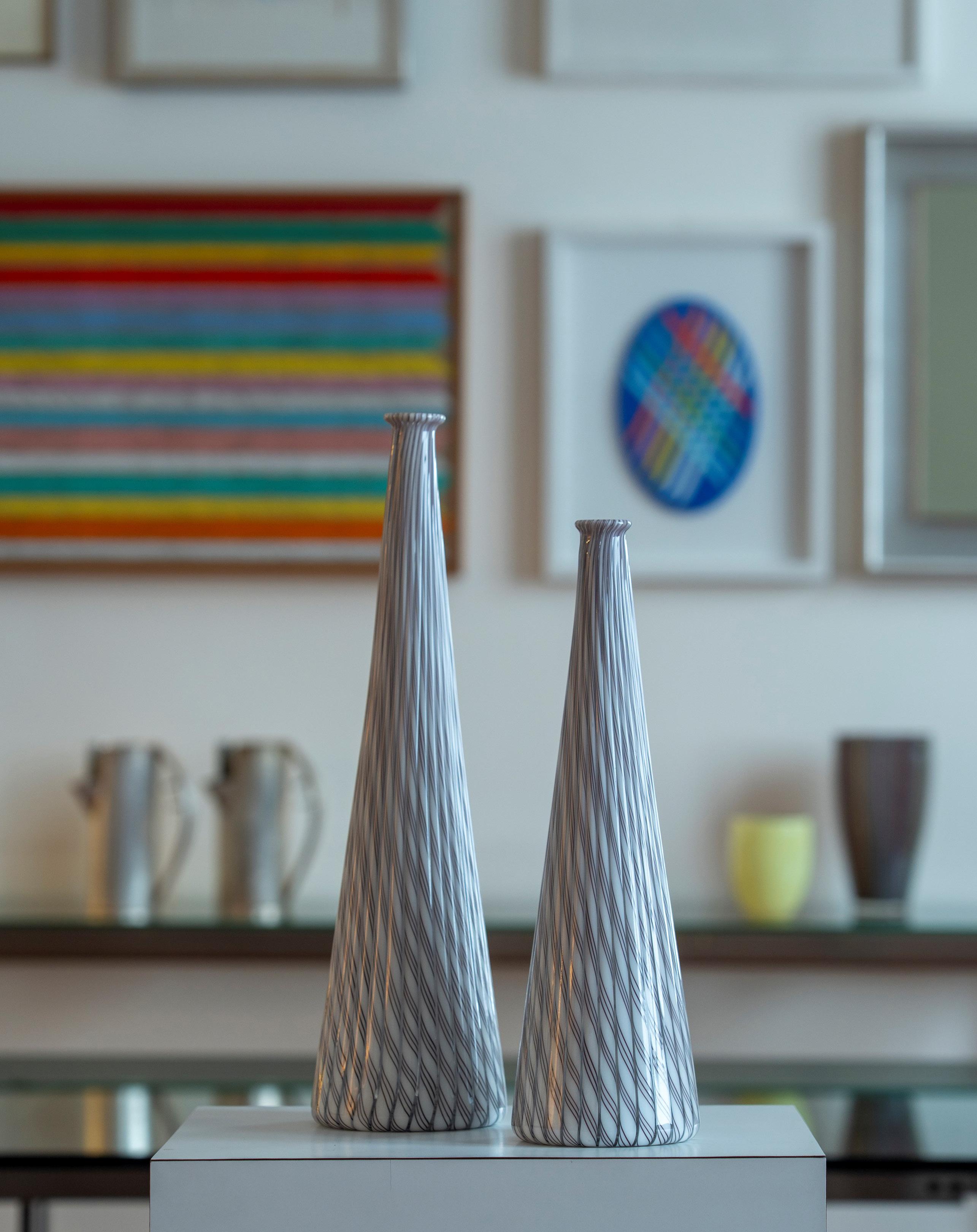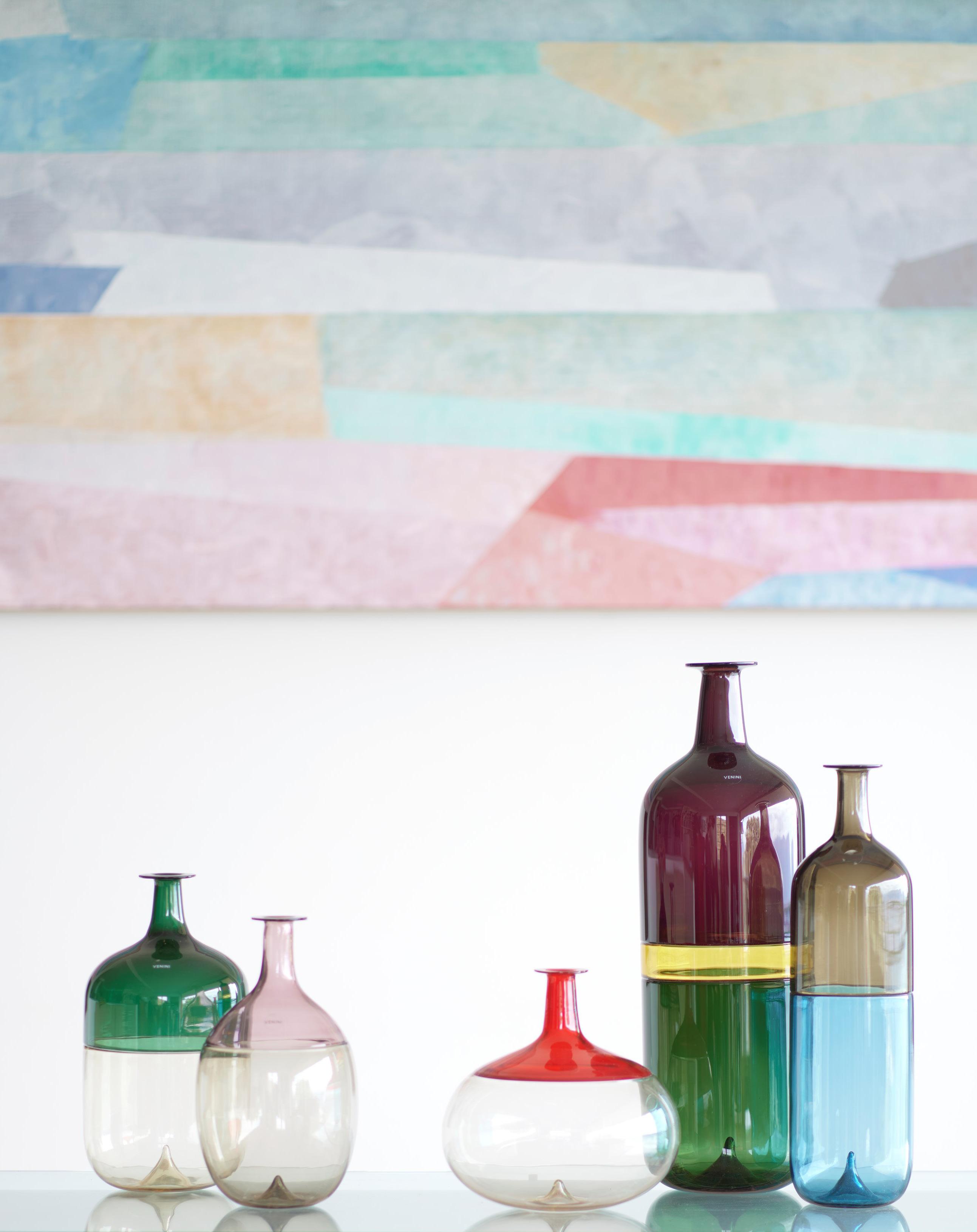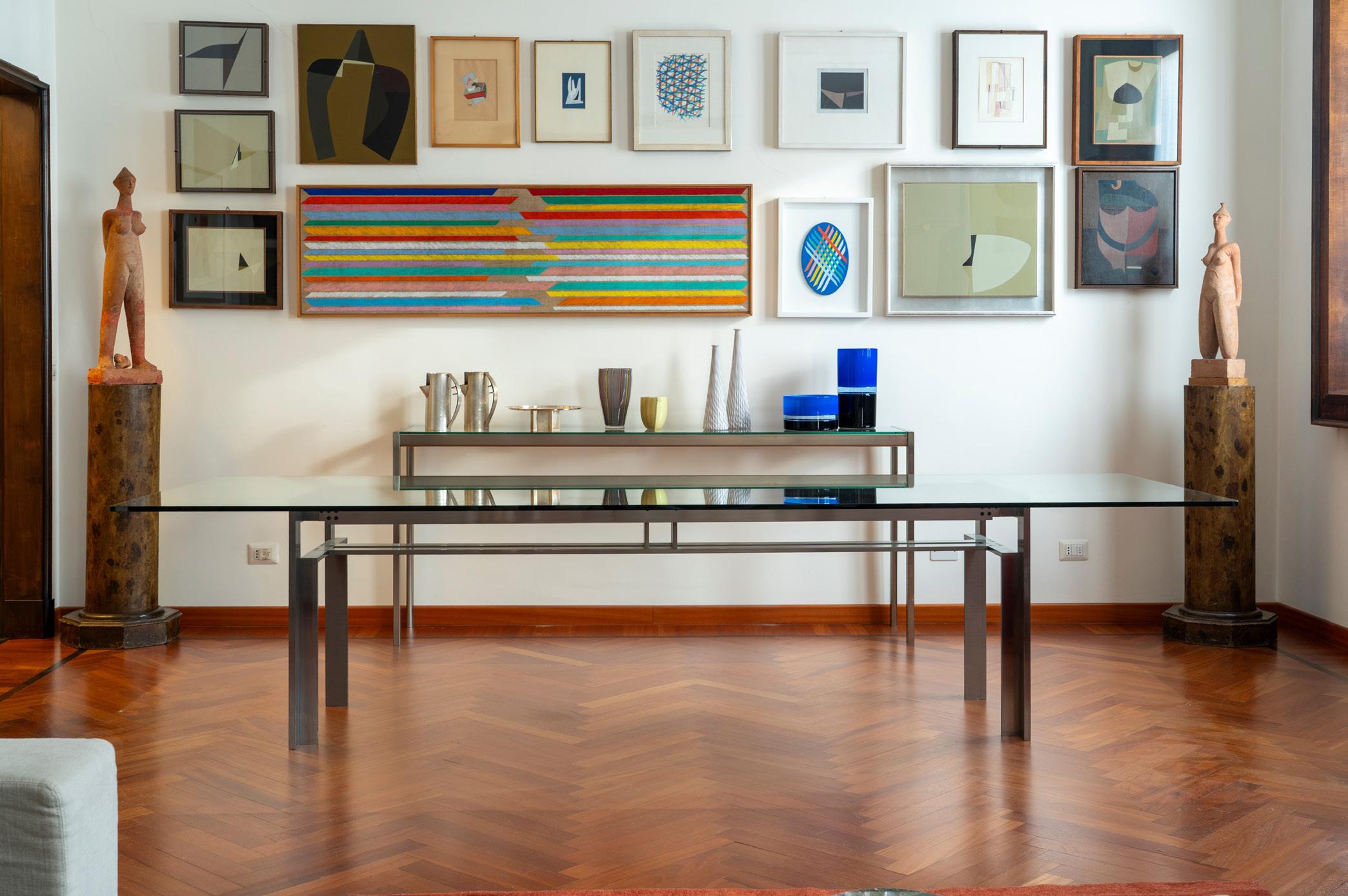 curate, con tavole imbandite e oggetti scelti con la stessa attenzione riservata alle opere. Particolare menzione meritano le cinque bottiglie della serie Bolle di Tapio Wirkkala per Venini, appoggiate sui tavolini da caffè in cristallo per esaltarne la sottile trasparenza e le sfumature – dall’ambra al verde bottiglia, dall’azzurro al rosa fumé. Gli amati servizi di piatti Richard Ginori e le tovaglie in lino dai colori accesi rimbalzavano e amplificavano le cromie geometriche delle ampie tele di Vittorio Matino, attraversate da velature parallele. Ne emergeva un’atmosfera di armonia misurata, in cui il piacere evidente di far stare bene chi entrava si faceva gesto concreto, quotidiano.